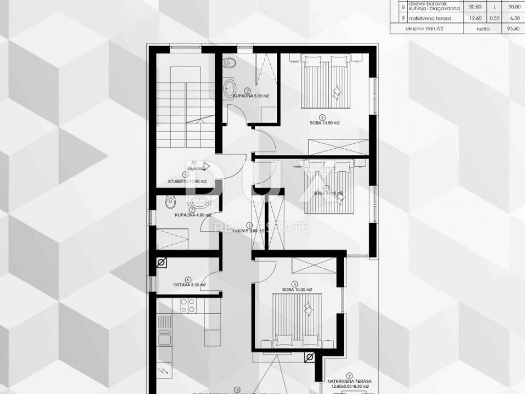 We proudly present the project of an exclusive modern building located in one of the most sought-after locations on this part of the coast of the Istrian peninsula, the unmissable Pješčana Uvala. Only 300m from the apartment there is a beautiful beach, as well as numerous other amenities needed for a safe and peaceful everyday stay. It is a modern building consisting of a total of three floors and three residential units, each of which is on its own floor. It is a new building of top quality worthy of your attention. The location where the building is located provides its future owners with a unique stay, as well as representing a safe investment with an almost guaranteed return on investment. Head with us towards this opportunity, and maybe right here, the search for your dream property will find a happy ending. DESCRIPTION OF THE APARTMENT: We present an apartment located on the 1st floor of a new building, which consists of a total of 101.80m2 of space, of which 95.40m2 belongs to the apartment, while the rest of the square footage refers to 2 private parking spaces and a storage room on the ground floor of the building. Within its 95.40 m2 of living space, this apartment consists of an entrance hall with a space for a wardrobe, which also divides the apartment into a part intended for daily life and a sleeping part of the apartment. The living area of the apartment is designed according to the "open space" system of space without partition walls, in which there is a spacious kitchen with enough space for a kitchen island, a spacious dining room for the whole family, and a larger living room that is ideal for socializing and relaxing after an active day. Access to the covered terrace of 12.60 m2 (reduced area 6.30 m2) extends from the living room. The apartment additionally consists of a storage room at the back of the kitchen, then a guest bathroom, and 3 comfortable bedrooms, one of which is the master bedroom with its own bathroom, while the other two bedrooms have access to the same terrace as the living room. ADDITIONAL INFORMATION: * The planned deadline for the completion of all works and the possibility of moving in is before the summer season of 2025. * Each apartment will be equipped with air conditioning and underfloor heating. * High-quality Styrodur insulation of 10 cm is placed on the facade of the building. * High-quality two-layer aluminum joinery is installed. * The bathroom of the apartment will be fully furnished. * Buyers currently have the opportunity to influence the final stage of decorating the apartment, such as choosing the type of floor coverings, colors and the like. * Apartments are sold turnkey, without furniture. * The purchase of an apartment is carried out in percentage stages. DESCRIPTION OF THE LOCATION: This is a highly valuable location, which provides its visitors with a unique stay. Pješčana Uvala contains everything you need for a safe and peaceful life, so just a 1-minute walk from the apartment, there is the first store, numerous restaurants, cafes and the like. The aforementioned well-maintained beach and promenades are only a 3-minute walk from the apartment, and in addition to the crystal clear sea, they offer their visitors numerous other facilities, such as beach bars, restaurants by the sea, beach volleyball courts, soccer fields, basketball courts, and the like. In addition to all the above, Pješčana Uvala is also known for being located next to one of the most respected marinas on the Istrian peninsula, which offers sea and boat lovers a professional boat care service, as well as an annual mooring. Next to the sandy cove is the Soline Forest Park, which is an ideal destination for a getaway to nature with the family, as well as a location for a perfect walk in the fresh air. In short, it is a location that is ideal for all those who are looking for a family property that will provide them with a peaceful stay, without large crowds and noise, while still being within reach of their necessary amenities. As well as representing an ideal location for all those who are looking for rare and valuable real estate, which almost ensures a return on investment in the form of tourism. For any additional questions, necessary information, as well as a tour of the location and an overview of the project documentation, feel free to contact us at any time! Dear clients, the agency commission is charged in accordance with the General Business Conditions www.dux-nekretnine.hr/opci-uvjeti-poslovanja