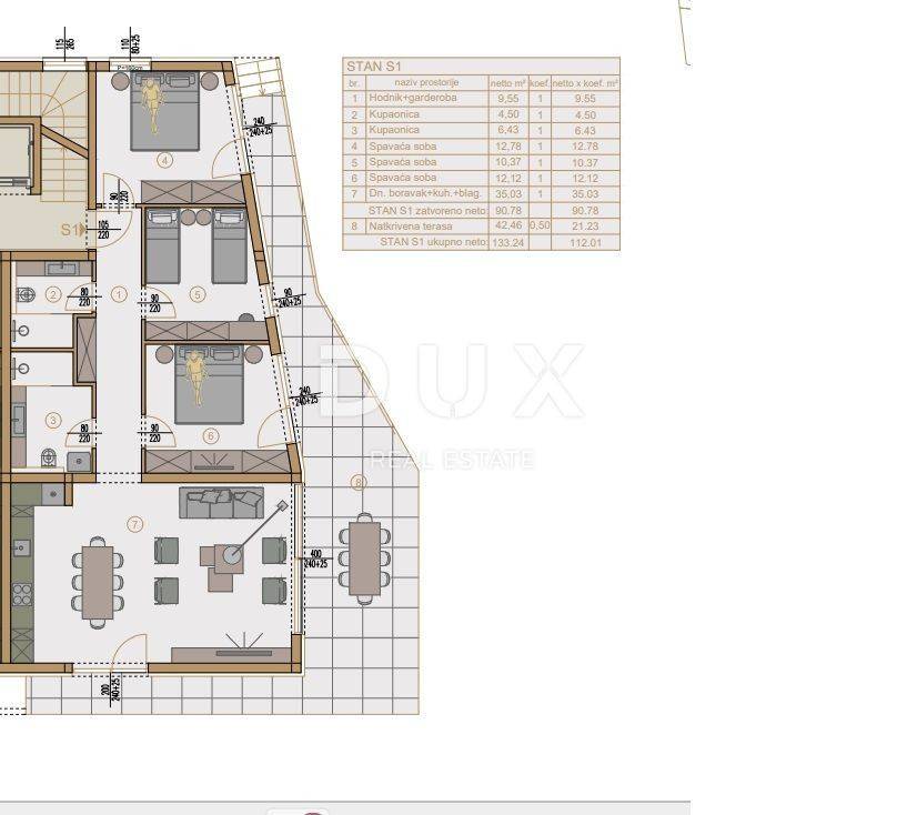 A luxury apartment in a new project is for sale in one of the most attractive locations. It is an apartment that offers 119.12 m2 of living space and is located on the first floor. It consists of a hallway with a wardrobe, a large living room with a kitchen and a dining room with access to a covered terrace, 3 bedrooms and two bathrooms. LOCATION: - the project is located 400 meters as the crow flies from the first beach - quiet environment with attractive family houses - walking distance from shops, beach bars, restaurants APARTMENT EQUIPMENT (BUILDING) - within the building there are parking garage spaces and outdoor parking lots that they buy with an additional charge at the displayed price - the building also offers an elevator, which makes this project even more attractive - underfloor heating - air conditioning - parquet in the rooms - electric shutters with mosquito nets Start of work 10/24, expected end of work 12/25. The seller is a legal entity. We are available for all other questions.