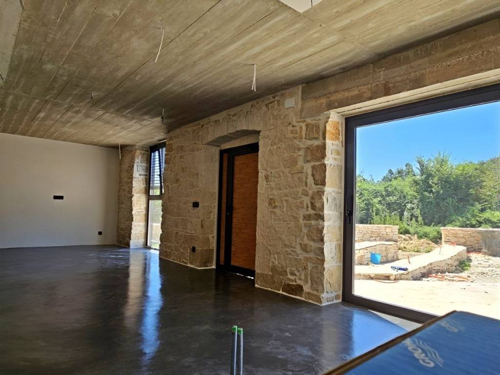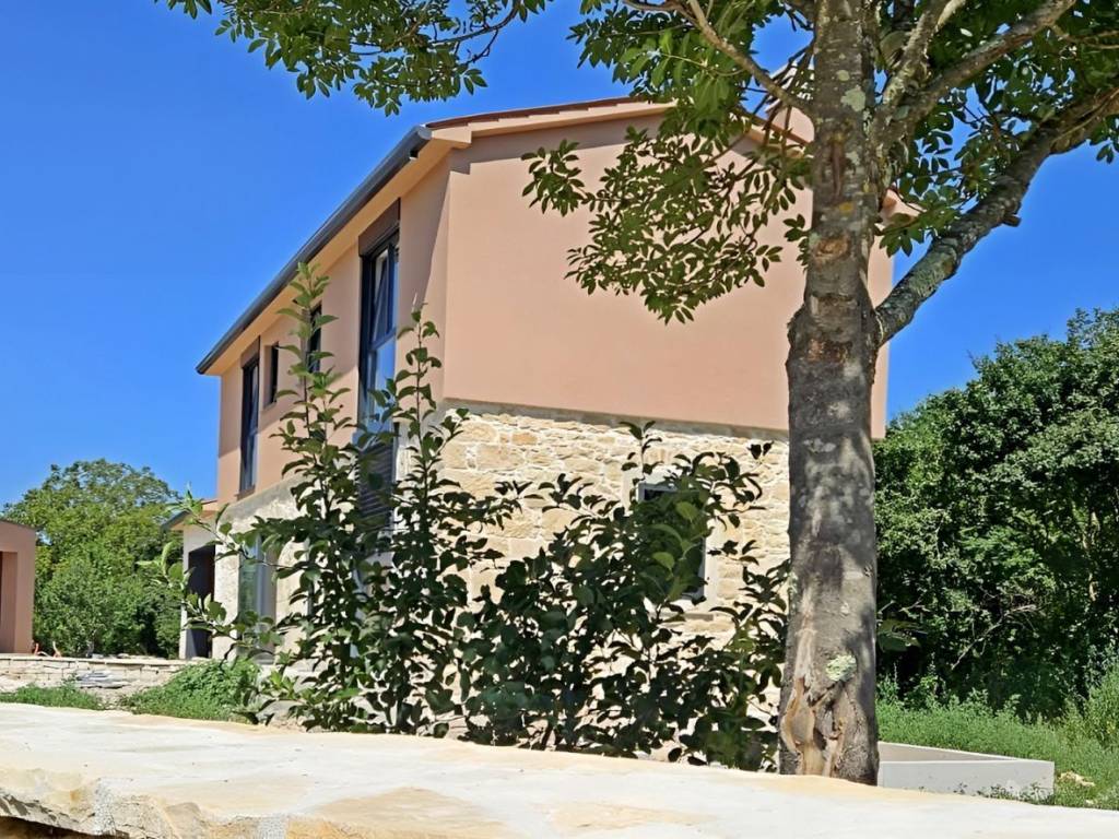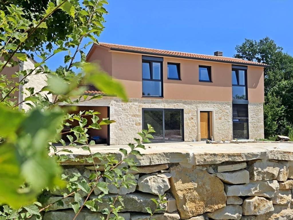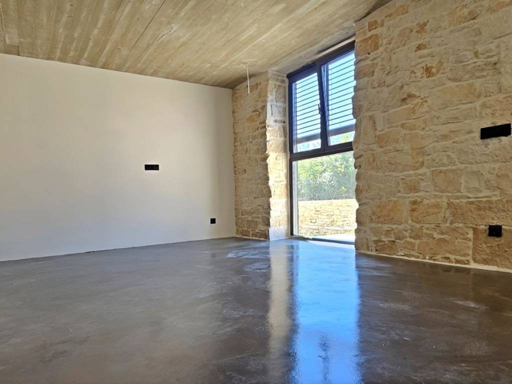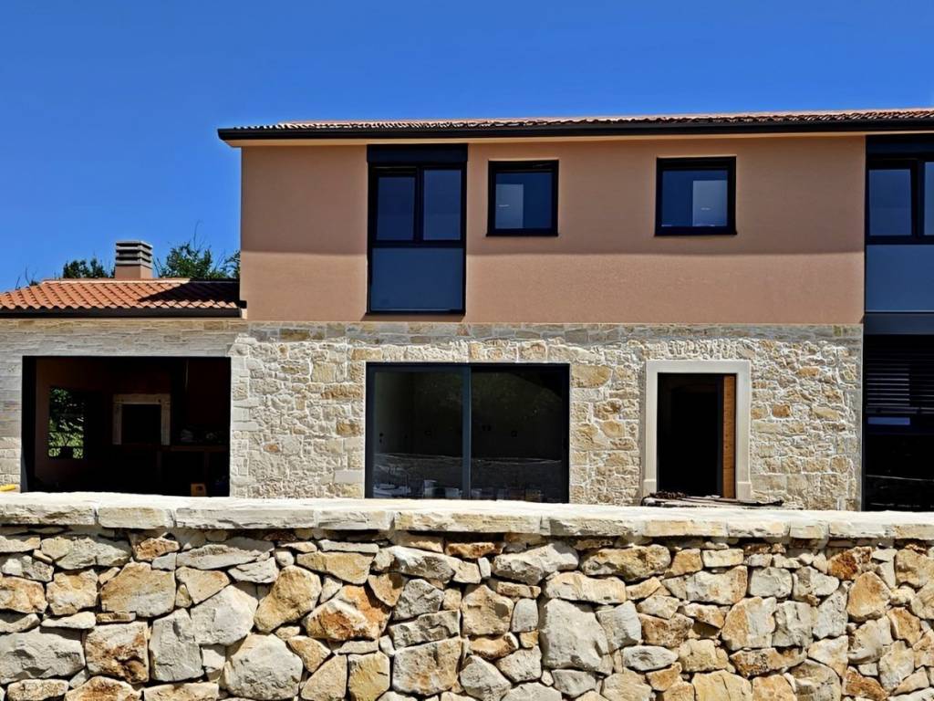 On the southeastern coast of Istria, where green hills meet the sea, where nature and heritage meet, there are two small towns with different but mutually complementary characters - Labin and Rabac. The picturesque town of Labin rises on a hill 320 m high, only four kilometers from the white pebble beaches in Rabac. Intertwined with rich history and mining that marked this region, Labin, which was declared an independent republic for a short time, is today a fascinating city of contradictions; old and new, history and present, tourism and art. Surrounded by greenery in a quiet neighborhood near the town of Labin, an impeccable stone house with a swimming pool is for sale. In addition to the microlocation, the property is characterized by the quality of the construction, which guarantees long-term satisfaction and quality of housing. Respecting the traditional autochthonous values and the architecture of the Istrian heritage, a true little paradise, i.e. a hedonistic corner with a functional interior and exterior, was created from an old dilapidated stone Istrian house. During the reconstruction, Istrian stone and new technologies were used. All surfaces in the house and the pool are coated with Epoxy microcement, and 10 cm thick stone wool was used for insulation. With its gentle architecture, the house does not disturb the environment, but creates a synergy of the natural environment, traditional Istrian architecture and modern design. Tradition is symbolized by stone and a gabled roof, and a contemporary expression by a large-format glass wall. It consists of a basement, ground floor and first floor. The basement of 28 m is used as a storage room. The ground floor with a net area of 45.07 m consists of an open concept space that unites the kitchen, dining room and living room. The floor plan of the ground floor is complemented by a storage room and a guest toilet. The floor with a net area of 45.17 m consists of an entrance hall and two bedrooms with their own bathrooms. Next to the house there is a covered summer kitchen with an area of 14.90 m and next to the house an auxiliary building with an area of 14 m, which is designed as a wellness corner with a hot tub and sauna and a swimming pool with an area of 26 m with a sunbathing area. The spacious garden is partially fenced with a dry stone wall. This perfectly integrated property is an exceptional opportunity for a comfortable family life as well as an investment investment in the tourist rental business. The stated price refers to the turnkey phase (unfurnished and unfurnished house) without landscaped yard. Dear clients, the agency commission is charged in accordance with the General Business Conditions: www.dux-nekretnine.hr/opci-uvjeti-poslovanja