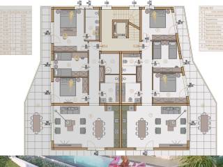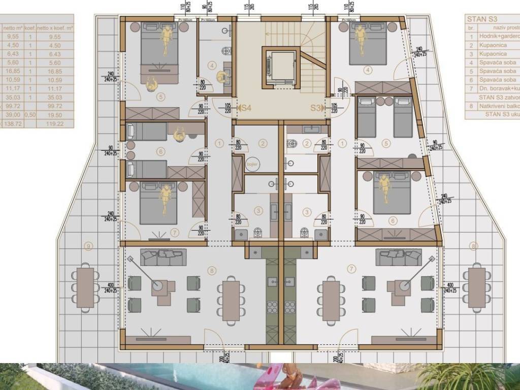 A luxury apartment in a new project is for sale in one of the most attractive locations. It is an apartment that offers 119.12 m2 of living space and is located on the first floor. It consists of a hallway with a wardrobe, a large living room with a kitchen and a dining room with access to a covered terrace, 3 bedrooms and two bathrooms. LOCATION: - the project is located 400 meters as the crow flies from the first beach - quiet environment with attractive family houses - walking distance from shops, beach bars, restaurants APARTMENT EQUIPMENT (BUILDING) - within the building there are parking garage spaces and outdoor parking lots that they buy with an additional charge at the displayed price - the building also offers an elevator, which makes this project even more attractive - underfloor heating - air conditioning - parquet in the rooms - electric shutters with mosquito nets Start of work 10/24, expected end of work 12/25. The seller is a legal entity. We are available for all other questions.