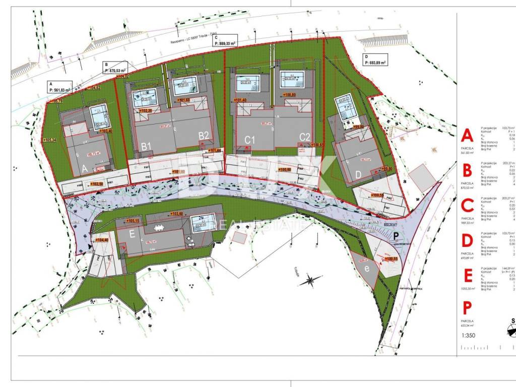 Prodaje se građevinsko zemljište s projektom površine 3946m2. Projekt je zamišljen kao resort od 5 stambenih cjelina, od kojih su dvije dvojnice, tako da ima ukupno 7 stambenih jedinica od kojih svaka ima svoj bazen.