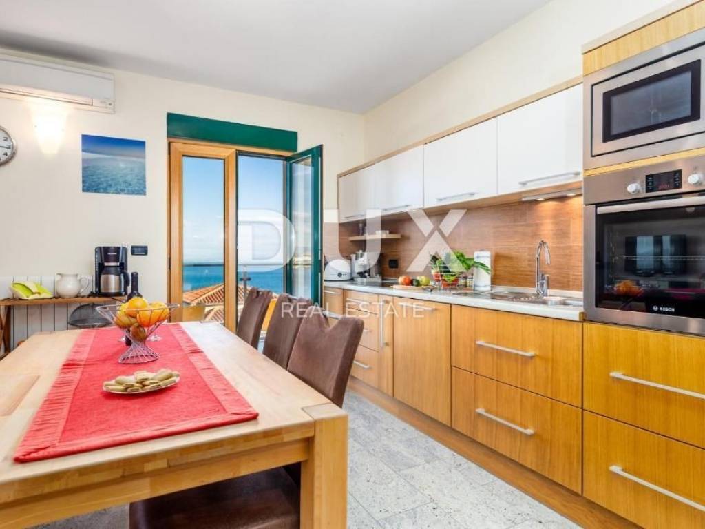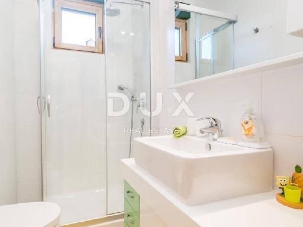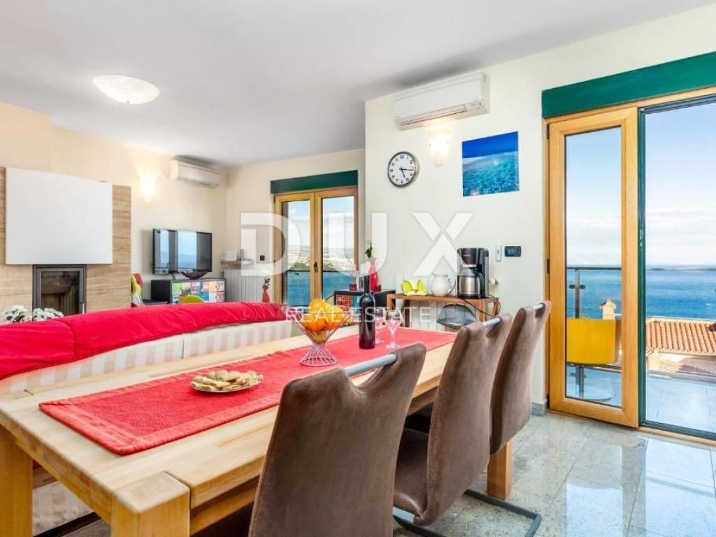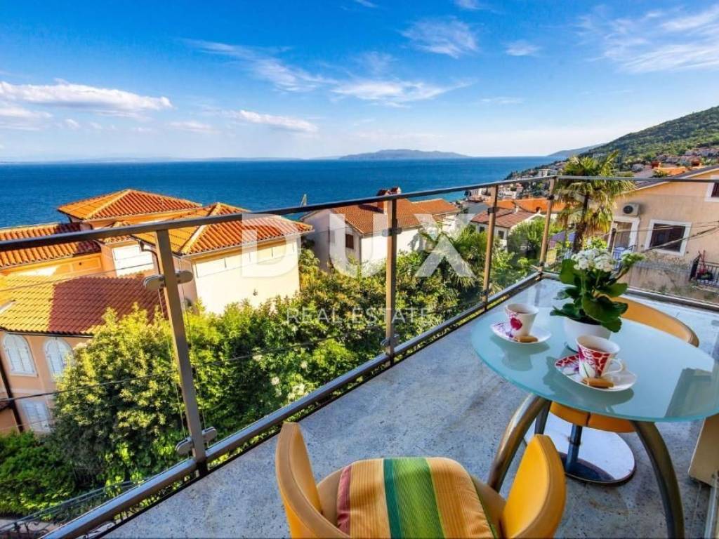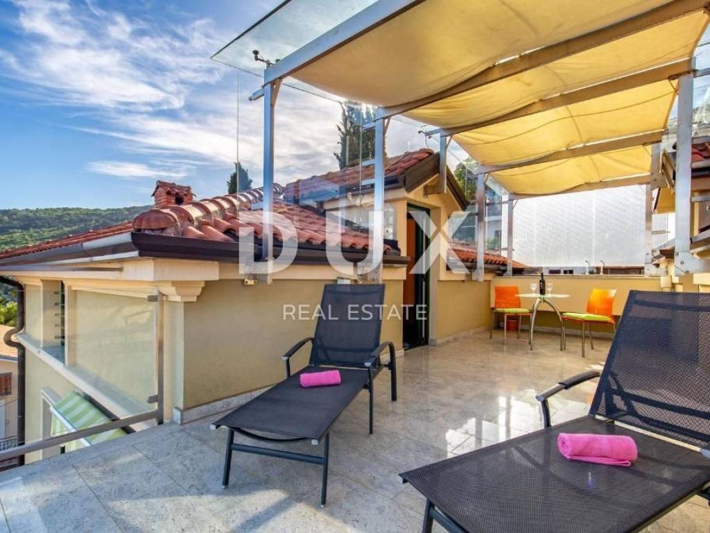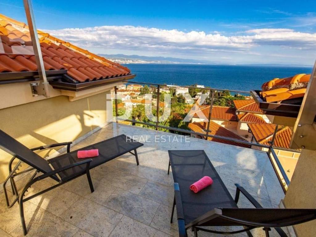 The villa was built in 2008 on a plot of 386 m2, of which 195 m2 is used for the parking lot, sunbathing area, barbecue, swimming pool, and terrace on the ground floor. It has beautiful glass balconies, a terrace with a pool and an outdoor fireplace, and a large fenced parking lot. The villa consists of 3 residential units, very modernly furnished and equipped: ground floor: apartment of 125 m2 - 3 bedrooms + living room ground floor and 1st floor: two-story apartment of 111 m2 - 3 bedrooms + living room 2nd floor and high attic: two-story apartment of 135 m2 - 3 bedrooms + bathroom The first apartment is on the ground floor and the entrance is on the side of the staircase. It extends over the entire ground floor and consists of an open space that combines a large living room, kitchen and dining room, 3 bedrooms, 3 bathrooms and a storage room. Each room is south-facing and has direct access to the swimming pool and sunbathing area. The second apartment is on two floors and the entrance is on the upper side from the yard. There are three rooms and three bathrooms on the first floor. All rooms are south-facing, one of which has a large balcony. The third apartment is also entered from the courtyard and the stairs rise to the floor where there is an open space area that unites the living room, kitchen and dining room, master bedroom with bathroom and a small storage room. There is an exit to a large balcony from the bedroom and living room. An internal staircase leads to the high attic, where there are two rooms with private bathrooms and a large, beautiful roof terrace with a phenomenal view of the sea. The heating is central with gas, and every room and living room has air conditioning. It is located in a quiet environment, just 2 minutes by car from the center of Opatija. This wonderful house is a fantastic opportunity for those who like to enjoy the enchanting view of the sea and be close to all facilities. Dear clients, the agency commission is charged in accordance with the General Business Conditions www.dux-nekretnine.hr/opci-uvjeti-poslovanja