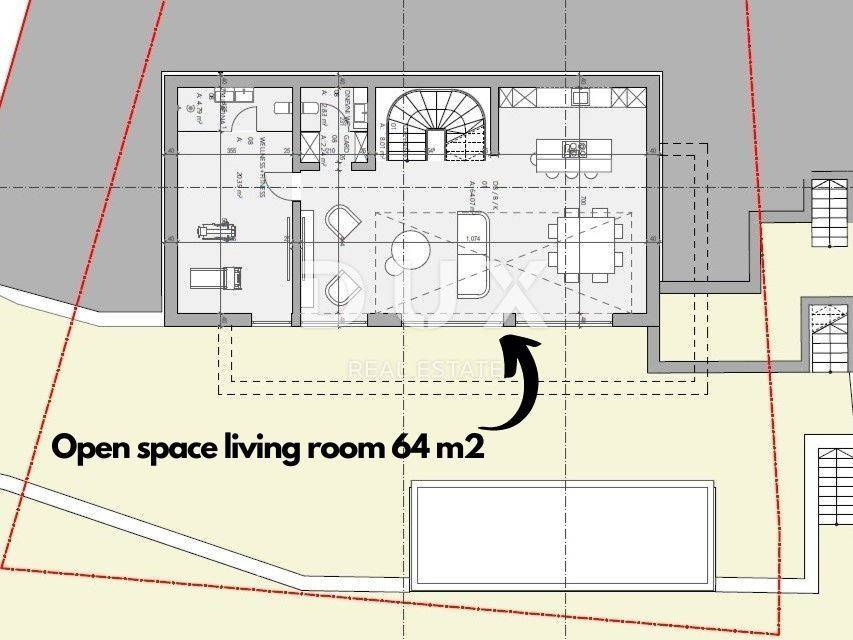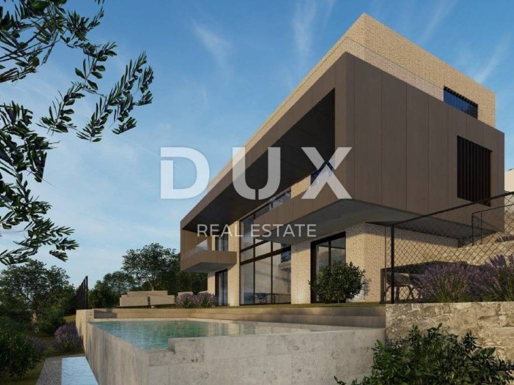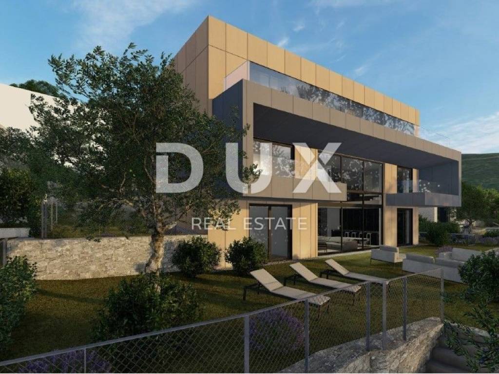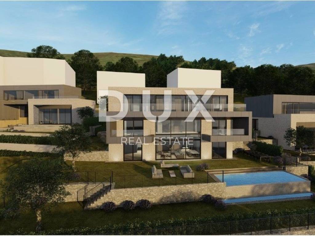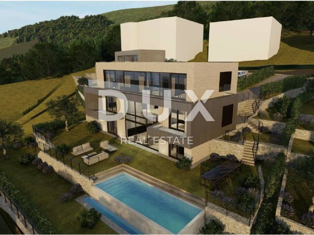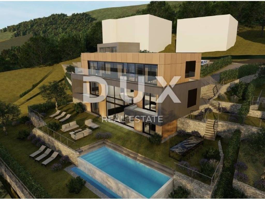 We present a villa above the very center of Opatija, just 470 meters from the sea, with a panoramic view of the sea, islands and mountains, with a beautiful large garden of 930 m2 and a swimming pool. It is a beautiful luxury villa on 3 floors, and consists of a spacious hallway, a beautiful and illuminated open space living room that communicates with the kitchen and dining room, from which a magnificent view of the sea can be seen through the glass walls. A large staircase leads to the 2nd floor with 3 luxurious bedrooms, each room is south-facing and has a beautiful view of the sea. It is important to point out that the master bedroom with en suite bathroom extends over the entire first floor and has a loggia of 20 m2. The special feature of this property is its quality construction and exceptional location near the center of Opatija, the Lungomare promenade, the Summer Stage and all the accompanying facilities. The villa will be built surrounded by lush greenery in a quiet cul-de-sac and will thus ensure privacy and comfort along with a wonderful experience of the Kvarner Bay. The villa is located just a 1-minute drive from the center of Opatija and Slatina beach, thus ensuring a perfect stay and life in the beauty of the Adriatic - Opatija. Dear clients, the agency commission is charged in accordance with the General Terms and Conditions. https://www.dux-nekretnine.hr/opci-uvjeti-poslovanja