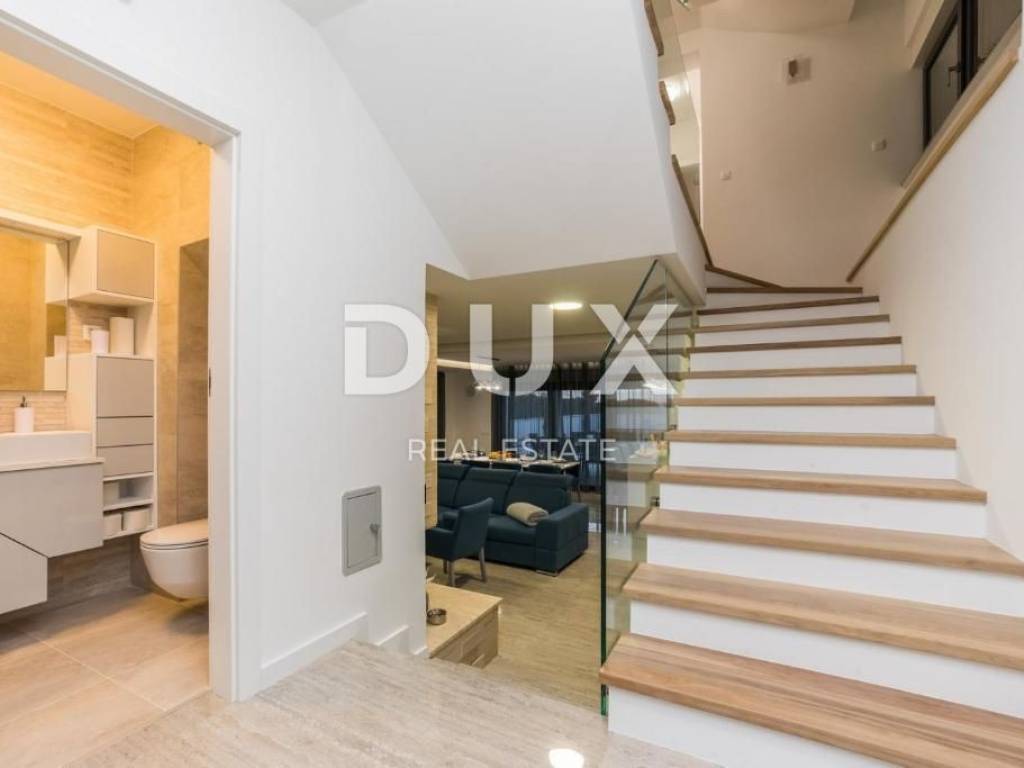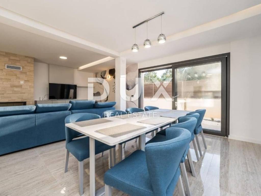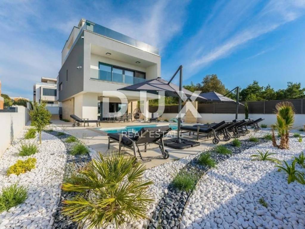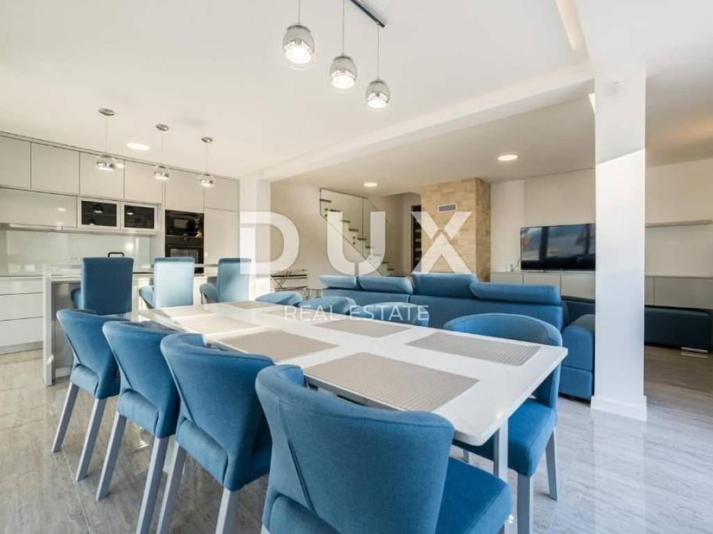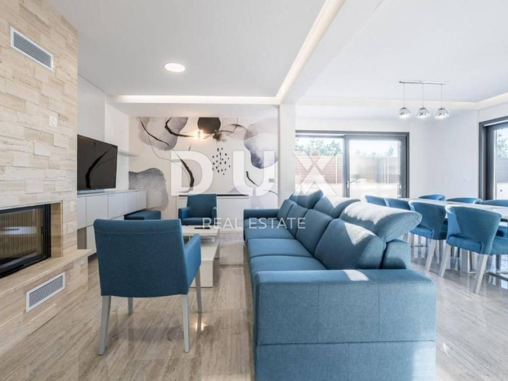 The town of Zaton is an extremely popular tourist destination, given the beautiful beaches in the area and the proximity of the urban center of Zadar, which is only 15 km away. Right next to Zaton is the historic town of Nin, known for its many interesting historical and cultural monuments dating back to prehistoric times. For example, you can see the remains of the Roman forum there, and the remains of medieval and ancient Croatian war and merchant ships called kondurs were also found in Nin. In Nin there is also the longest sandy beach in Croatia called Kraljičina plaža. In the Nin lagoon there is also a locality with healing mud Peloid, whose beneficial properties were known even in Roman times. For sale is a luxurious villa in Zaton, just 100 meters from the sea. Its garden, designed with the same precision, emphasizes functionality and comfort. This villa offers an enchanting view of the sea and the surrounding greenery from anywhere inside it - from the ground floor, through the upper floor to the roof terrace. The total area of this property is 520 m2, including 194.23 m2 of living space, 293 m2 of garden, a children's playground of 62 m2 and a 30 m2 swimming pool. The interior of the villa is spread over two floors. The ground floor contains a living room with a dining room and a kitchen fully equipped with all appliances and accessories, a toilet and a storage room. Large glass sliding walls allow access from the dining room and kitchen to a spacious covered terrace with a large barbecue, next to which there is a heated swimming pool equipped with deckchairs and umbrellas. The courtyard near the pool also offers an outdoor shower, while a separate children's playground is equipped with a soft floor to ensure safety during children's activities. A staircase lined with quality oak wood 4 cm thick leads to the first floor, where there are four comfortable bedrooms, each with its own bathroom. Two rooms have access to the balcony with a view of the sea and nature around the house. Each room has been designed with special attention to comfort and practicality, equipped with custom-made furniture, while the master bedroom has its own wardrobe. The villa also has a partially covered roof terrace of 64.53 m2, providing additional space for relaxing, sunbathing and enjoying the wonderful panoramic view of the surroundings. Underfloor heating and wall-mounted air conditioners for cooling ensure a comfortable temperature in all rooms. This property is extremely special not only because of its architecture and decoration, but also because of the unique location that offers access to two types of beaches - pebble and sandy, and the proximity of shops, public transport, ATMs, as well as two cities: Nin and Zadar, emphasizes the practicality of the location , making this villa a perfect combination of exclusivity and practicality. Dear clients, the agency commission is charged in accordance with the General Business Conditions www.dux-nekretnine.hr/opci-uvjeti-poslovanja