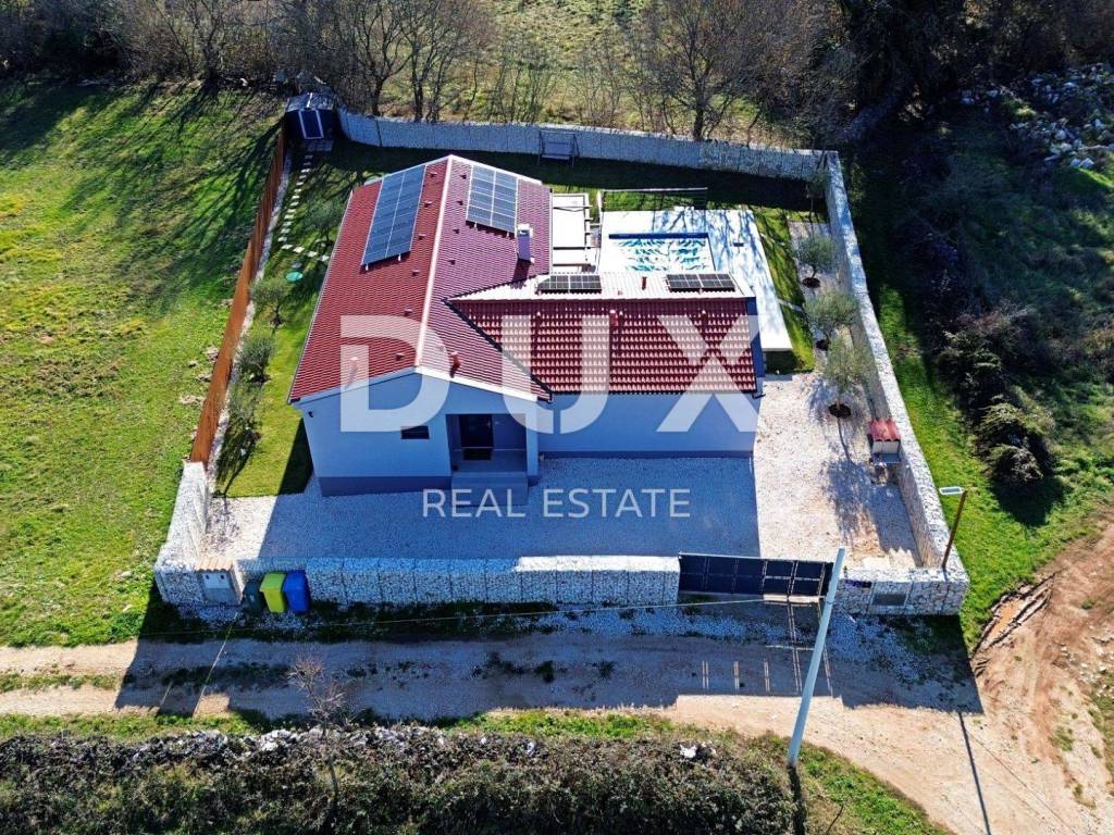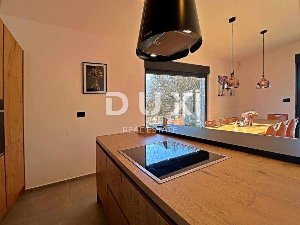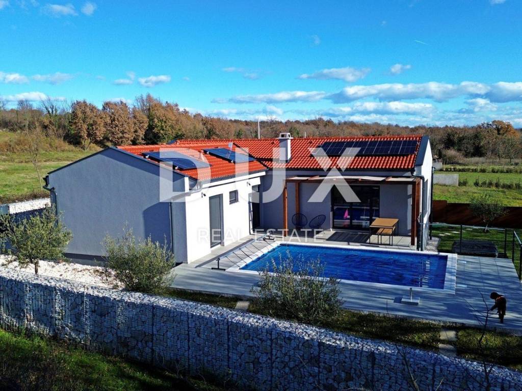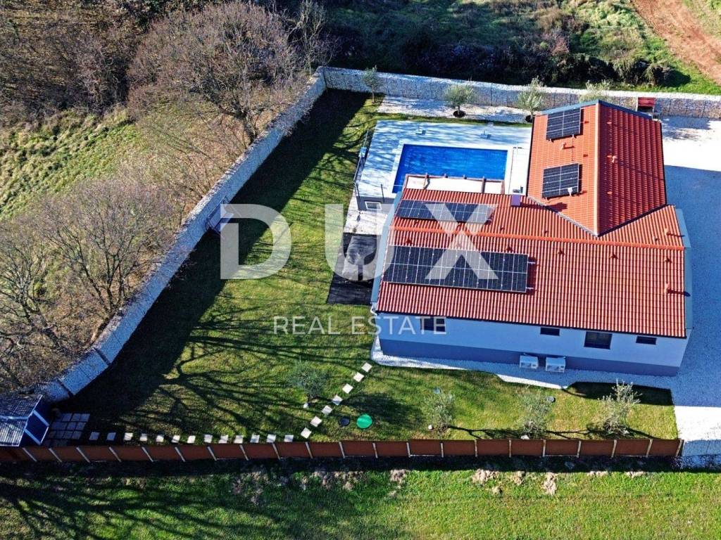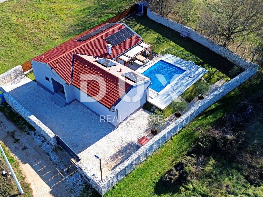 Barban is a small picturesque medieval acropolis-type settlement in the southern part of eastern Istria, located above the Raša river valley. Well-preserved architectural buildings from the Baroque and Gothic periods, frescoes and Glagolitic inscriptions, churches, palaces and city walls, the knightly game of the Ring Race, the traditional wine festival and the fig festival make Barban extremely attractive. The municipality of Barban, which has access to the sea in Raško Bay, covers an area of 100 km. Apart from Barban, there are 31 other settlements in the beautiful greenery of Barbanština. A house with a swimming pool is for sale in one of the settlements of the Municipality of Barban. The newly built prefabricated one-story house is defined as one residential unit whose L-shaped floor plan concept has been used to the maximum and is decorated with high quality and taste. It consists of a living area that unites the kitchen, dining room and living room with access to the terrace covered with a pergola, three bedrooms, three bathrooms, a guest toilet and a storage room. Heating/cooling of the house is provided by air conditioners, floor heating in the bathrooms and a pellet fireplace in the living room. In the horticulturally landscaped and fenced garden, the central place is occupied by a heated pool of 29 m with a sun deck. The property is fully equipped and furnished and is being sold as such. An ideal opportunity for a peaceful family life as well as an investment for the purpose of tourist rental. Dear clients, the agency commission is charged in accordance with the General Business Conditions: www.dux-nekretnine.hr/opci-uvjeti-poslovanja