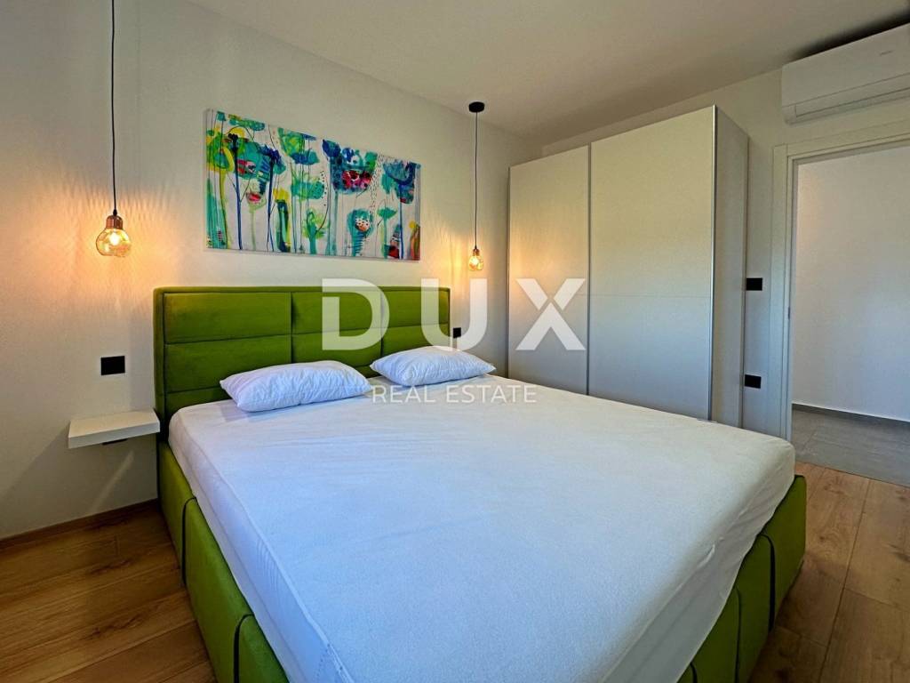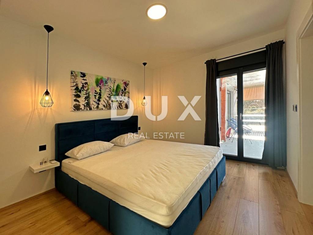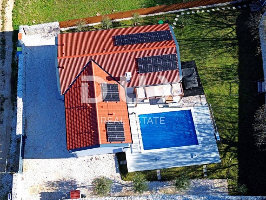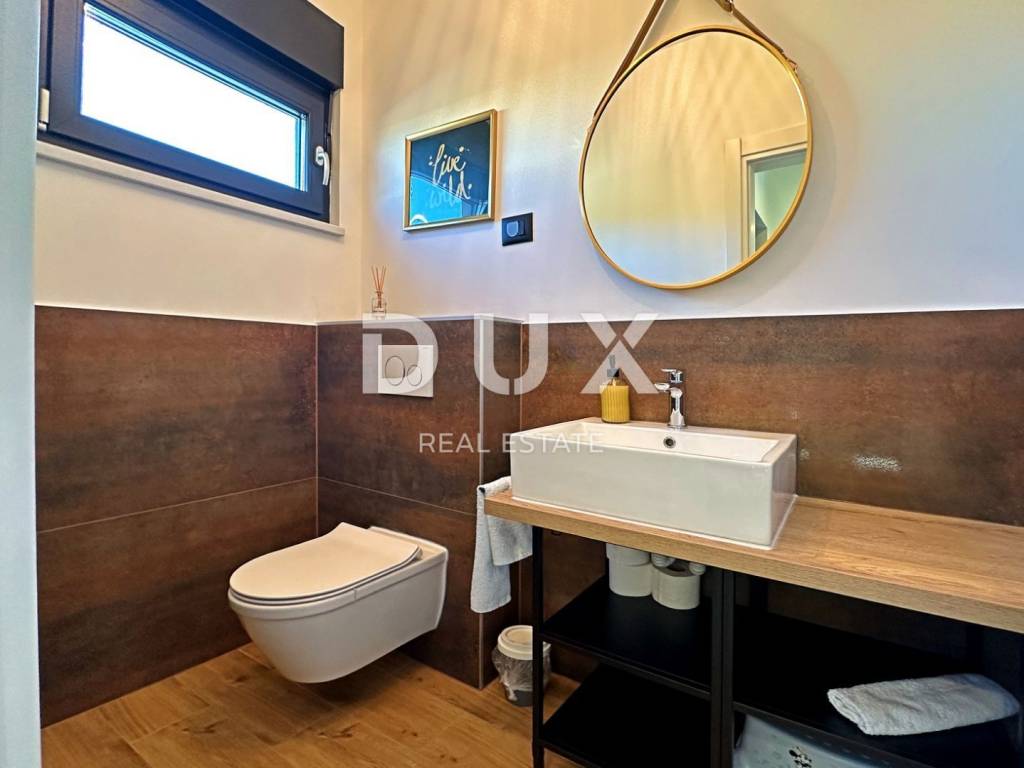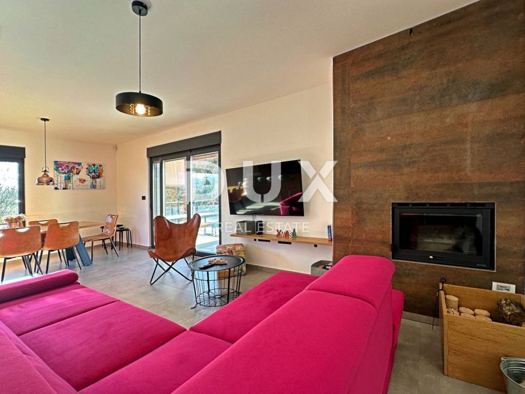 Barban is a small picturesque medieval acropolis-type settlement in the southern part of eastern Istria, located above the Raša river valley. Well-preserved architectural buildings from the Baroque and Gothic periods, frescoes and Glagolitic inscriptions, churches, palaces and city walls, the knightly game of the Ring Race, the traditional wine festival and the fig festival make Barban extremely attractive. The municipality of Barban, which has access to the sea in Raško Bay, covers an area of 100 km. Apart from Barban, there are 31 other settlements in the beautiful greenery of Barbanština. A house with a swimming pool is for sale in one of the settlements of the Municipality of Barban. The newly built prefabricated one-story house is defined as one residential unit whose L-shaped floor plan concept has been used to the maximum and is decorated with high quality and taste. It consists of a living area that unites the kitchen, dining room and living room with access to the terrace covered with a pergola, three bedrooms, three bathrooms, a guest toilet and a storage room. Heating/cooling of the house is provided by air conditioners, floor heating in the bathrooms and a pellet fireplace in the living room. In the horticulturally landscaped and fenced garden, the central place is occupied by a heated pool of 29 m with a sun deck. The property is fully equipped and furnished and is being sold as such. An ideal opportunity for a peaceful family life as well as an investment for the purpose of tourist rental. Dear clients, the agency commission is charged in accordance with the General Business Conditions: www.dux-nekretnine.hr/opci-uvjeti-poslovanja