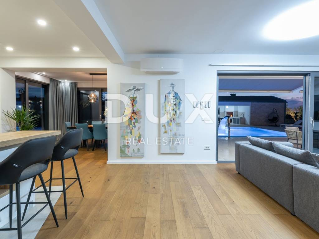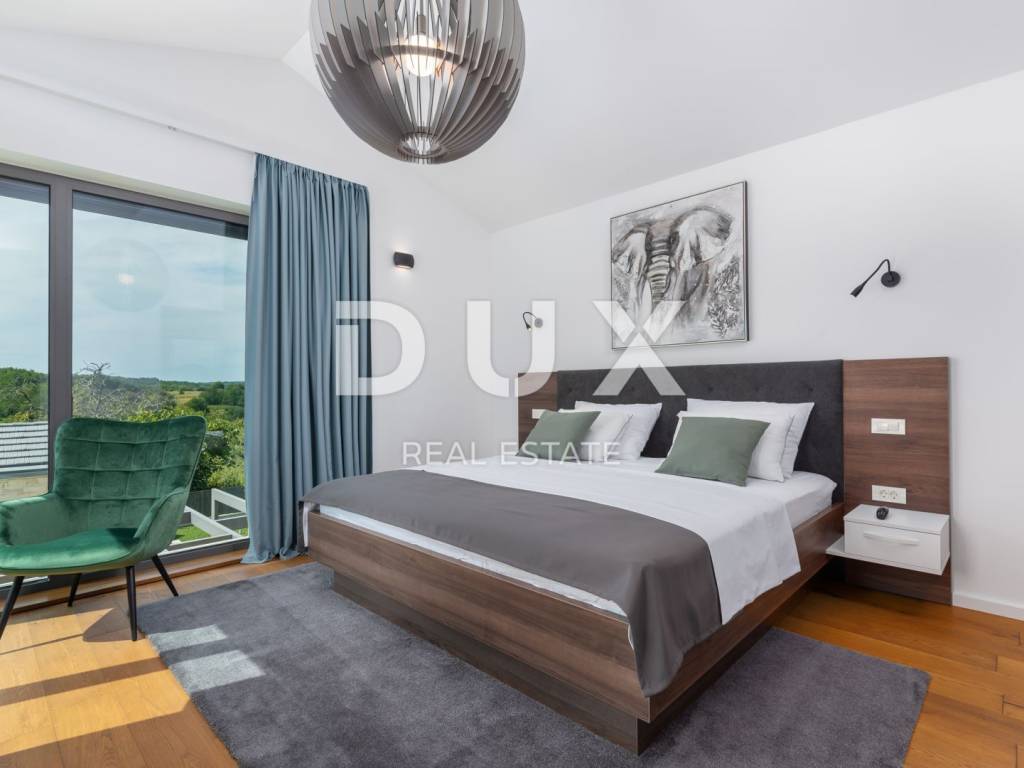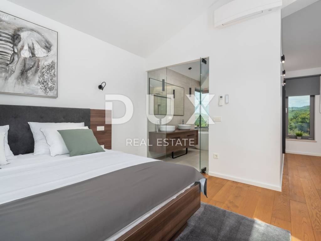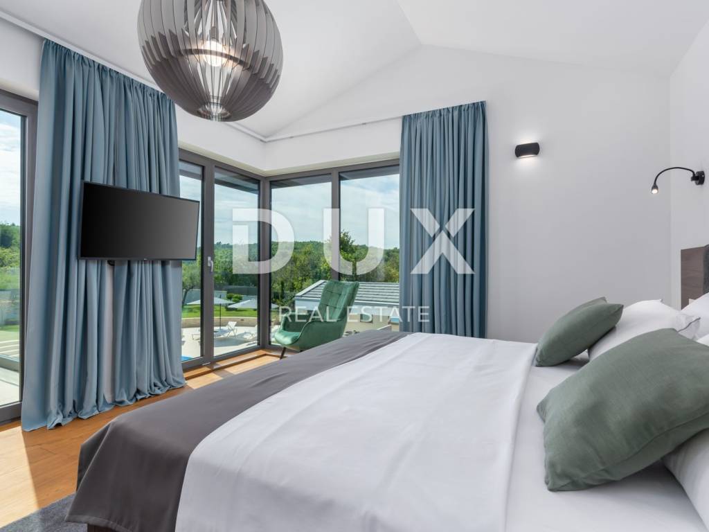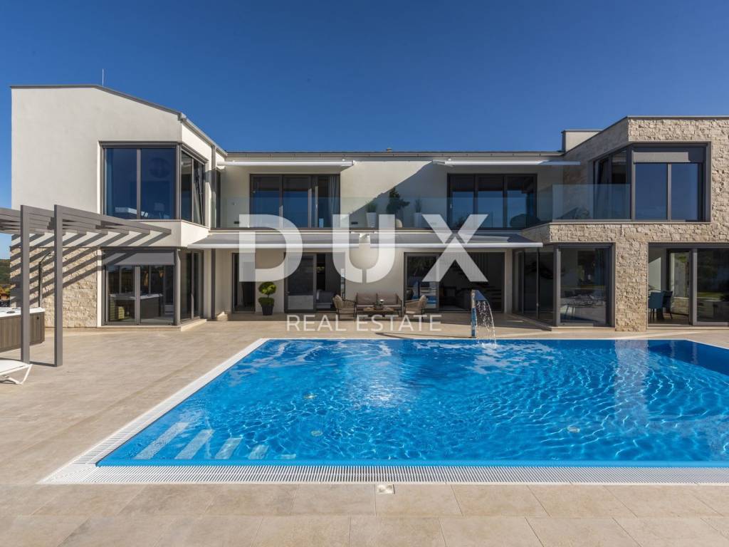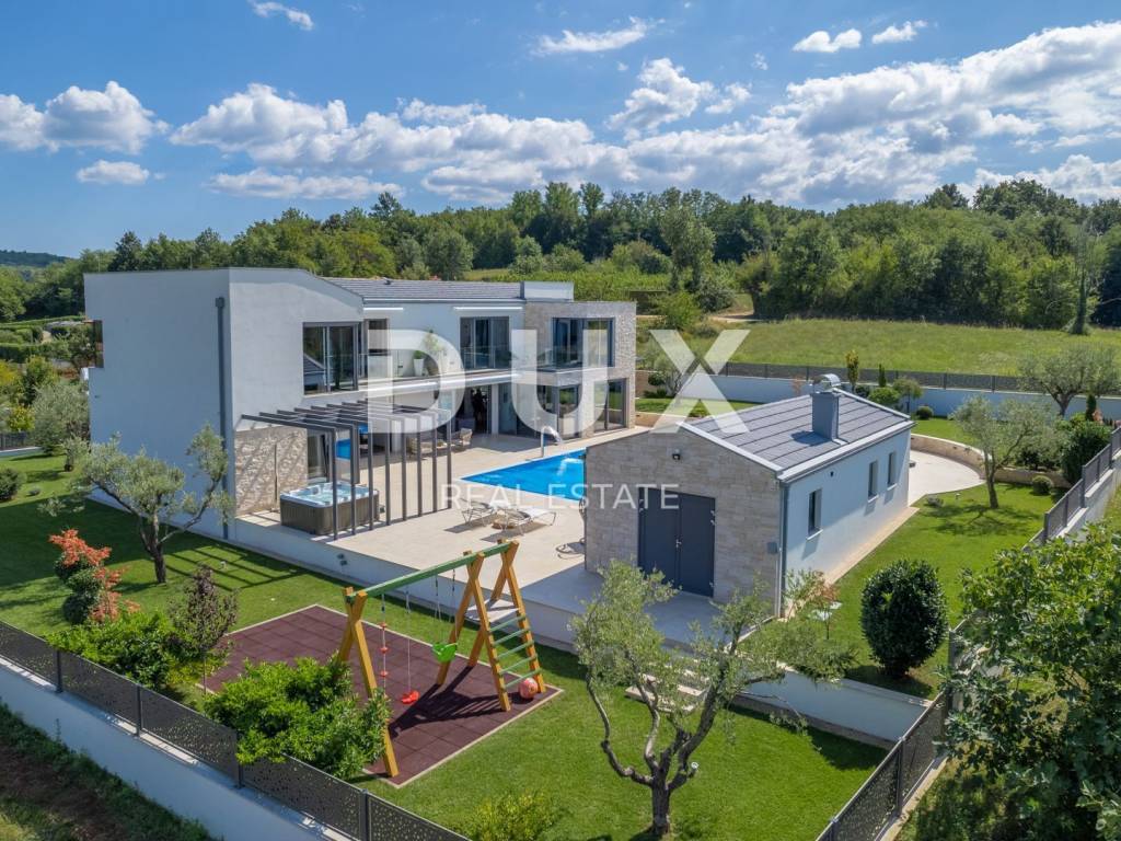 Motovun is a popular tourist destination, which today has a reputation as a center for hedonists from all over the world. The ancient Istrian acropolis town located on top of a 277-meter high hill that dominates the valley of the Mirna River is one of the most beautiful old towns in the Mediterranean. The longest Istrian staircase with 1052 steps leads to it. Motovun is a city-monument on the UNESCO World Heritage access list. What makes Motovun and its municipality, which covers an area of 33.58 km, special are biological diversity, rich flora and special microclimate characteristics. Due to its specific geomorphological characteristics with numerous hills, it attracts attention with its natural beauty and unforgettable panoramic views that fill the soul. Not far from Motovun, an impressive luxury villa is for sale. The villa is located in a peaceful and quiet location and represents a perfect combination of modern interior and peaceful landscape. Surrounded by an idyllic landscape, it was built in 2022 in a contemporary style, and its specialty is the luxurious interior that leaves you breathless. This exceptionally decorated villa with an impressive surface area of 447 m is divided into a ground floor and a first floor. The ground floor consists of an open space with a kitchen, dining room and living room, a bedroom with its own bathroom, an entrance area with a wardrobe, a toilet, a room for equipment and a staircase. On the ground floor there is a room for entertainment and relaxation with a Finnish sauna and a shower with a separate entrance. In order to complete the wellness corner, there is a covered hydromassage tub in front of the room. On the first floor there is a laundry room, two terraces and four bedrooms with private bathrooms. All bedrooms are decorated similarly, and are characterized by simplicity and whiteness, as well as access to the terrace with a generous view of the idyllic hills. The interior of the villa is made in a modern way, with minimalist clean forms and design in warm tones and high-quality materials. A large part of the house consists of elegant glass walls that allow a lot of natural light that are a subtle border between interior and exterior. All joinery and glass walls are made of AluK aluminum profiles, glazed with three-layer tinted glass with screen roller blinds and mosquito nets. Awnings with an electric system of opening and closing with a sensor in case of storms are installed on the terraces. It is equipped with Daikin air conditioners, a heat pump, video surveillance and an alarm system. Enclosed and elegantly and impressively decorated, the garden has an idyllic atmosphere where silence alternates with the sounds of nature. The central zone of true relaxation and peace is certainly occupied by the 60 m swimming pool with a sunbathing area. In the pool maintenance room there is a water heating pump and a pump with three trimmers, so that the chlorine and PH factor of the water in the pool can be maintained automatically, and there is also a robot for cleaning the pool itself. Next to the swimming pool is a covered summer kitchen with a fireplace and outdoor dining area and a storage room, as well as a children's playground with a rubber surface. Luxury and elegance wrapped in modern clothes and architecture combining the beauty of the Istrian land are the key elements of this villa, which is an ideal opportunity for family life, rest and relaxation or as an investment for rental for tourist purposes. The seller of the property in question is a legal entity.