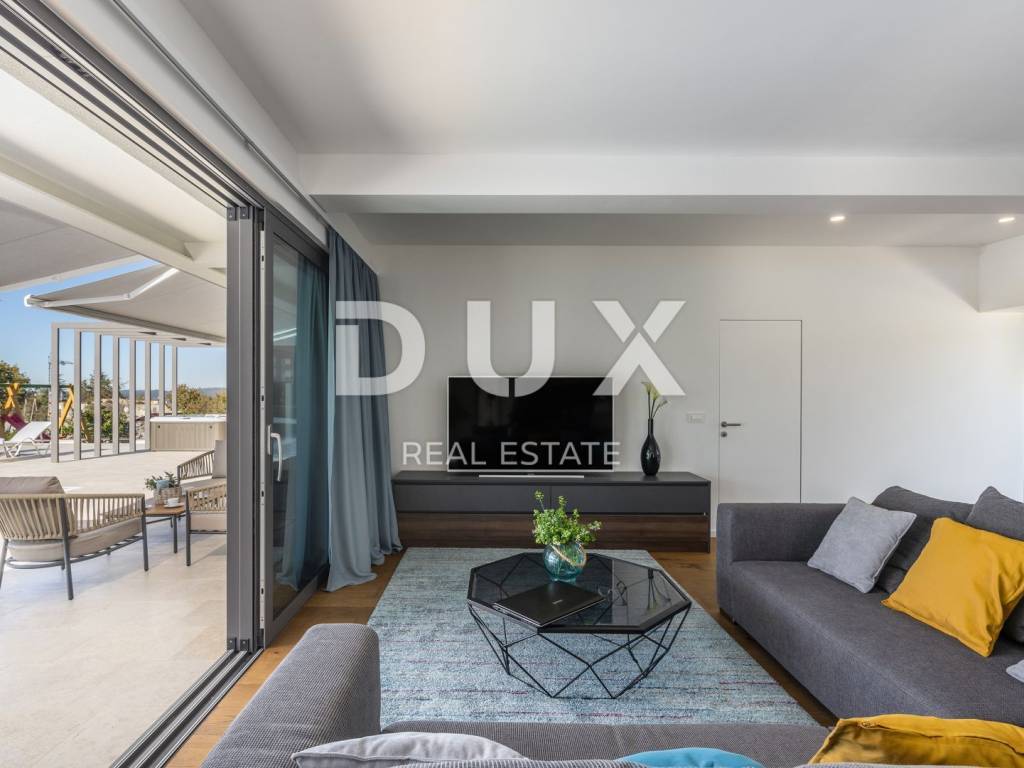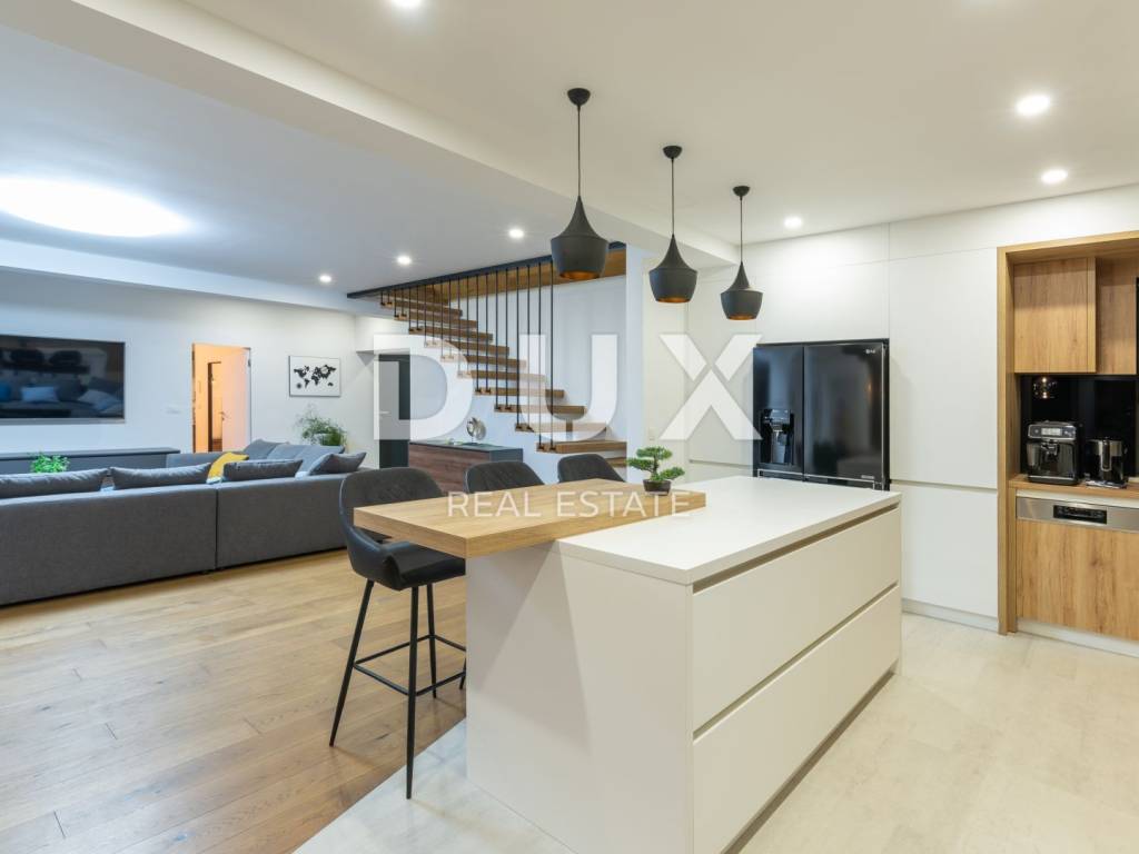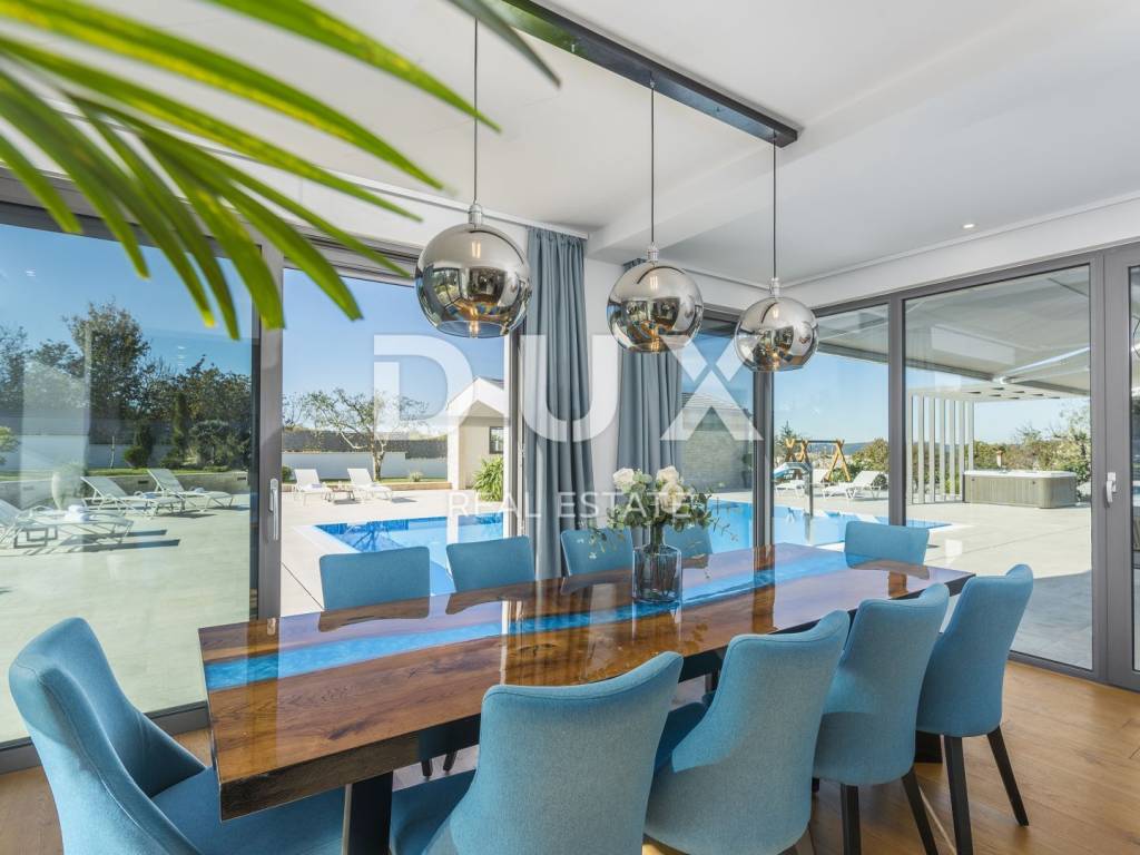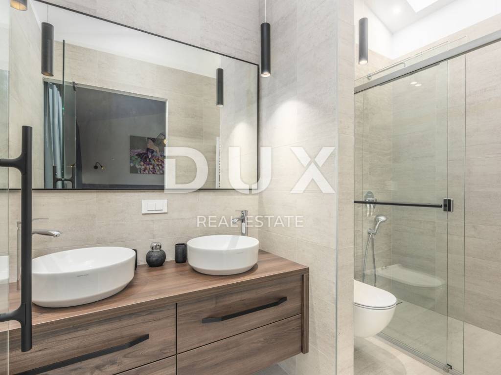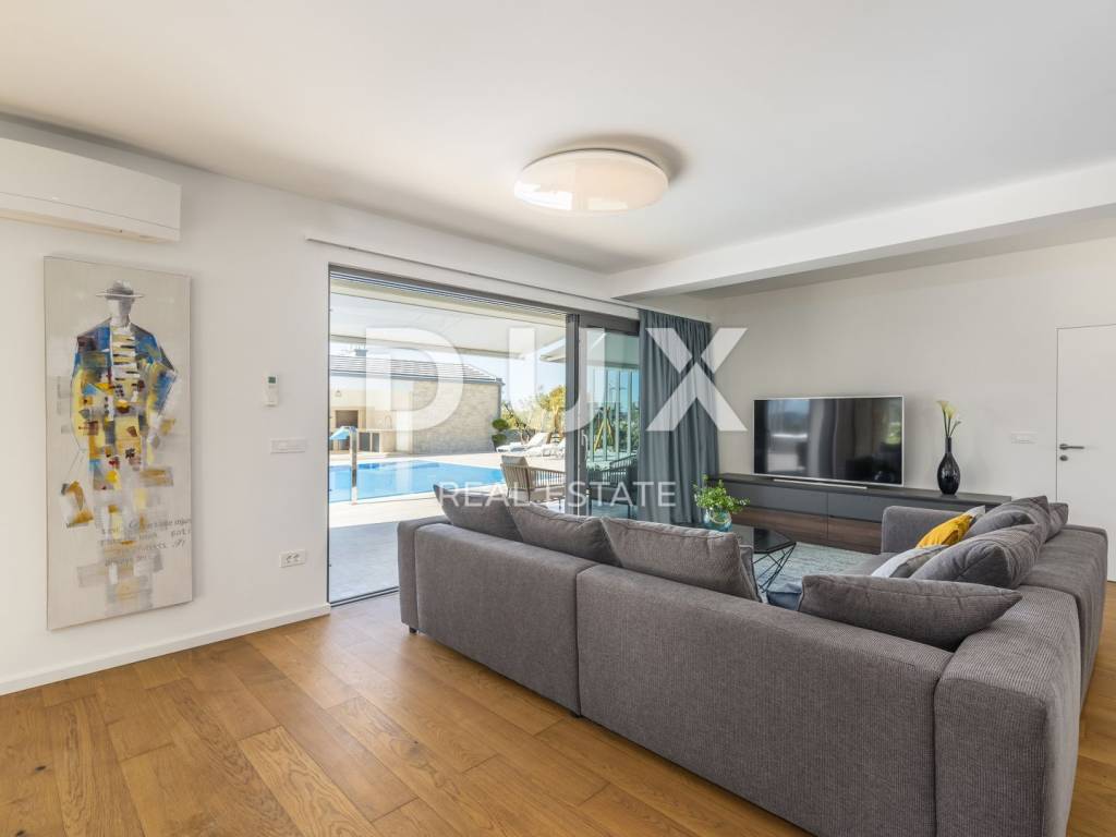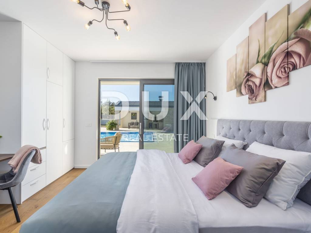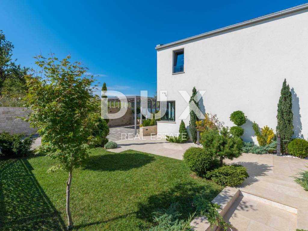 Motovun is a popular tourist destination, which today has a reputation as a center for hedonists from all over the world. The ancient Istrian acropolis town located on top of a 277-meter high hill that dominates the valley of the Mirna River is one of the most beautiful old towns in the Mediterranean. The longest Istrian staircase with 1052 steps leads to it. Motovun is a city-monument on the UNESCO World Heritage access list. What makes Motovun and its municipality, which covers an area of 33.58 km, special are biological diversity, rich flora and special microclimate characteristics. Due to its specific geomorphological characteristics with numerous hills, it attracts attention with its natural beauty and unforgettable panoramic views that fill the soul. Not far from Motovun, an impressive luxury villa is for sale. The villa is located in a peaceful and quiet location and represents a perfect combination of modern interior and peaceful landscape. Surrounded by an idyllic landscape, it was built in 2022 in a contemporary style, and its specialty is the luxurious interior that leaves you breathless. This exceptionally decorated villa with an impressive surface area of 447 m is divided into a ground floor and a first floor. The ground floor consists of an open space with a kitchen, dining room and living room, a bedroom with its own bathroom, an entrance area with a wardrobe, a toilet, a room for equipment and a staircase. On the ground floor there is a room for entertainment and relaxation with a Finnish sauna and a shower with a separate entrance. In order to complete the wellness corner, there is a covered hydromassage tub in front of the room. On the first floor there is a laundry room, two terraces and four bedrooms with private bathrooms. All bedrooms are decorated similarly, and are characterized by simplicity and whiteness, as well as access to the terrace with a generous view of the idyllic hills. The interior of the villa is made in a modern way, with minimalist clean forms and design in warm tones and high-quality materials. A large part of the house consists of elegant glass walls that allow a lot of natural light that are a subtle border between interior and exterior. All joinery and glass walls are made of AluK aluminum profiles, glazed with three-layer tinted glass with screen roller blinds and mosquito nets. Awnings with an electric system of opening and closing with a sensor in case of storms are installed on the terraces. It is equipped with Daikin air conditioners, a heat pump, video surveillance and an alarm system. Enclosed and elegantly and impressively decorated, the garden has an idyllic atmosphere where silence alternates with the sounds of nature. The central zone of true relaxation and peace is certainly occupied by the 60 m swimming pool with a sunbathing area. In the pool maintenance room there is a water heating pump and a pump with three trimmers, so that the chlorine and PH factor of the water in the pool can be maintained automatically, and there is also a robot for cleaning the pool itself. Next to the swimming pool is a covered summer kitchen with a fireplace and outdoor dining area and a storage room, as well as a children's playground with a rubber surface. Luxury and elegance wrapped in modern clothes and architecture combining the beauty of the Istrian land are the key elements of this villa, which is an ideal opportunity for family life, rest and relaxation or as an investment for rental for tourist purposes. The seller of the property in question is a legal entity.