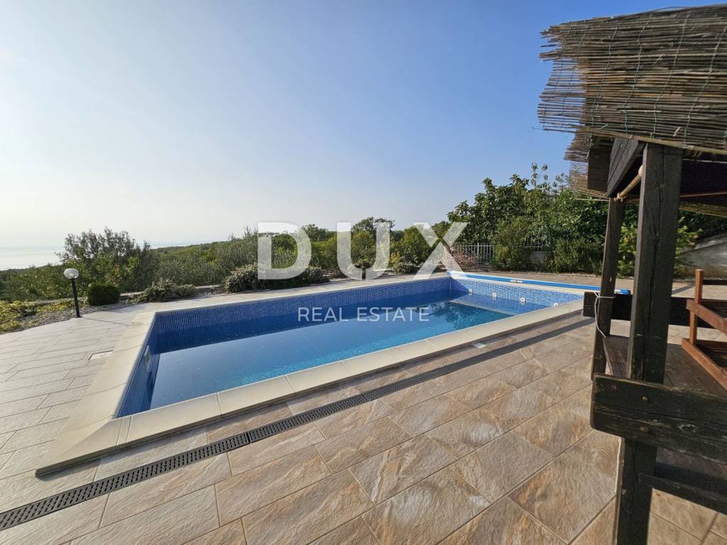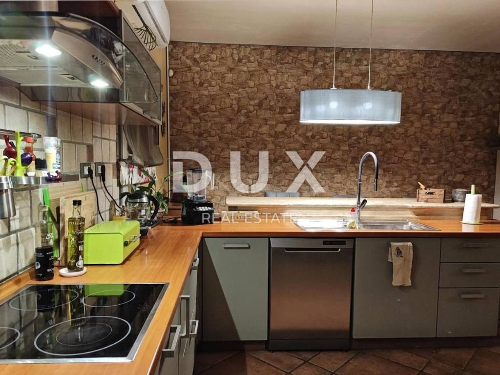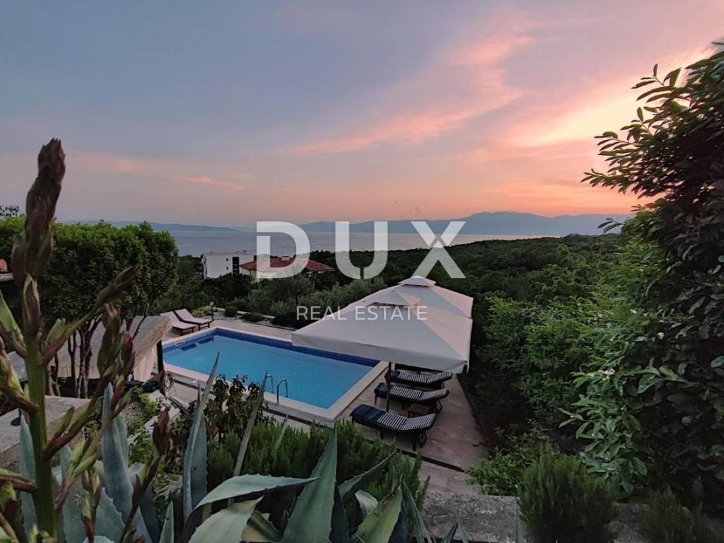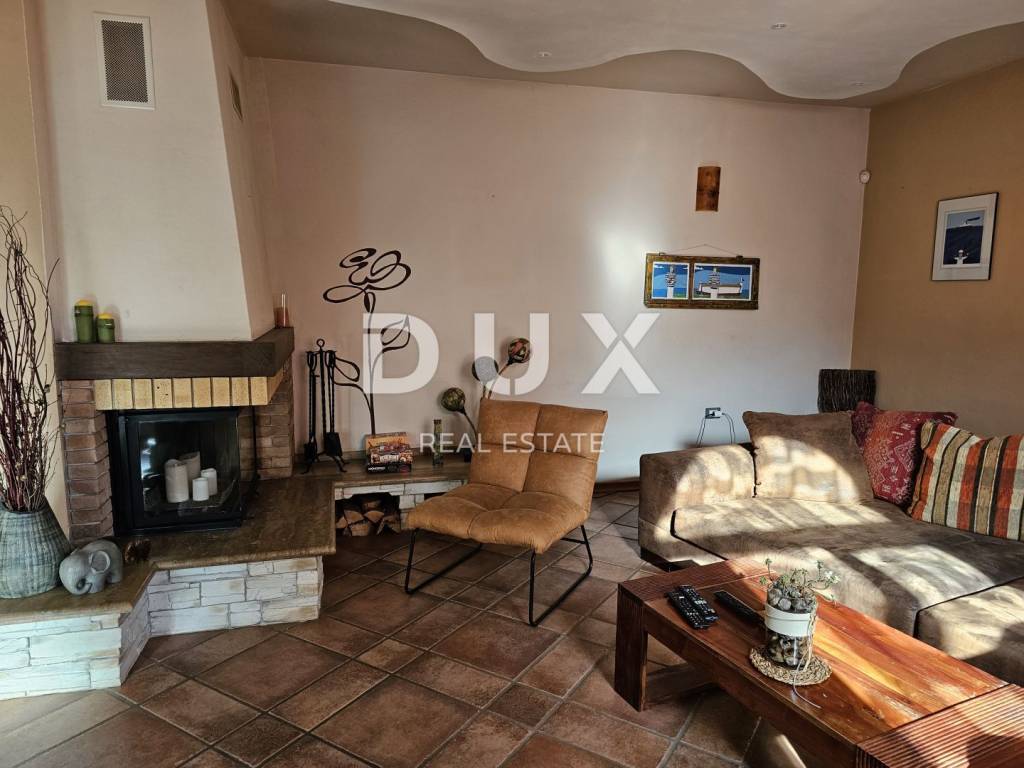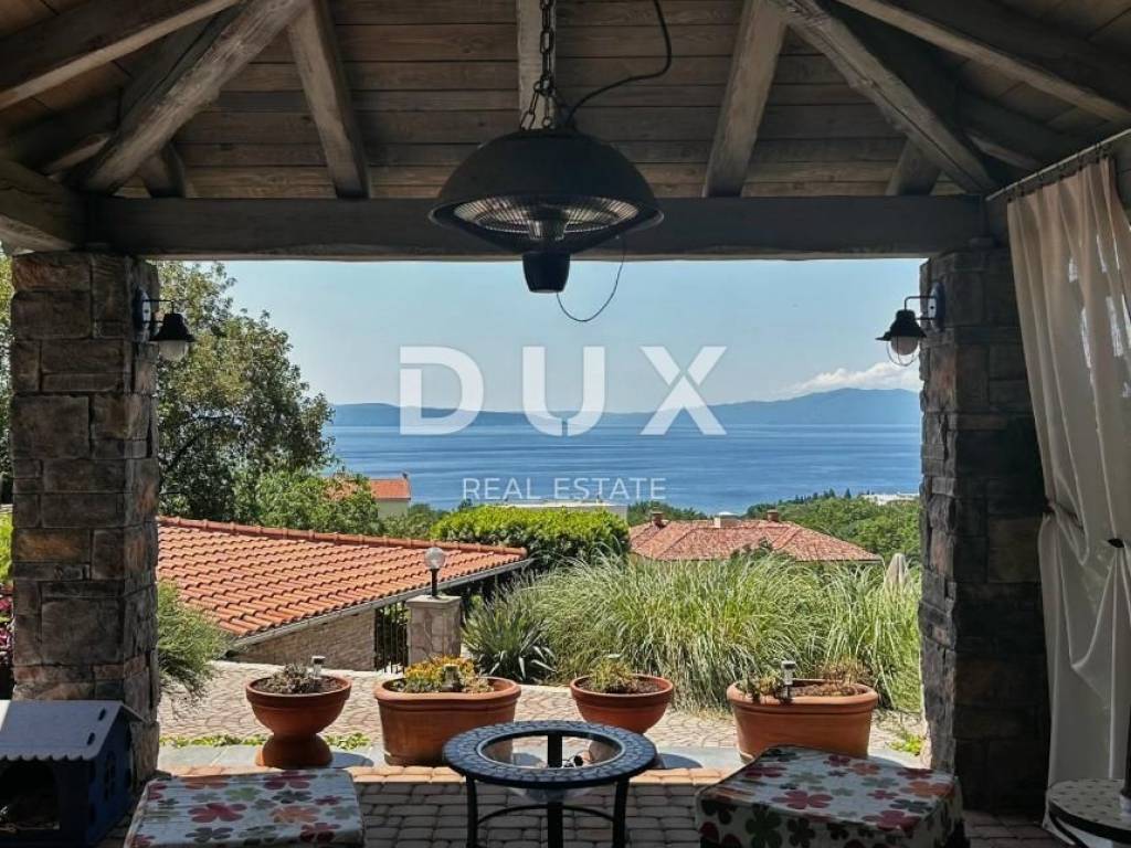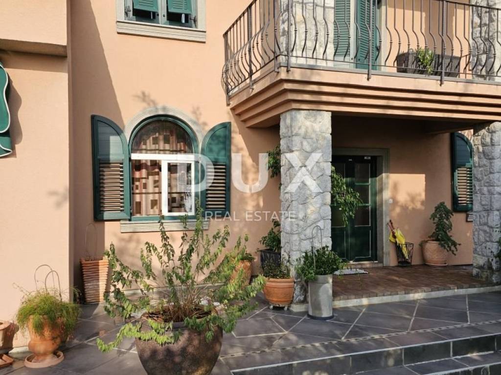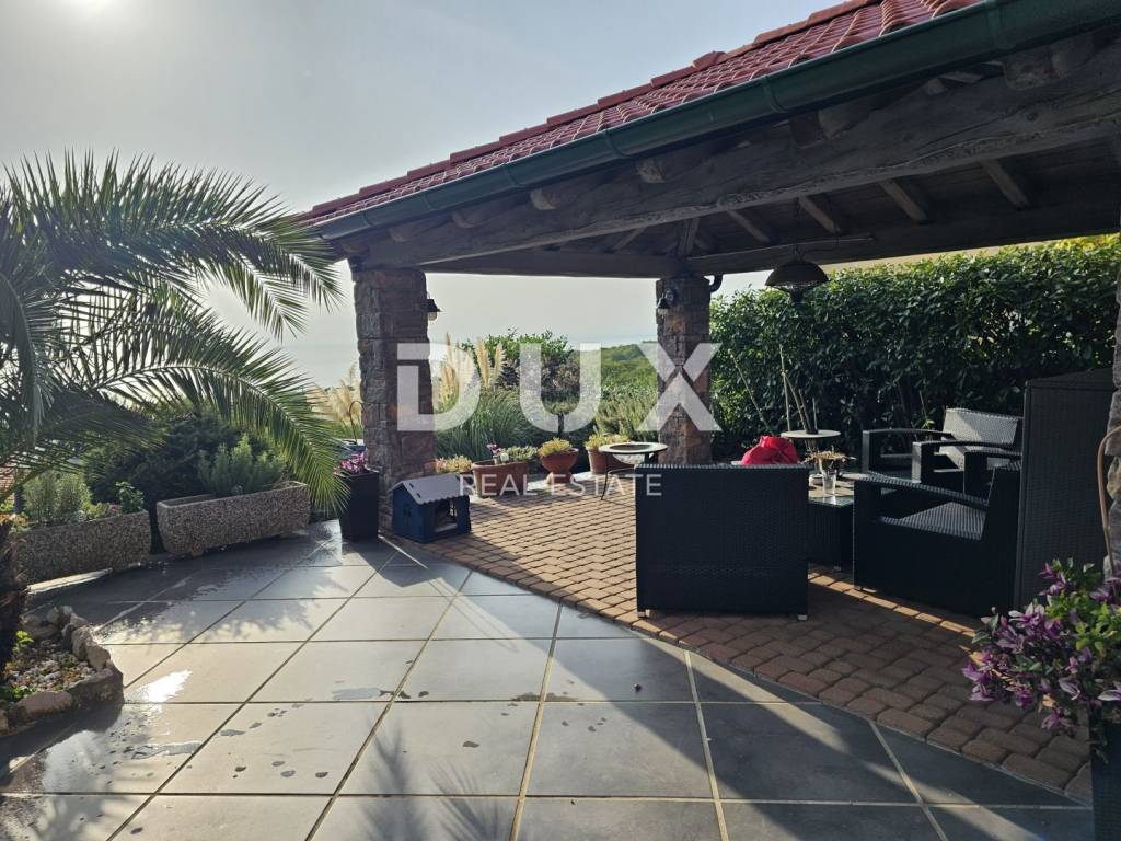 KOSTRENA - Coastal-style villa with pool Detached seaside house located in an excellent location, with a pool of 32 m2 and a beautiful view of Kvarner. The house has an "open-space" ground floor where there is a bathroom, kitchen, dining room and living room. The living room leads to a large covered terrace. Internal stairs lead to the first floor, where there are three bedrooms and two bathrooms. The master bedroom has a walk-in closet and access to a balcony with a panoramic view. The land has a cascade configuration, so the stairs lead to the swimming pool in complete intimacy, bordered by plants. Three cascades follow with olives, figs, almonds and pomegranates. An automatic irrigation system was implemented. The Mediterranean plants on the property are over 15 years old. The land has three entrances and parking for a large number of cars. The house is secured with an alarm and a CCTV system with the possibility of remote monitoring. The possibility of heating in three ways: air conditioning, fireplace in the living room with exhaust of hot air through all rooms and central gas (the tank is located on the land, and the central unit is in the large bathroom). The house is located at a distance of 400 meters on foot from the sea and a few minutes from all municipal facilities. *** Dear clients, the agency commission is charged in accordance with the General Business Conditions www.dux-nekretnine.hr/opci-uvjeti-poslovanja