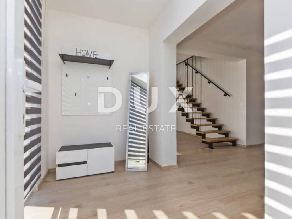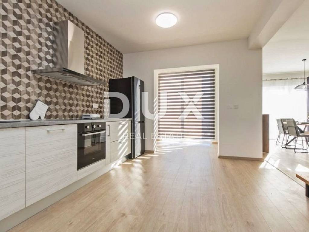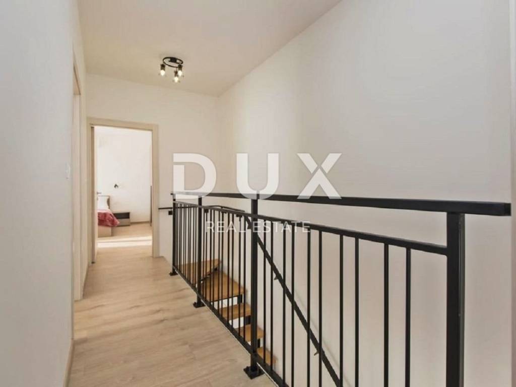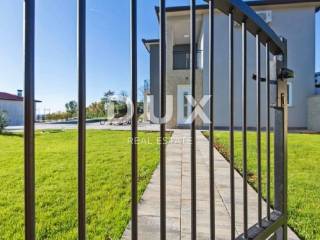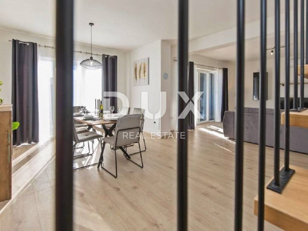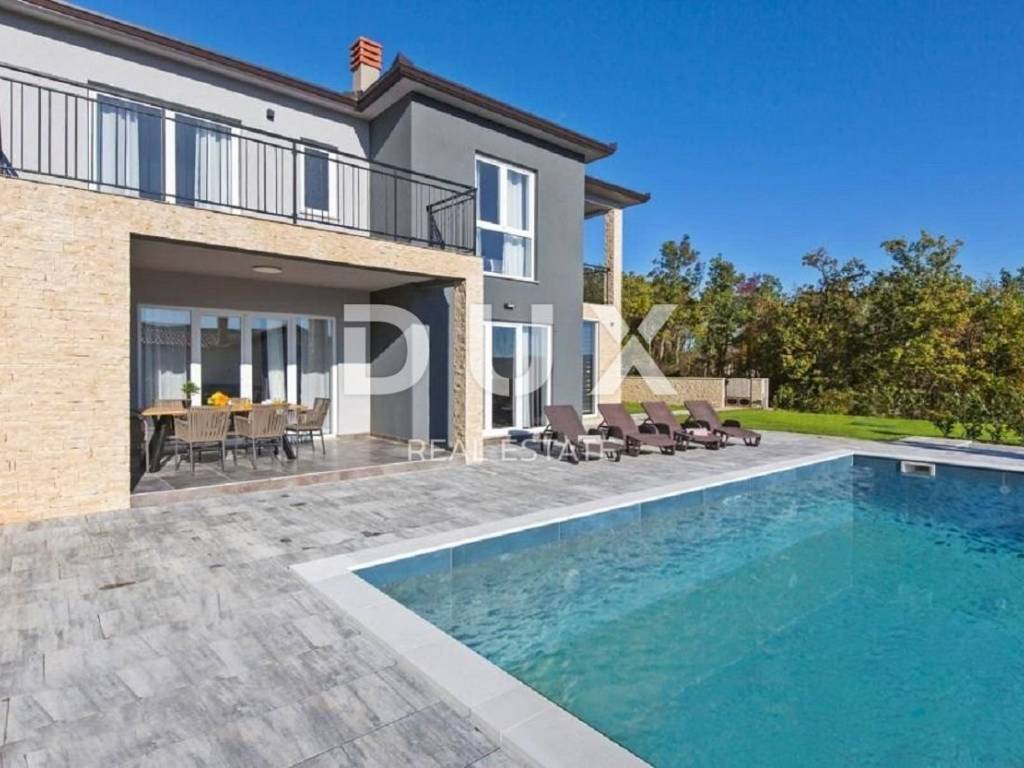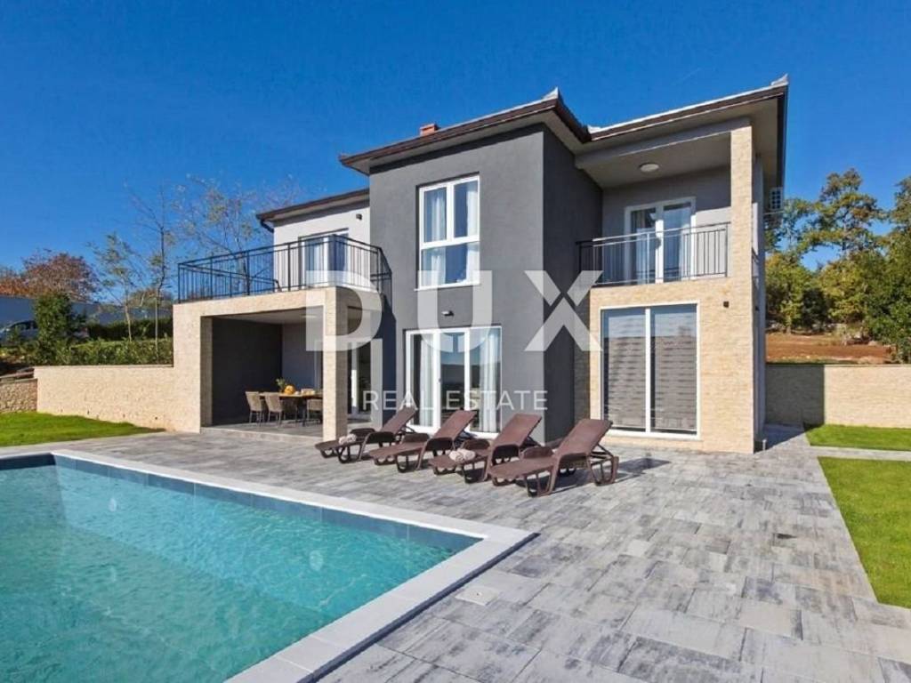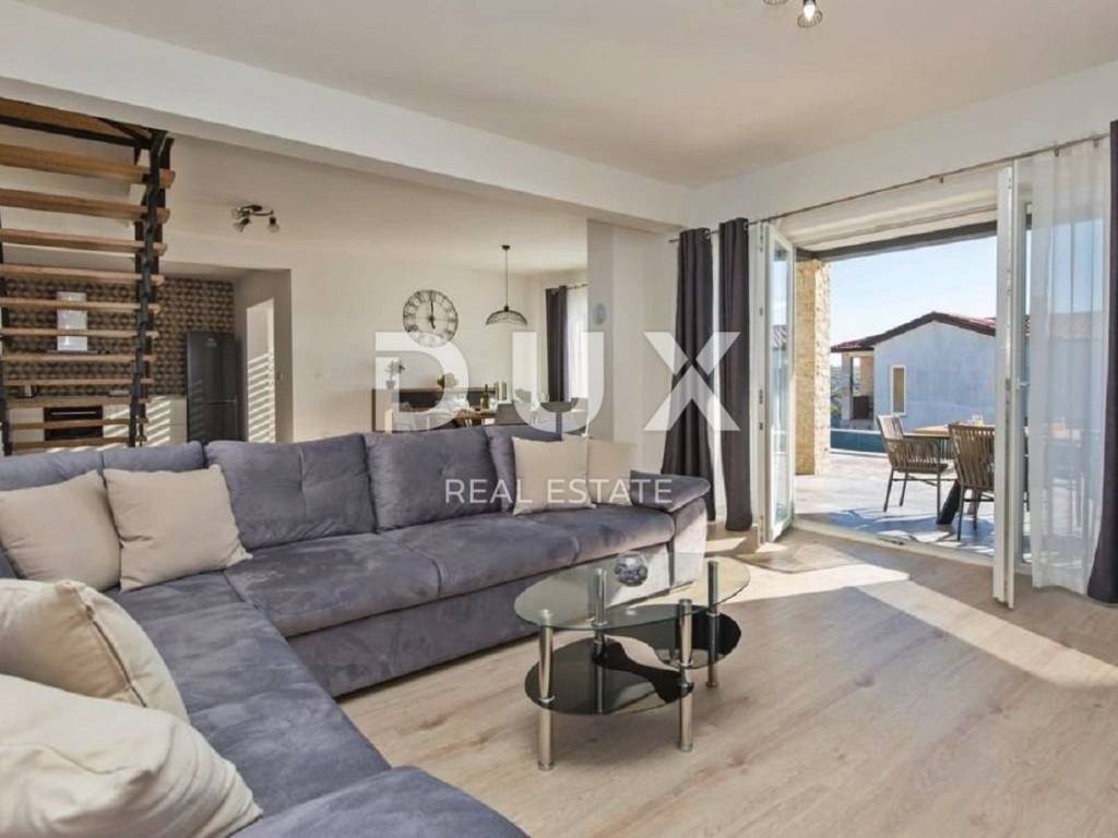 In the vicinity of the town of Labin, a modern new building with a panoramic view is for sale. The quality-built house extends through the ground floor and first floor. The ground floor consists of an open concept living room, dining room and kitchen with access to a covered terrace, toilet, storage room and laundry room. Upstairs there are three bedrooms with private bathrooms and two terraces. For heating/cooling, the house uses air conditioning inverters in every room, underfloor heating and the possibility of installing a wood or pellet fireplace in the living area of the house. It is fully furnished and equipped and is being sold as such. The yard is completely fenced and landscaped and contains a swimming pool with a sunbathing area and parking spaces. This modern newly built house in a quiet village with a panoramic view of the countryside is an ideal property for family life or as an investment for rental for tourist purposes.