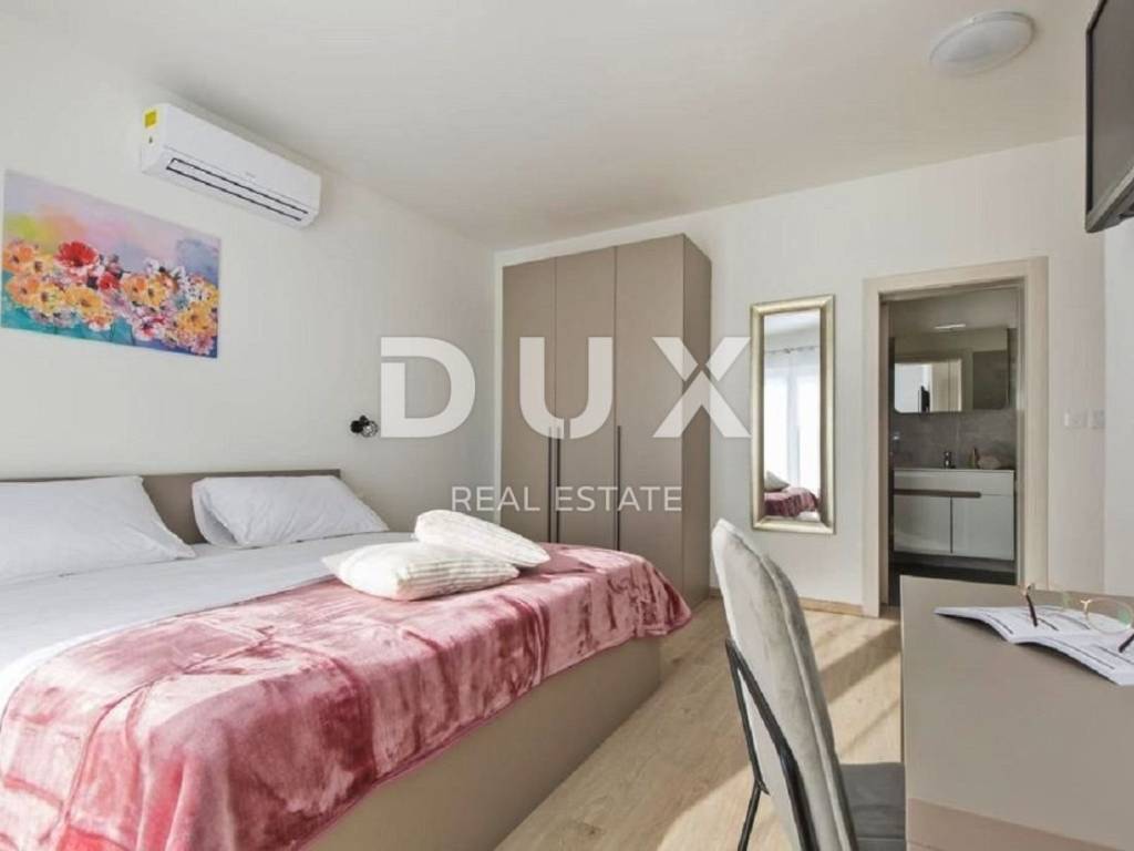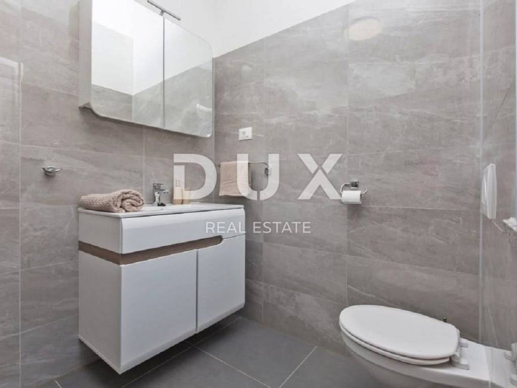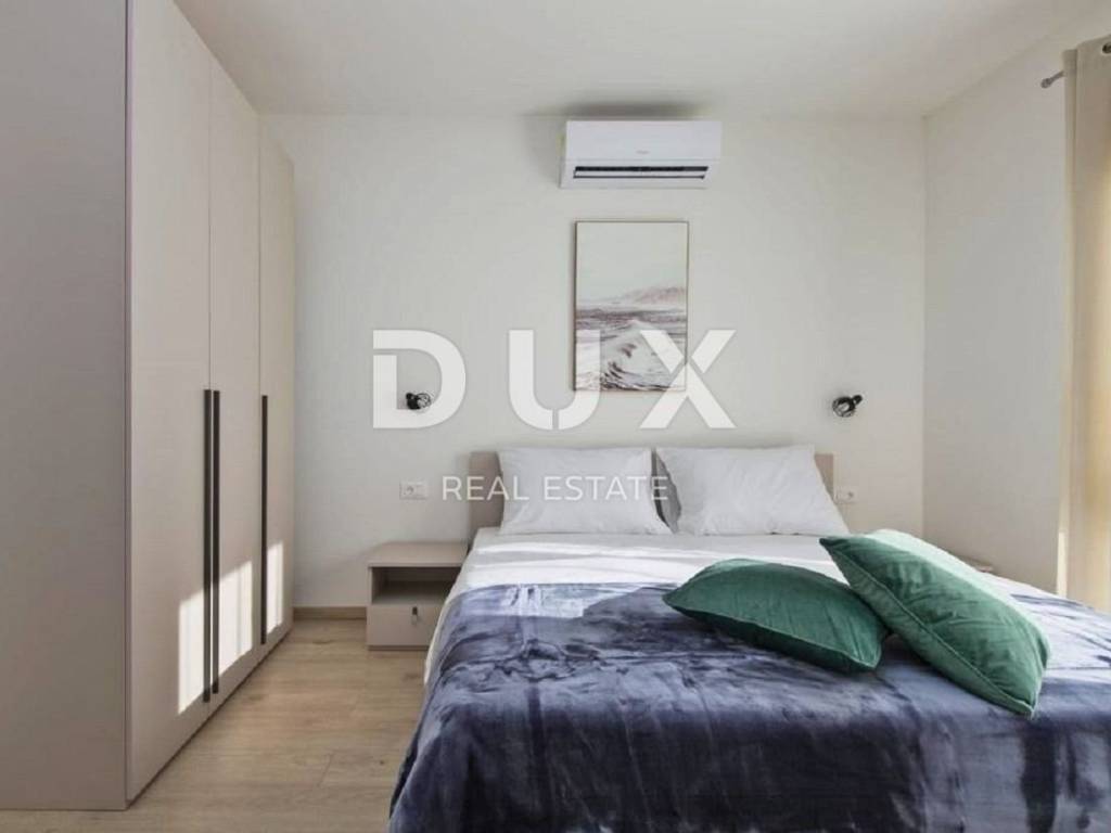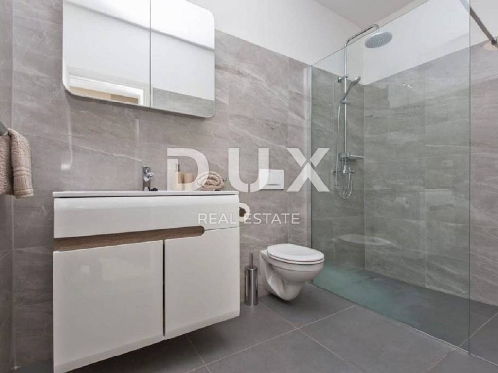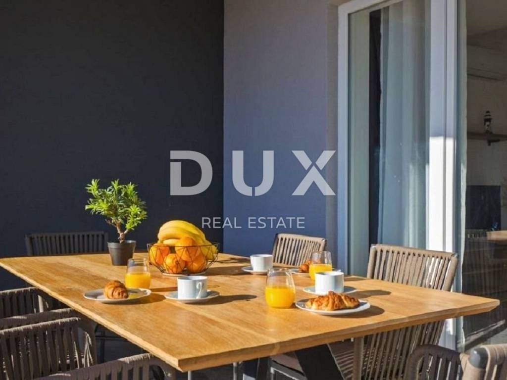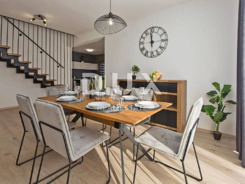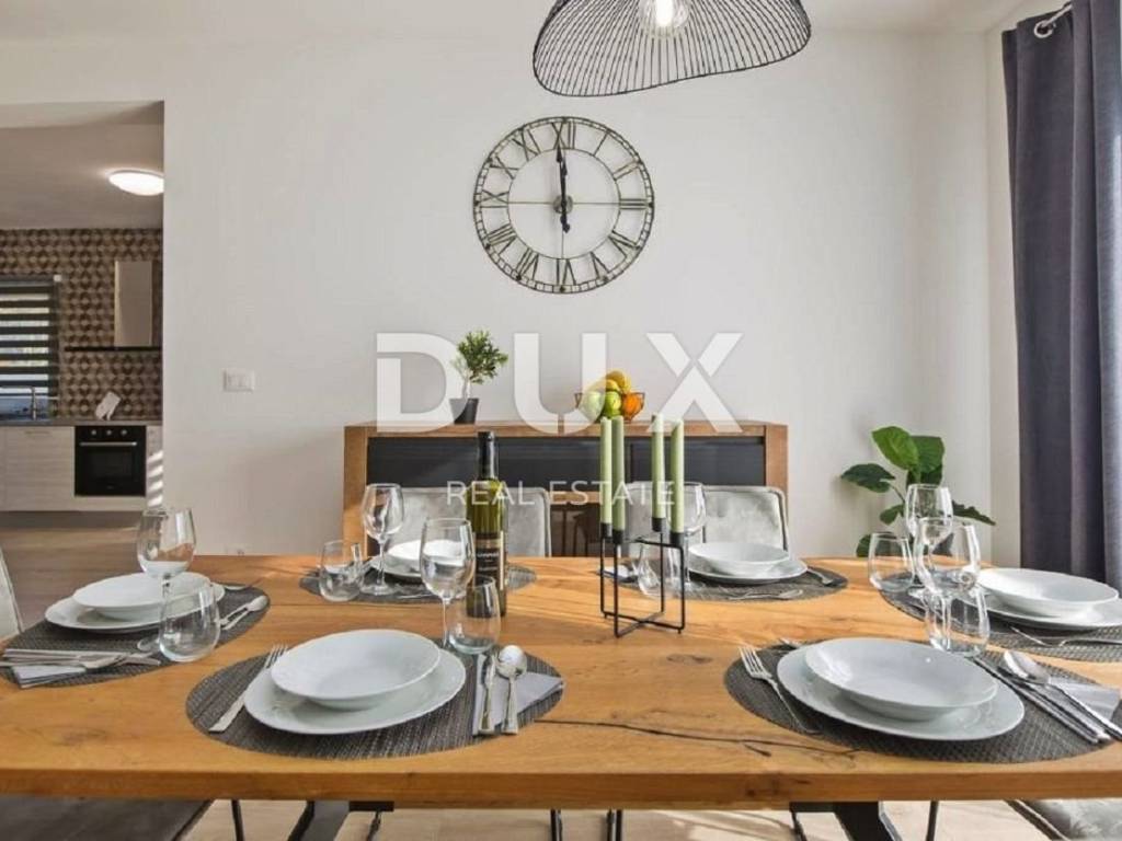 In the vicinity of the town of Labin, a modern new building with a panoramic view is for sale. The quality-built house extends through the ground floor and first floor. The ground floor consists of an open concept living room, dining room and kitchen with access to a covered terrace, toilet, storage room and laundry room. Upstairs there are three bedrooms with private bathrooms and two terraces. For heating/cooling, the house uses air conditioning inverters in every room, underfloor heating and the possibility of installing a wood or pellet fireplace in the living area of the house. It is fully furnished and equipped and is being sold as such. The yard is completely fenced and landscaped and contains a swimming pool with a sunbathing area and parking spaces. This modern newly built house in a quiet village with a panoramic view of the countryside is an ideal property for family life or as an investment for rental for tourist purposes.