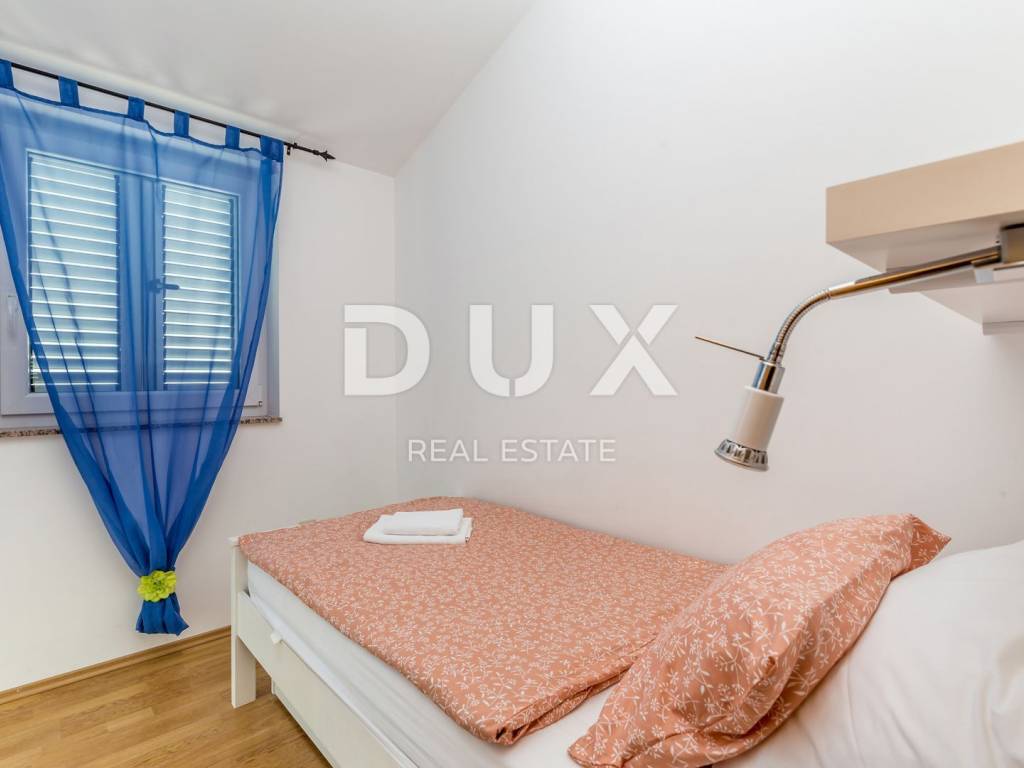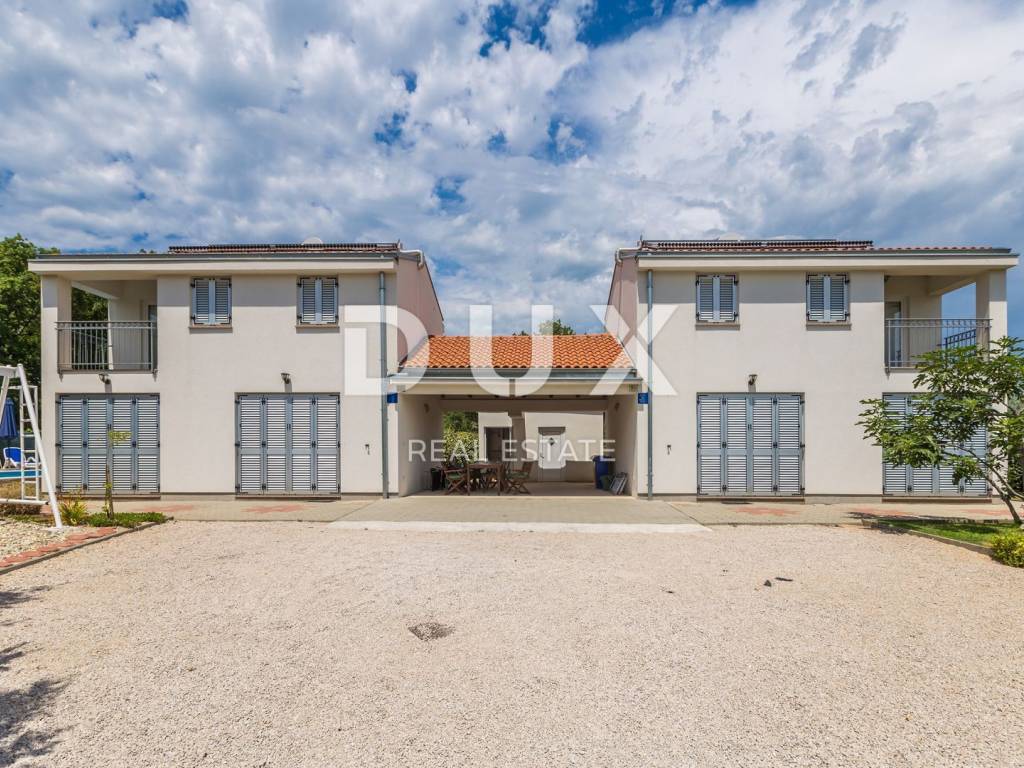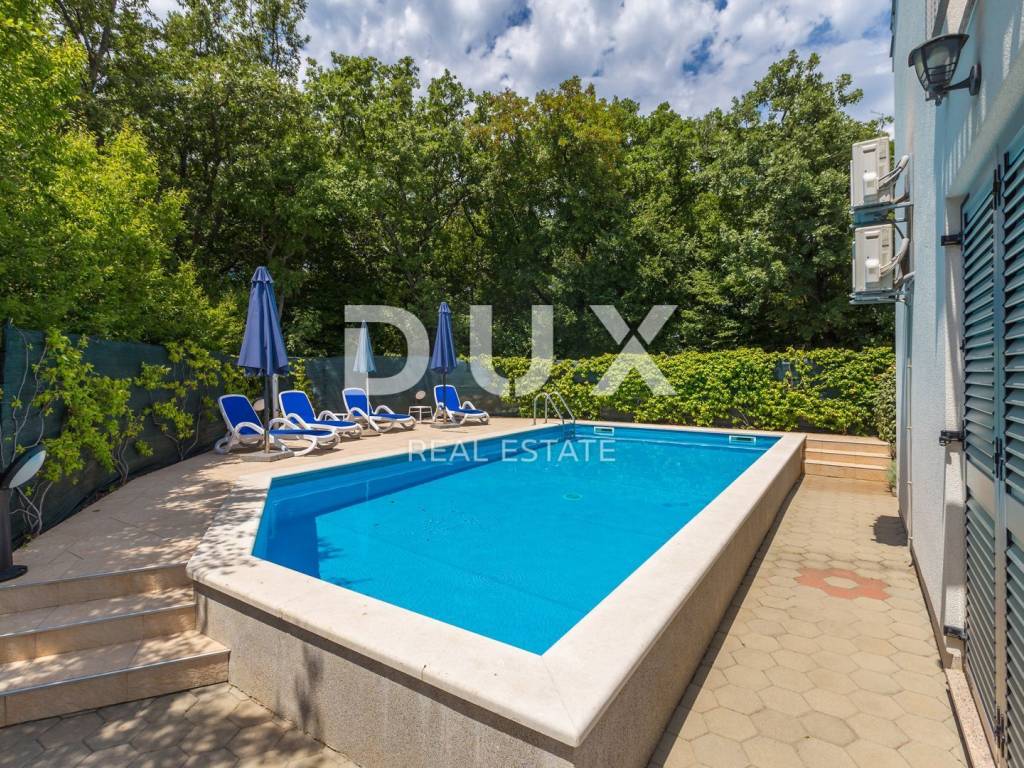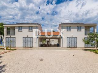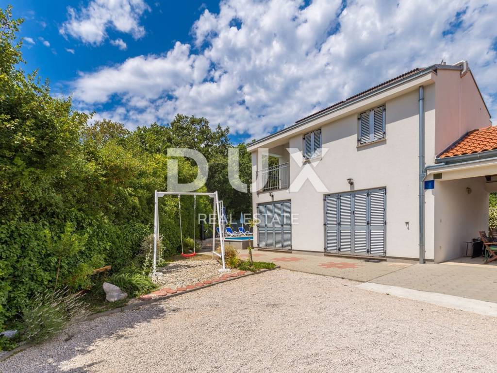 This beautiful two-story building with a total of 200 m2 is located in a small town near the town of Krk. The plot is about 700 m2 and is located about 1,200 meters from the sea. In each of the two units there is a bathroom, a kitchen, a dining room and a living room, from which there is access to a terrace and a beautifully landscaped garden with a solar-heated swimming pool, a garden, a barbecue and a children's playground. On the first floor there is a bathroom, three bedrooms and a balcony with a beautiful view. The facility is air-conditioned, and there are several parking spaces on the lot. The water and swimming pool are heated using solar collectors.