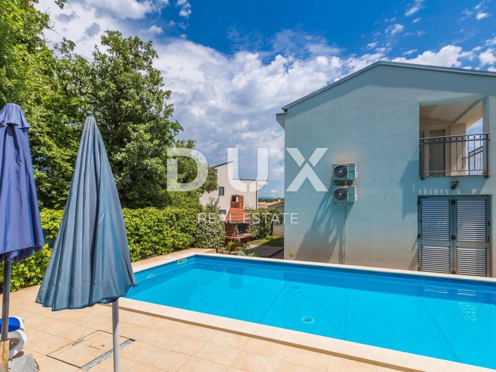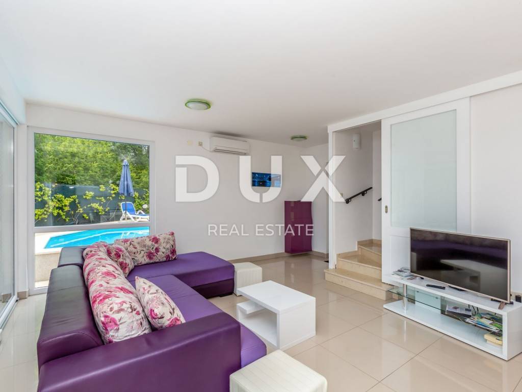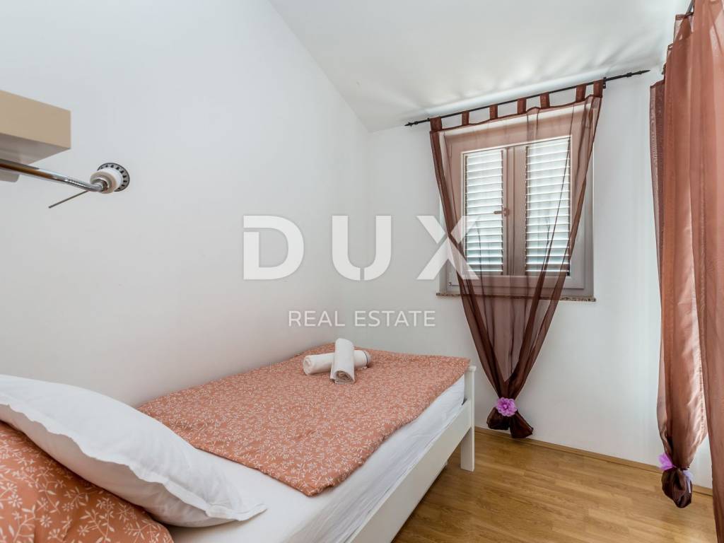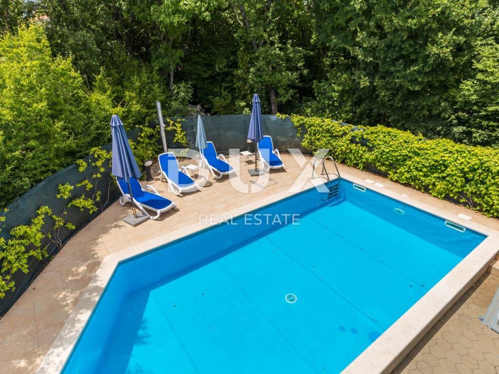 This beautiful two-story building with a total of 200 m2 is located in a small town near the town of Krk. The plot is about 700 m2 and is located about 1,200 meters from the sea. In each of the two units there is a bathroom, a kitchen, a dining room and a living room, from which there is access to a terrace and a beautifully landscaped garden with a solar-heated swimming pool, a garden, a barbecue and a children's playground. On the first floor there is a bathroom, three bedrooms and a balcony with a beautiful view. The facility is air-conditioned, and there are several parking spaces on the lot. The water and swimming pool are heated using solar collectors.