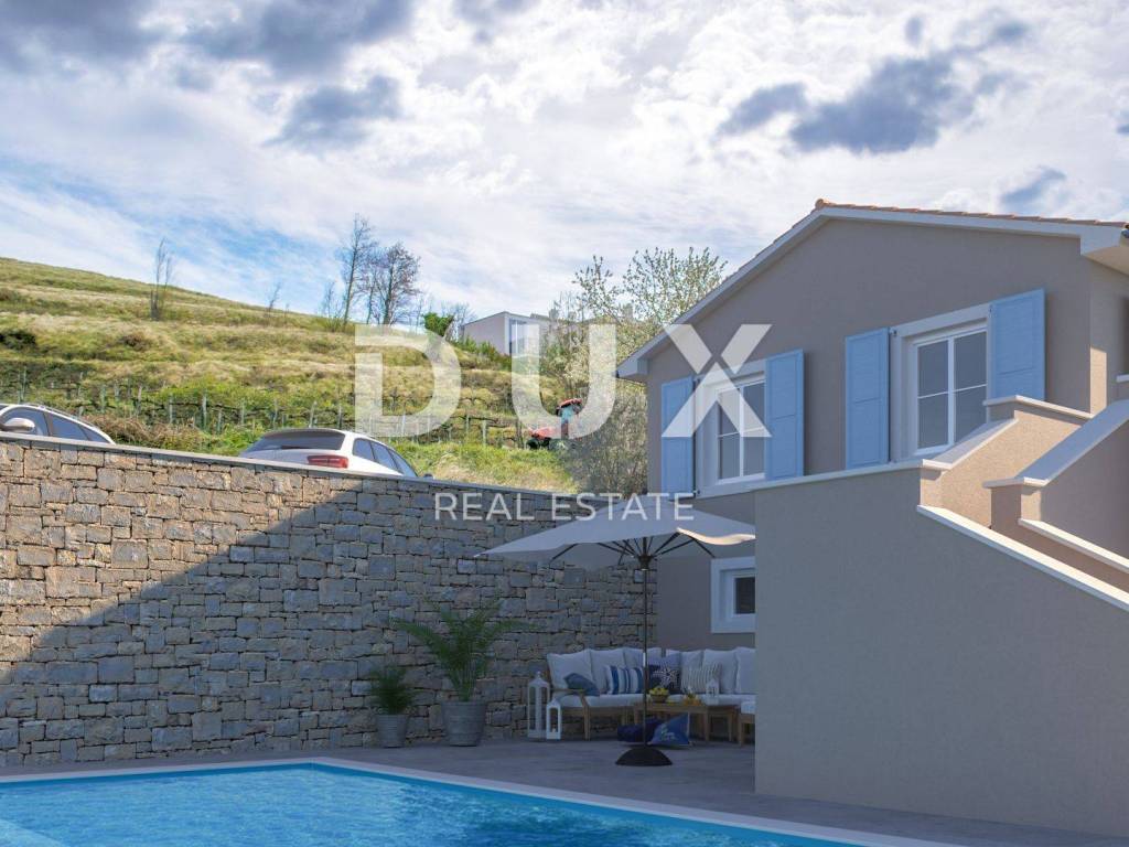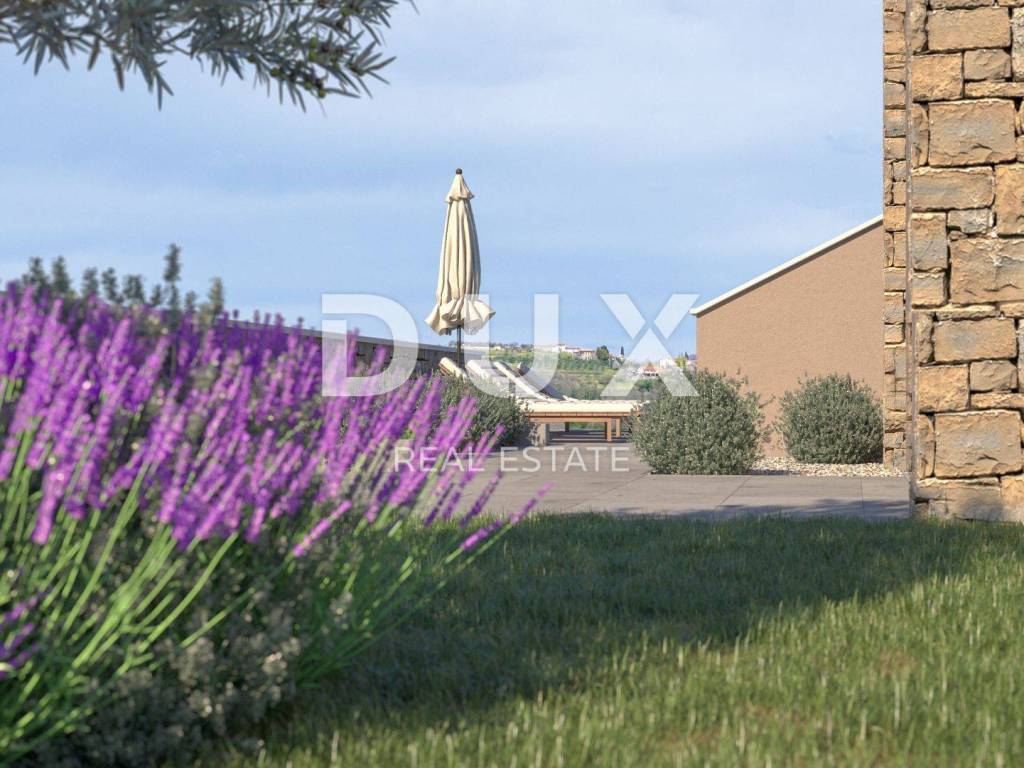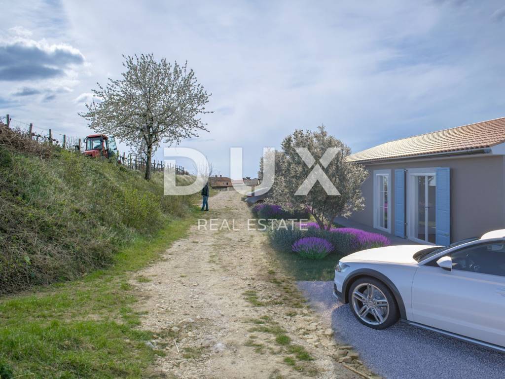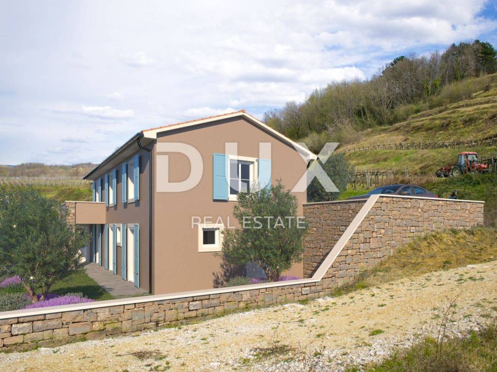 Momjan is an Istrian town with a rich history. It was first mentioned in 1035 in an imperial document, and in the 13th century a Momjan castle was built, which once had four towers, one of which is still preserved today, together with the remains of the old walls. Its microclimate is favorable for the cultivation of olives, fruit trees and vines, which is why Momjan is today called the Muscat Empire. The diverse tourist offer is enriched with a network of roads and paths that allow you to engage in sports activities such as jogging, cycling, horseback riding, off road quad or jeep adventures. The nearest beaches are about 15 kilometers away and you can enjoy the joys of the sea such as swimming, diving, sailing, water skiing, fishing. Along the wine road of the Buje region, renowned winemakers lined up, offering quality Malvasia, Teran, Refošk, Muscat and other types of wine in their wine cellars. On the olive oil roads, one of the best extra virgin olive oils in the world awaits you in special tasting rooms. The richness of the fauna - pheasants, deer, wild boars and other animals, as well as a large number of protected and unprotected songbirds, represent a real wealth and provide the basis for the development of hunting tourism. Beautiful modern villa located in an idyllic location that provides everything you need to relax and escape from city life. The villa is currently under construction. On a plot of approximately 681 m2 will be located a villa with a total area of 180 m2 on two floors. The ground floor of the villa consists of a hallway, toilet, pantry, living room, kitchen with dining area and access to a covered terrace which is connected to the garden where there is a beautiful pool of 10X3.80 m and a covered summer kitchen. The special feature of this villa is the enchanting view of the beautiful landscape of nature, vineyards and olive groves. On the first floor of the villa there is a storage room, three bedrooms and each room has a private bathroom. All rooms have access to a spacious terrace with a beautiful view of nature. The entire villa will have underfloor heating, fenkoilers for heating and cooling and a solar system for hot water consumption. The green area will have automatic irrigation. This villa is a great opportunity for family life, a luxurious vacation from the stress of city life in the Mediterranean climate or as a financial investment for rent.