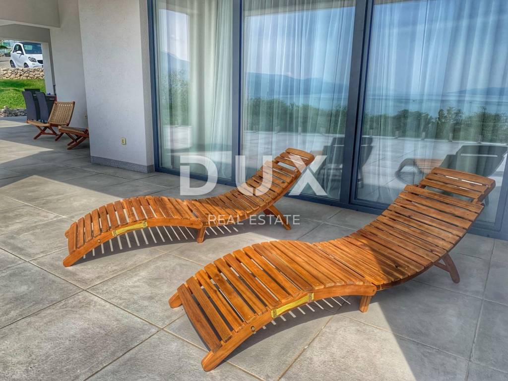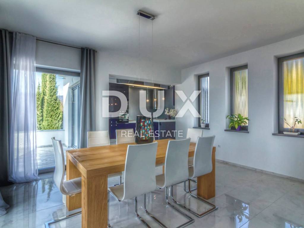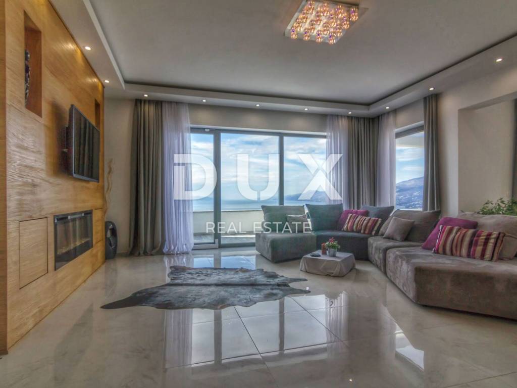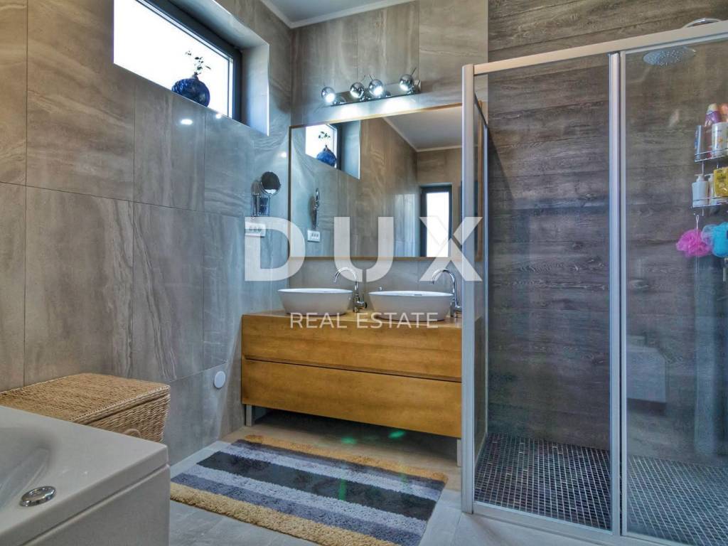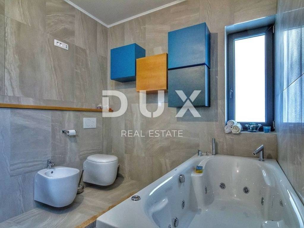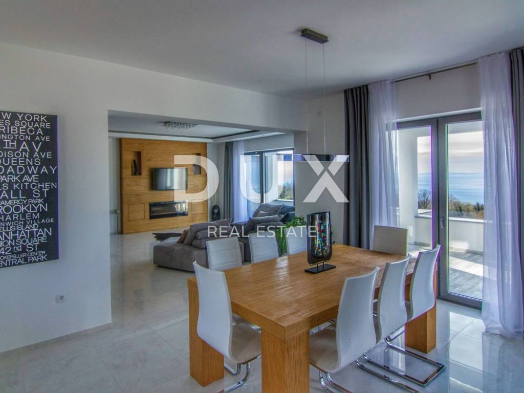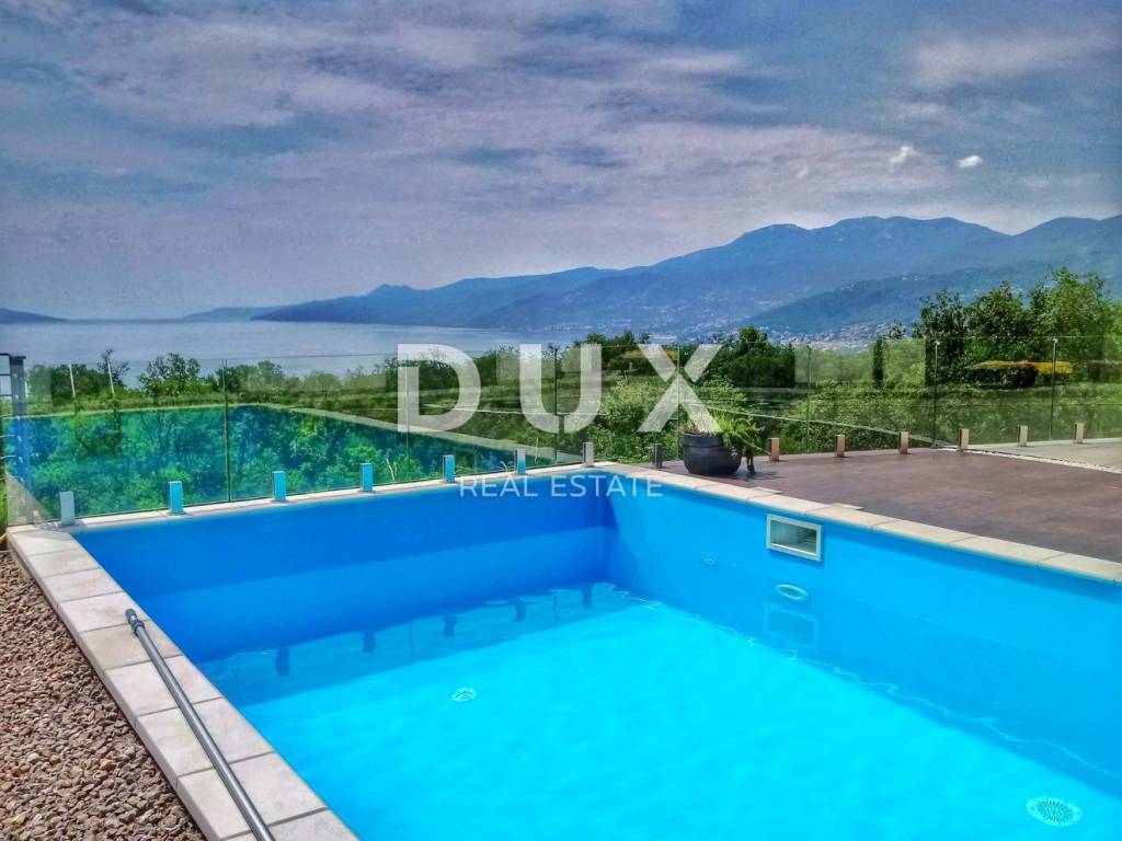 It is located in a peaceful and quiet position, yet in the immediate vicinity of all necessary amenities for a quality life. The villa / house is south-oriented with large glass walls in all rooms on the south side, so that from these rooms there is a panoramic view of the entire Kvarner Bay. The house / villa consists of two separate apartments, each with an area of approx. 195 m2. The apartments have almost the same layout, and each consists of a large living room, which is designed as a spacious open space with access to the terraces, then 3 bedrooms, 2 large bathrooms, one smaller for guests, a wardrobe and a hallway. On the spacious garden, the swimming pool and the glass fence placed on the south side stand out. The villa is well built and luxuriously equipped, all built-in materials, floor and wall coverings are of the highest standards. - 10cm thick stone wool - underfloor heating - heat pumps - high quality aluminum carpentry. It is sold fully furnished with first-class furniture and appliances. Certainly a beautiful property for a luxurious family life, but also suitable as an investment in the form of elite tourism. A UNIQUE PROPERTY DEFINITELY WORTH YOUR ATTENTION IN A GREAT LOCATION!!!