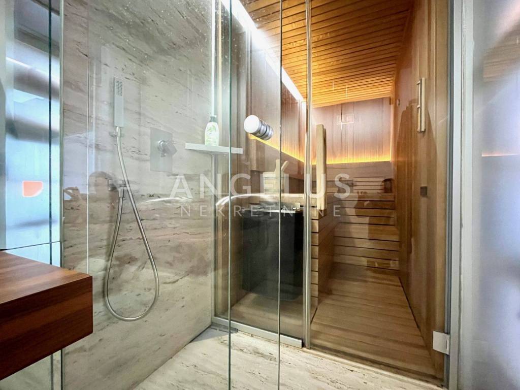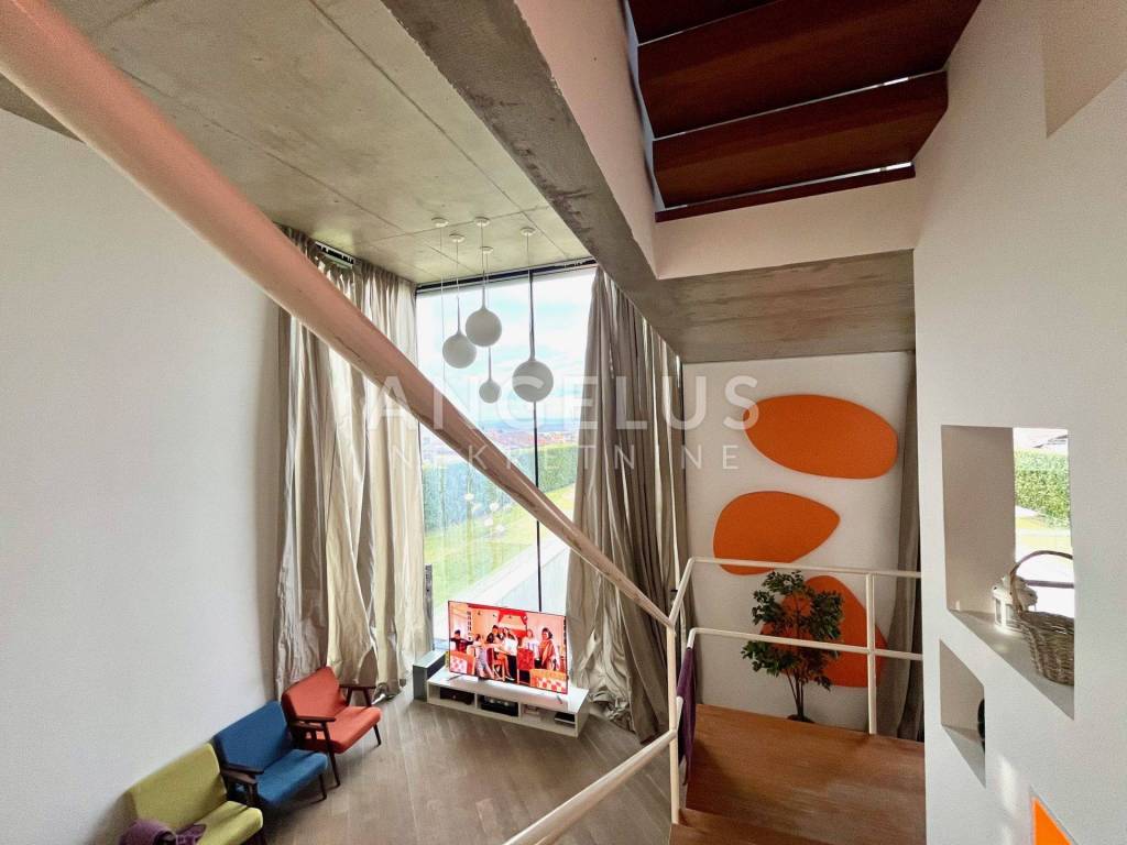 This luxurious modern house of 273m2 consists of a basement, ground floor, first floor and second floor. In the basement there is a fully equipped summer kitchen and a lounge in front of which there is a large terrace and a large sunken lounge atrium (100m2), a bathroom with a "walk-in" shower and a Finnish sauna. On the opposite side of the atrium are stairs leading down to a large garage and a small two-level office. All stairs and all supporting walls are paved with travertine stone. Under the stairs that are the communication between the atrium and the office, and the garage, there is a boiler room.