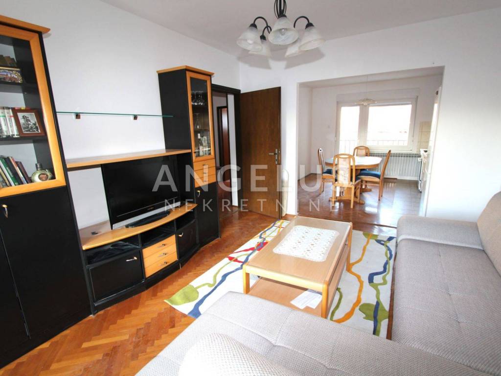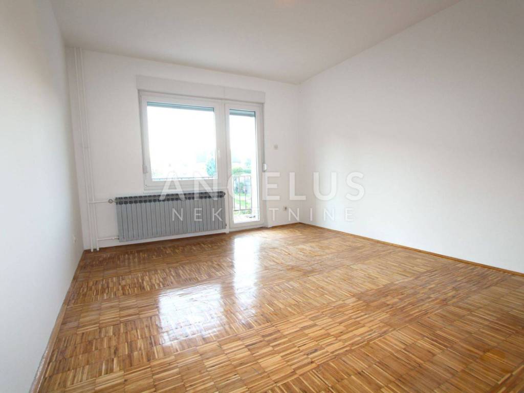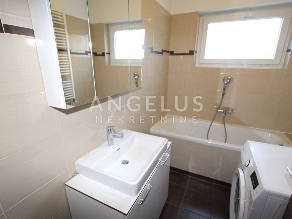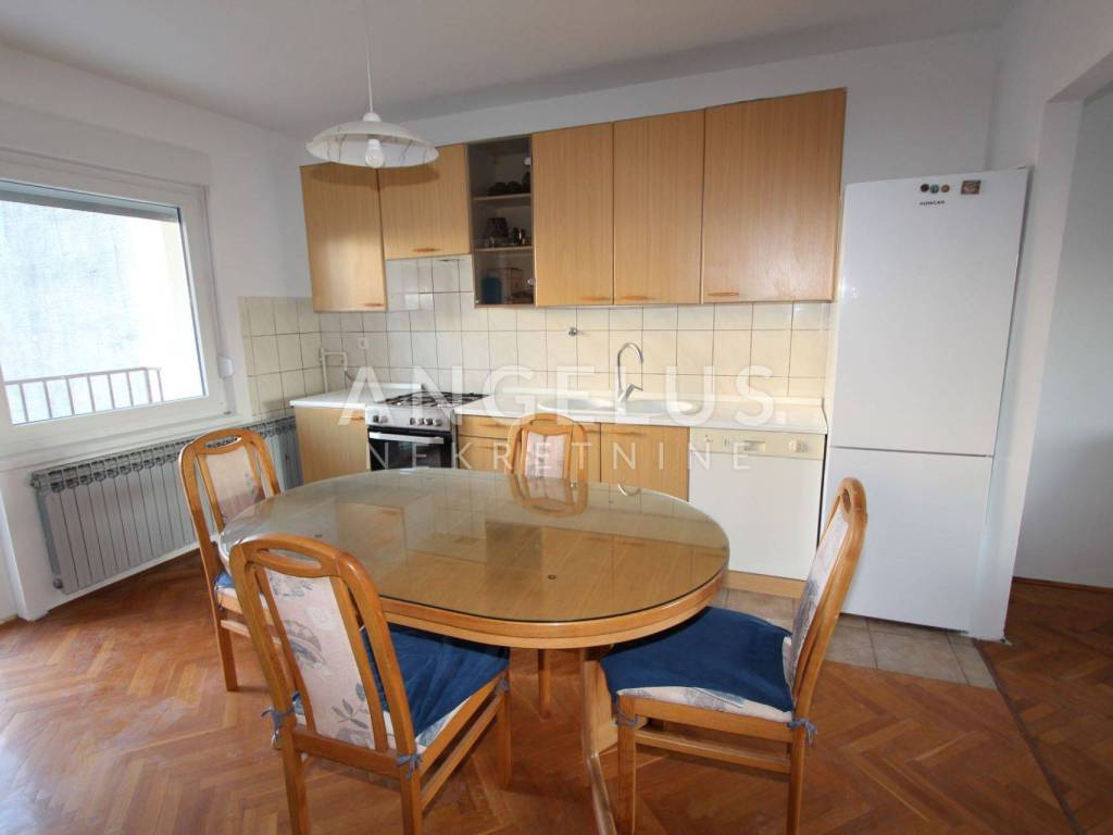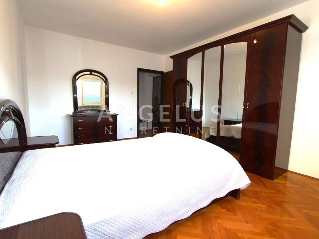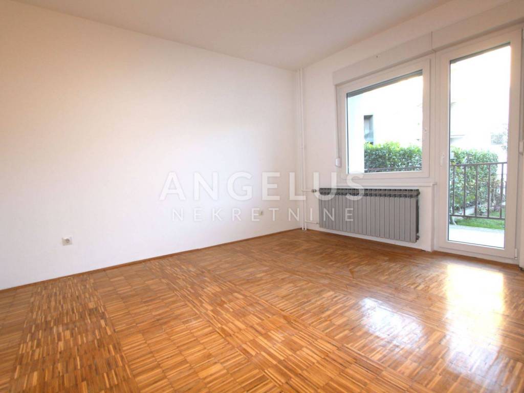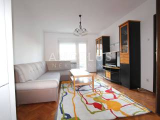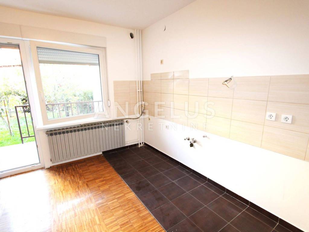 Ground floor: an apartment of a floor surface area of 100m2 consisting of a hallway, two bedrooms, bathroom and a separate restroom, and an open-space kitchen, living and dining room with access to the backyard that is partly paved and partly covered in grass.