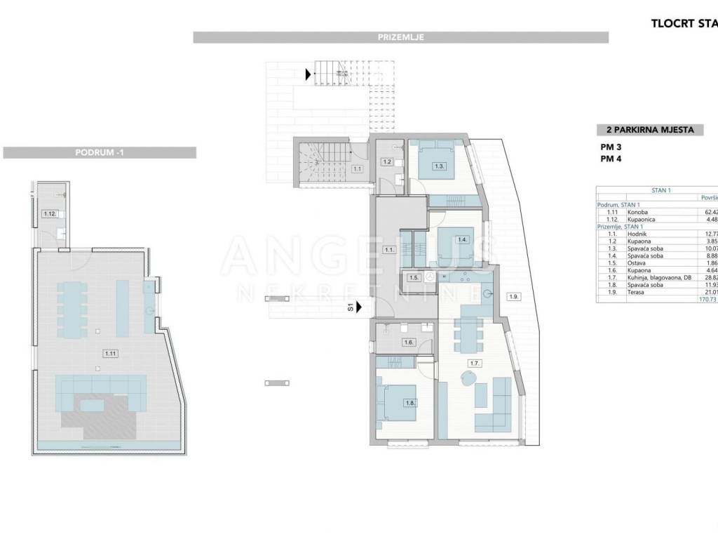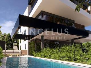 The living room leads to a spacious outdoor terrace of 83.7m2 with a kitchen, a sundeck, a garden and a 20.70m2 swimming pool. The apartment also has a basement with a total area of 69m2, which can be arranged as a space for socializing or storage, and has an additional bathroom. The apartment on the ground floor has two covered parking spaces. The property was built with high-quality and modern materials, high-quality brick, which guarantees excellent thermal and sound insulation. All rooms in the apartment are air-conditioned, and the heating is underfloor. The floor coverings consist of parquet and high-quality ceramics, while the joinery is aluminum.