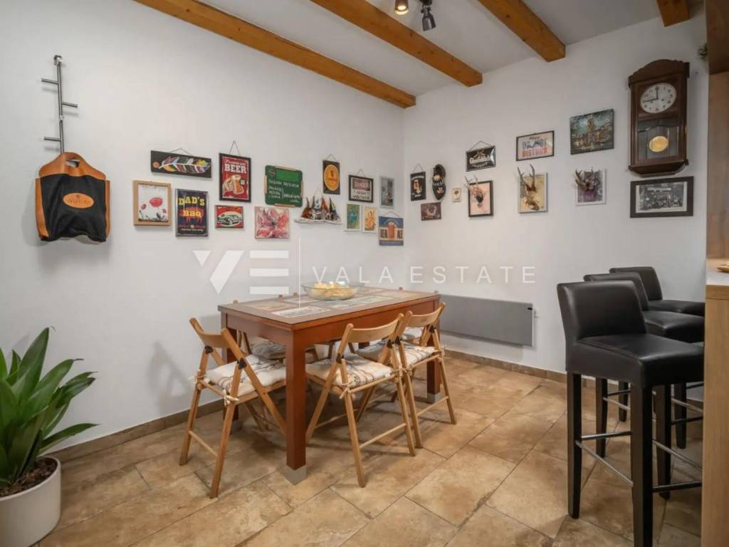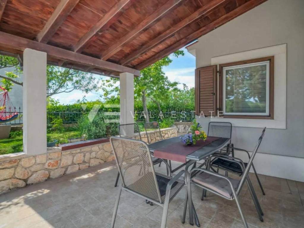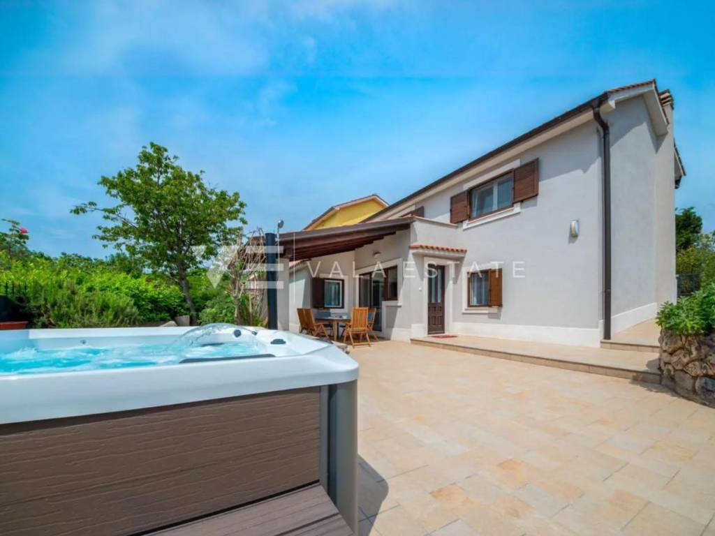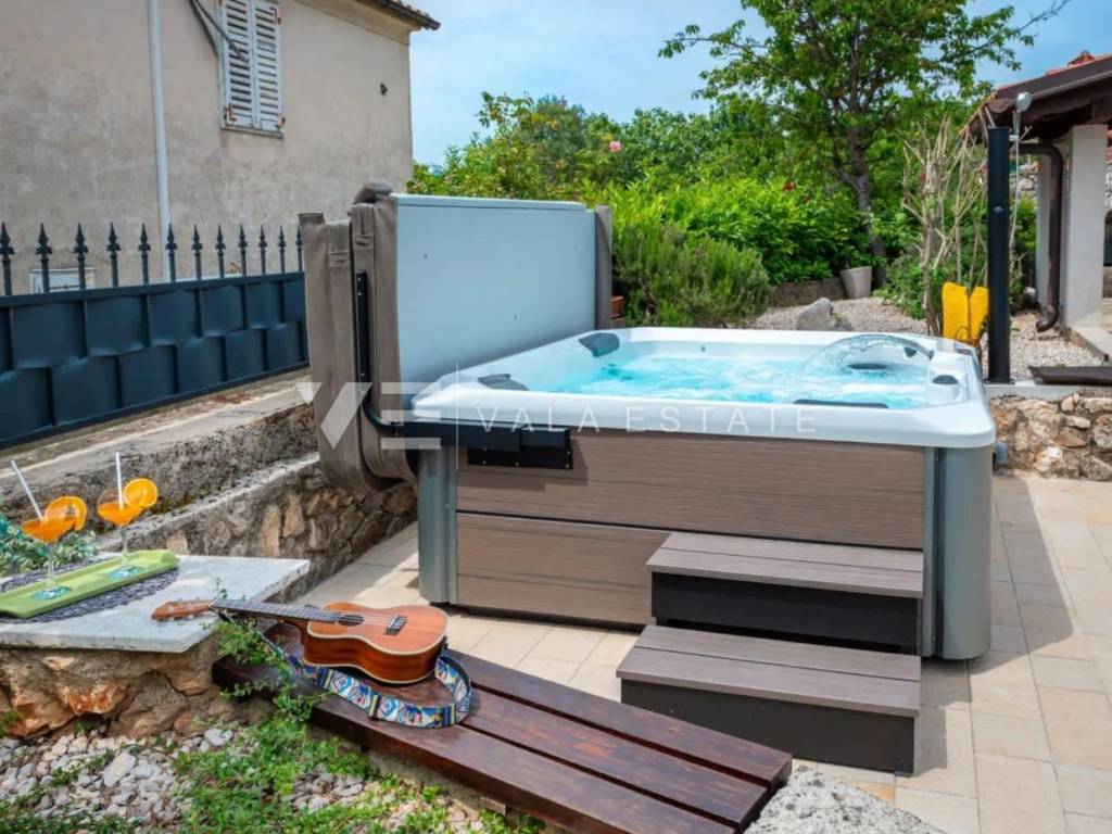 Real estate island of Krk, Dobrinj area - in a beautiful location in a quiet environment, a renovated semi-detached house with a landscaped garden is for sale. The house has a living area of 169 m2 and extends over the ground floor and first floor. On the ground floor there is an entrance porch, bathroom, socializing room, a space that combines the kitchen and dining room and living room. On the first floor there are two bedrooms and a spacious terrace. The garden full of greenery and Mediterranean plants occupies 400 m2, it is beautifully cared for and maintained and there is a jacuzzi, sunbathing area and a covered terrace. Four parking spaces and a beautifully landscaped storage room of 20 m2 are located across the road on an area of 270 m2. Quality materials, joinery and flooring were used during the renovation. The house is air-conditioned, has electric radiators and a wood-burning stove, is fully equipped and furnished and is ready to move in immediately. The location is quiet, 4000 m from the beach. It is categorized as a holiday home and is an excellent opportunity for investment in an already very well-established business. Vala Estate Malinska Agency will provide you with a safe and transparent transfer of ownership and all necessary documentation.
