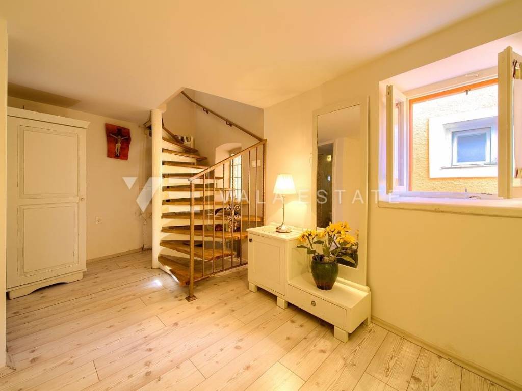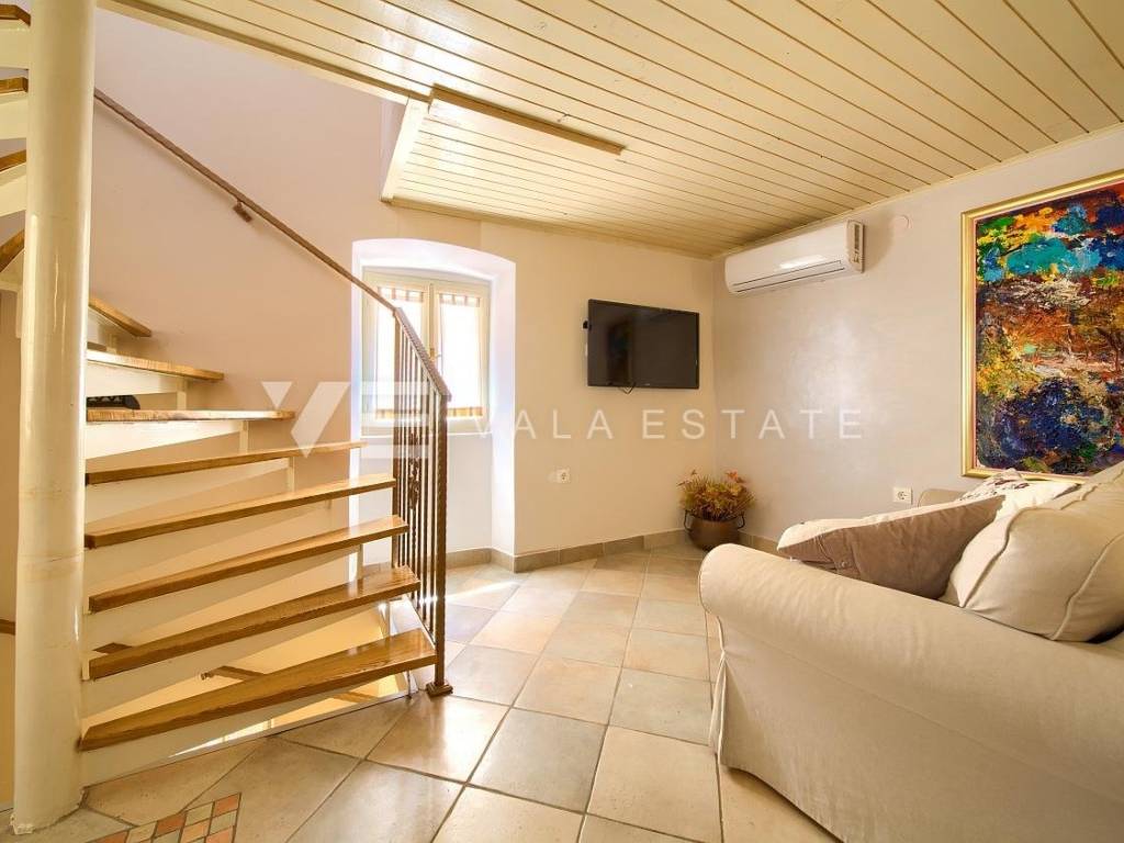 Real estate island Krk, Vrbnik - for sale is a renovated stone house in a row located in the old town center of Vrbnik. It consists of 4 floors connected by an internal staircase with a total living area of 72 m2. In the basement there is a tavern that has preparation for connection, an opening in the concrete slab, where a staircase can be built. The ground floor consists of a small terrace at the entrance, kitchen, dining room and living room. On the first and second floor there are one bedroom each with its own bathroom. The house was renovated in 2012, fully furnished and equipped, it is air-conditioned, has high-quality wooden joinery and is ready for immediate occupancy. It is located in the very center of the old city center, close to all necessary facilities and only a few minutes' walk from the sea and the first beaches. It is ideal for investment for the purpose of tourist rental, but also for all lovers of coastal architecture.