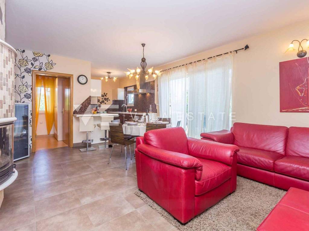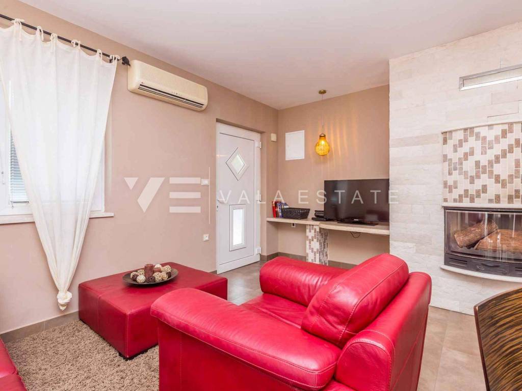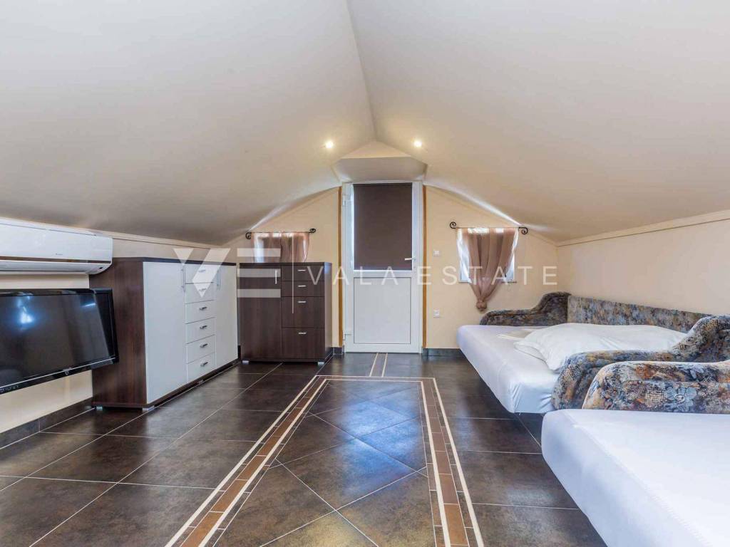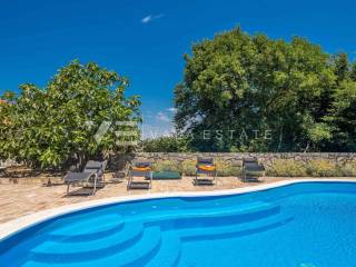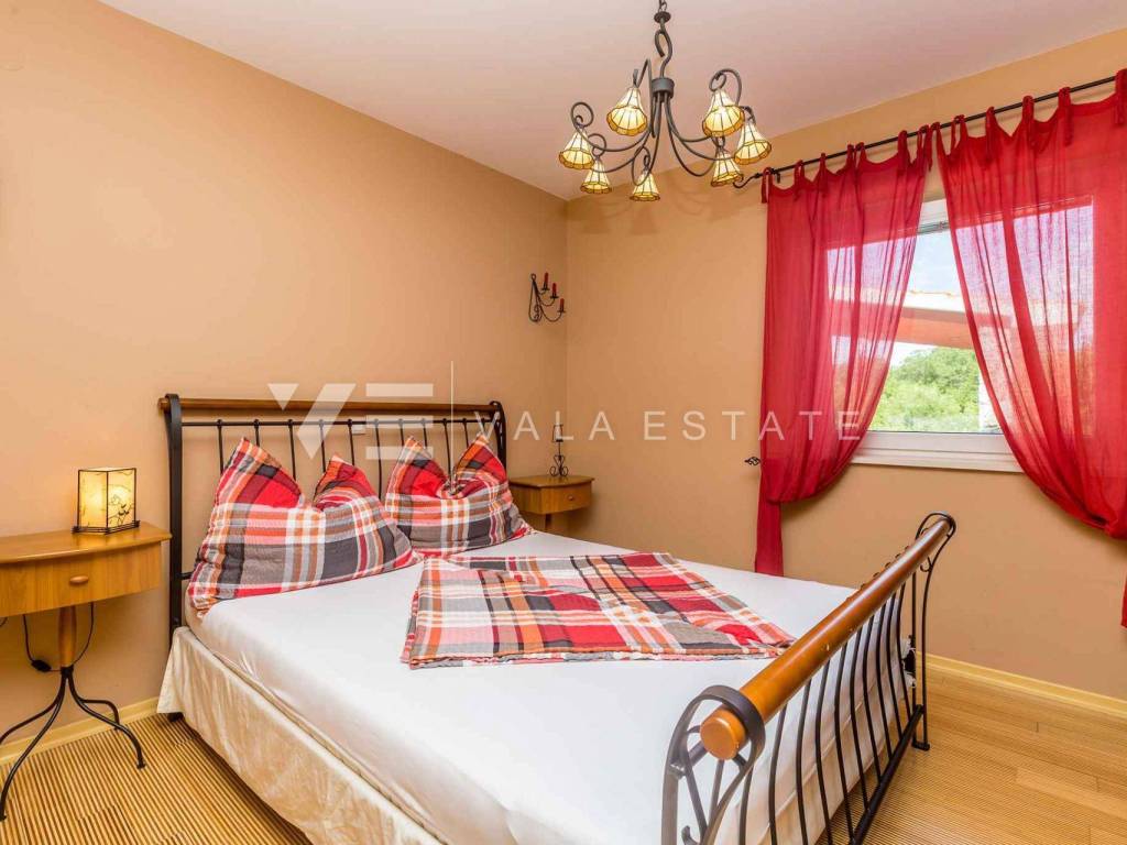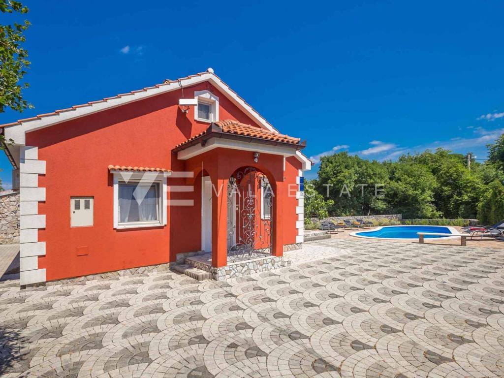 Real estate island Krk, Dobrinj - for sale is a detached house on the edge of the green with a total living area of 110 m2. The ground floor includes an entrance hall, a bathroom, three bedrooms, a space that unites the kitchen, dining room and living room with access to the terrace. The attic is arranged as a studio apartment with a separate external entrance. In the garden there is a terrace, a swimming pool with a sunbathing area, a garden house with a summer kitchen, a fireplace, and several parking spaces. The house is fully furnished and equipped, it has PVC joinery with built-in mosquito nets, a fireplace from which heating is carried out throughout the house, and it is air-conditioned. The location is beautiful and peaceful, surrounded by greenery and forest, 3000 m from the beaches and 1000 m from the center. It is ideal for lovers of nature, peace and quiet or as an excellent investment in tourism because it has already been categorized and is rented for tourist purposes.