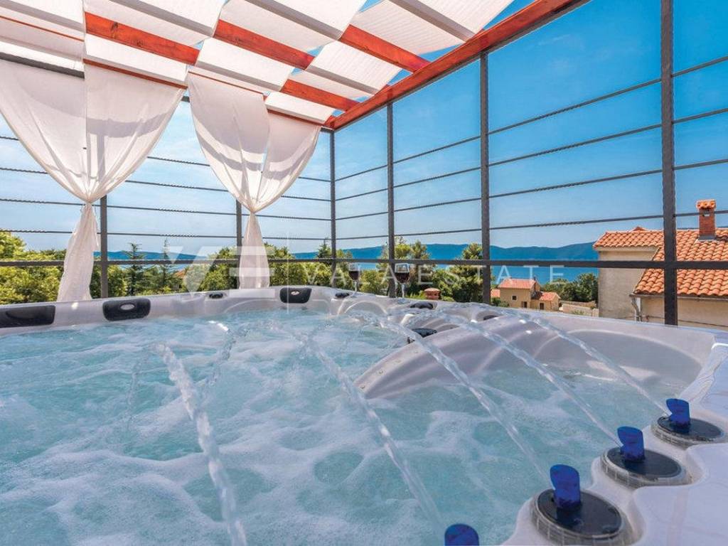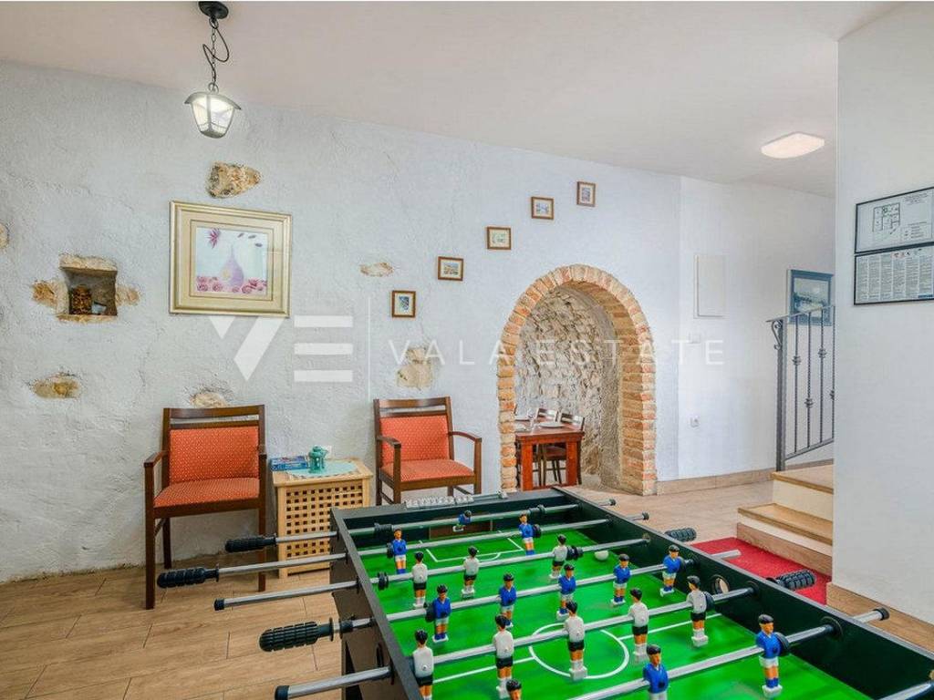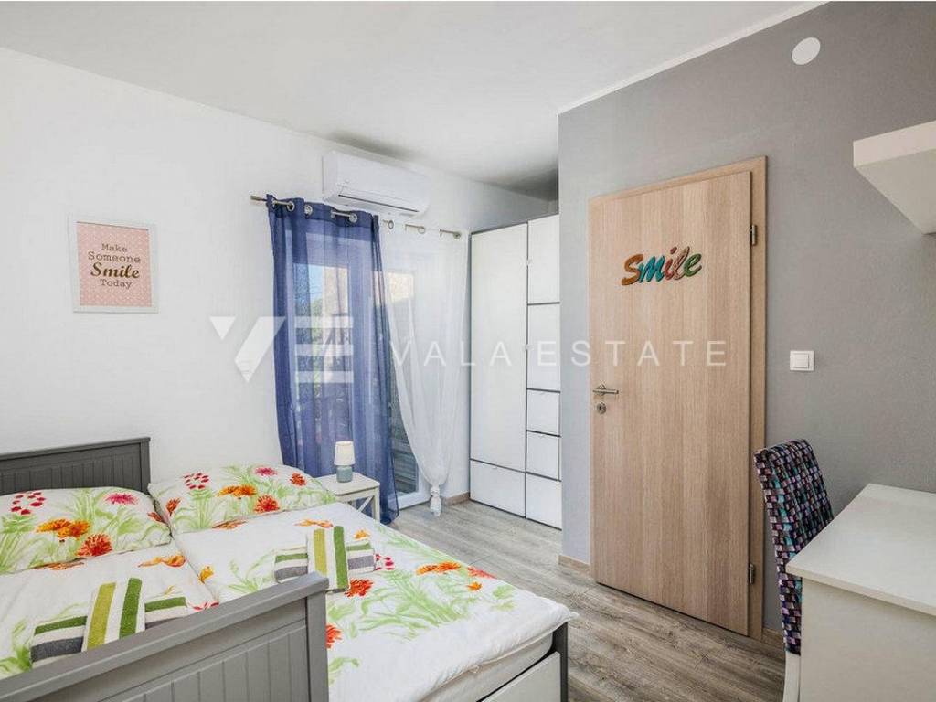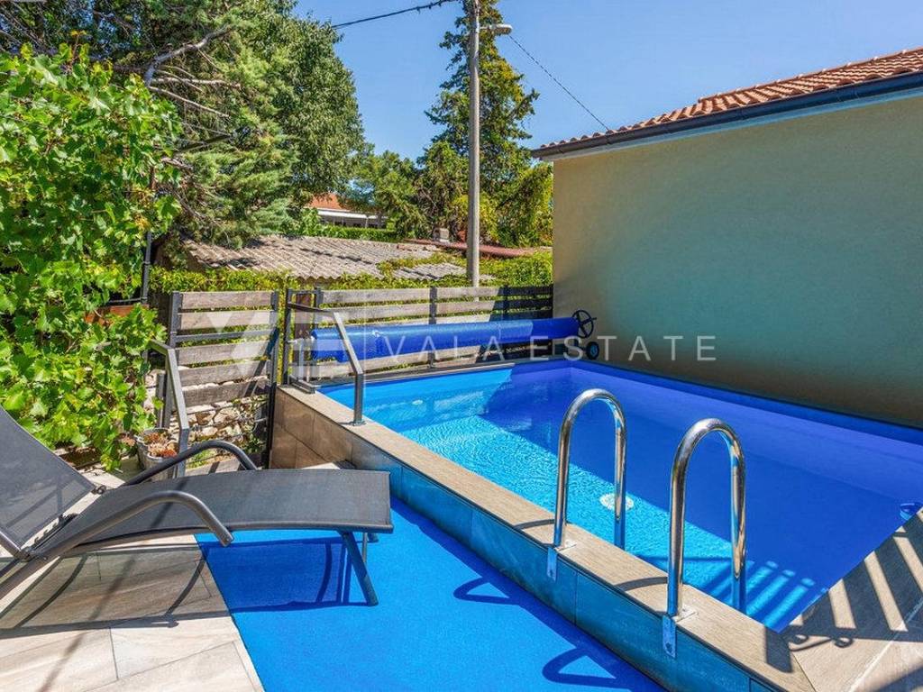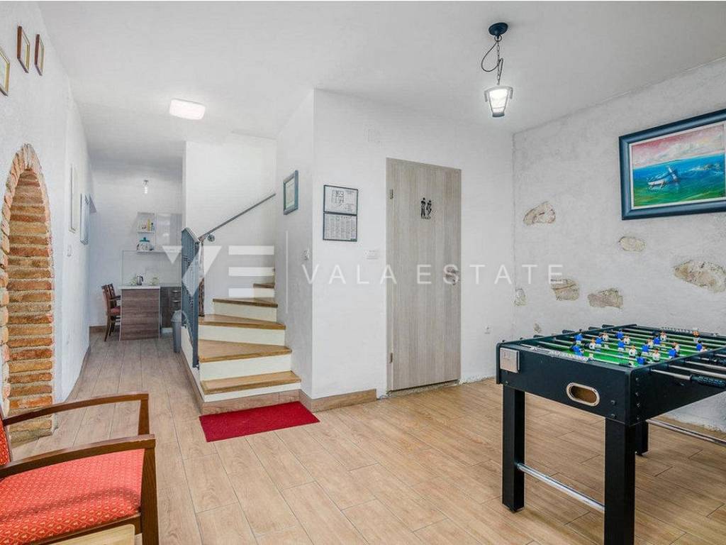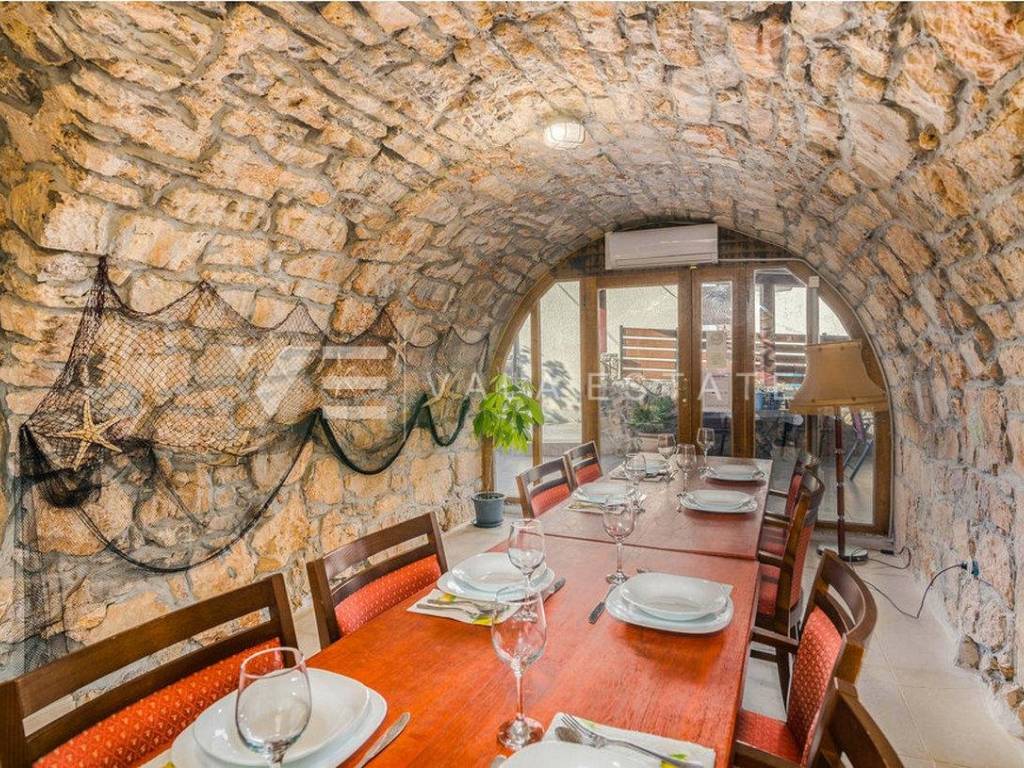 Real estate on the island of Krk, around the town of Krk - for sale is a renovated stone house in a row located in an excellent location only 700m from the sea and beautiful beaches. The house is distributed on the ground floor where there is a living room, a kitchen with a dining room, a toilet and a storage room with a separate tavern with an additional room for entertainment and an upper floor where there are four bedrooms with attached bathrooms and a shared toilet. Two bedrooms have access to the balcony, while the remaining two have access to the terrace and yard where there is a sun deck, swimming pool and barbecue. On the roof terrace with a beautiful view of the sea, there is a Jacuzzi and a relaxation zone. The house is air-conditioned, sold fully furnished and ready to move into. There are several parking spaces in the garden of the house.