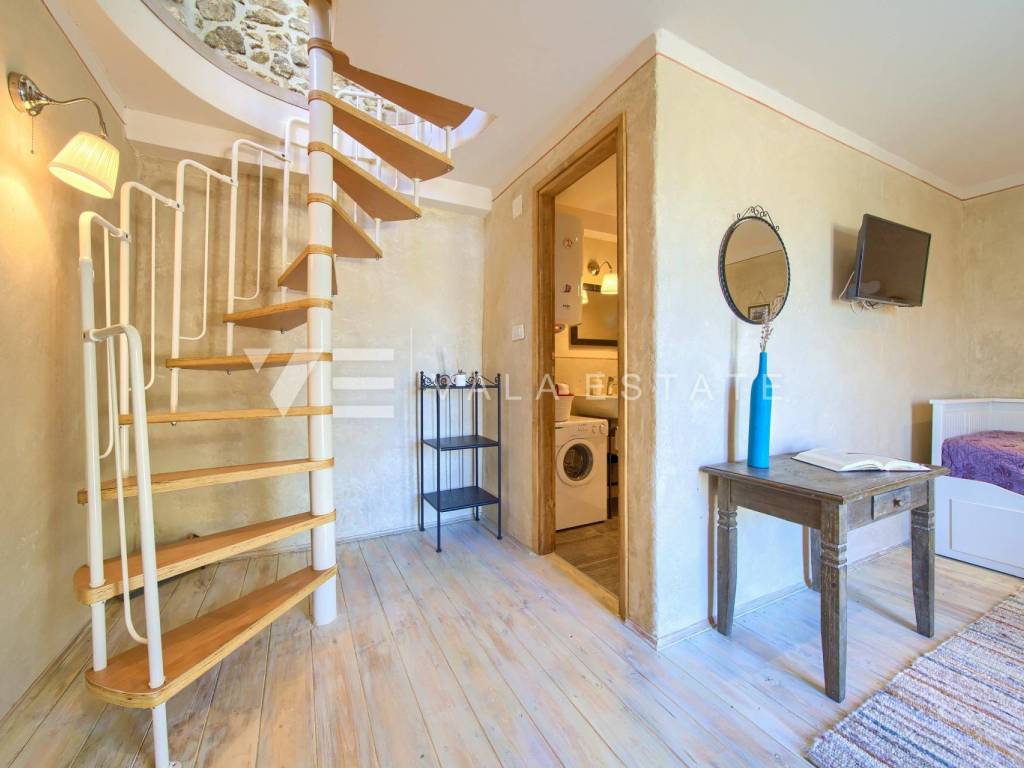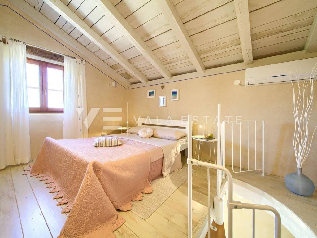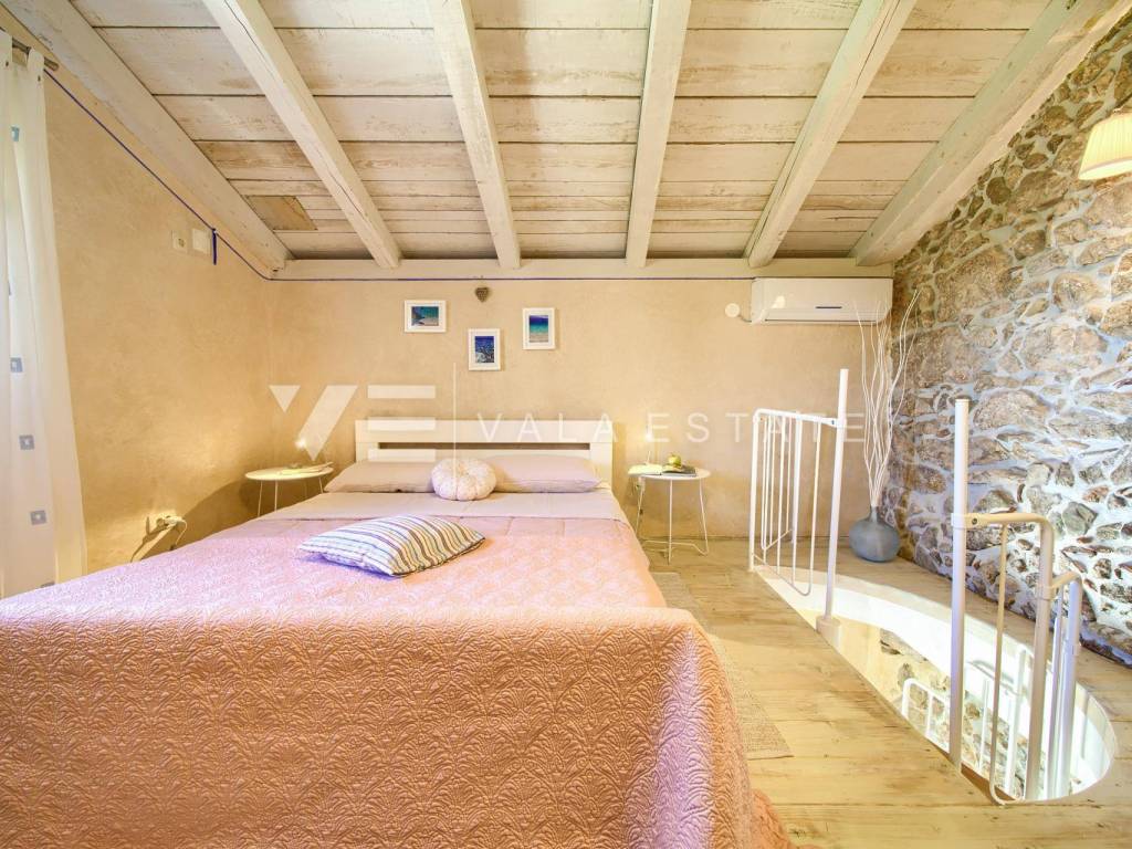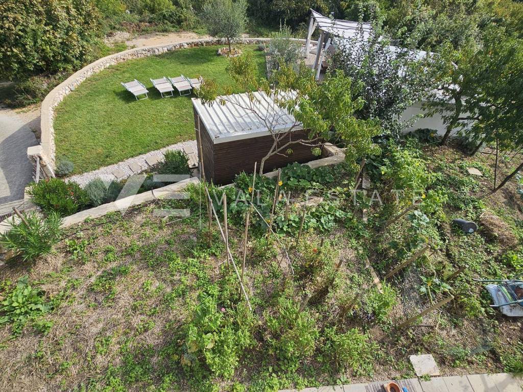 Real estate island Krk, Dobrinj - for sale is a new Mediterranean semi-detached house with a beautifully landscaped garden on the edge of the green zone. The house occupies a living area of 71.47 m2 and is divided into a ground floor, a first floor and a high attic, which are connected by internal stairs. On the ground floor there are two bedrooms and a bathroom, on the first floor there is a space that combines the kitchen, dining room and living room with access to a large terrace of 10 m2 with a beautiful view of the forest. In the attic there is a spacious bedroom with its own bathroom. Quality building materials were used in the construction of the house, the house is air-conditioned, has a wood-burning stove, quality PVC and wooden joinery, is fully equipped with quality equipment and is very tastefully furnished and is being sold as such. The yard full of greenery and Mediterranean plants occupies 450 m2, it is well maintained and has an outdoor grill, a summer kitchen with a terrace for socializing, a jacuzzi, a sunbathing area, an additional building with a sauna with a toilet and space for two parking spaces. The location is quiet, surrounded by greenery, about 3,000 m from the sea and in the immediate vicinity of the town center, which offers all the basic facilities - a shop, post office, clinic, school, restaurant and museums. This charming house is ideal for all lovers of a peaceful vacation, but it is also a good opportunity for investment for tourist rental purposes.