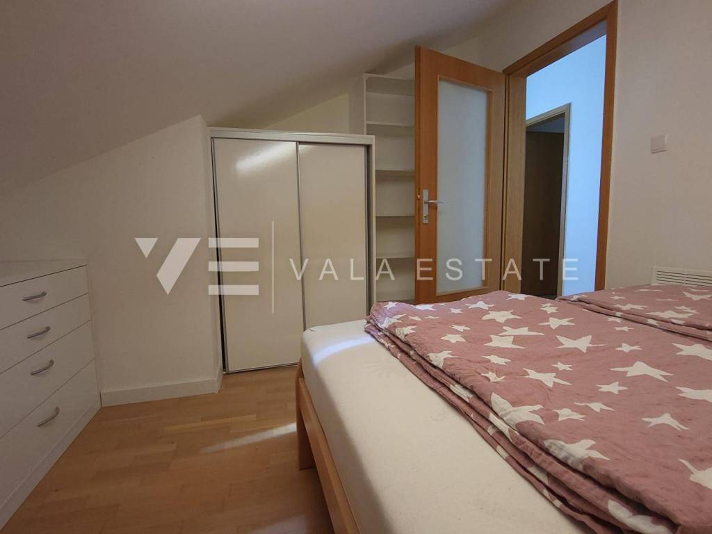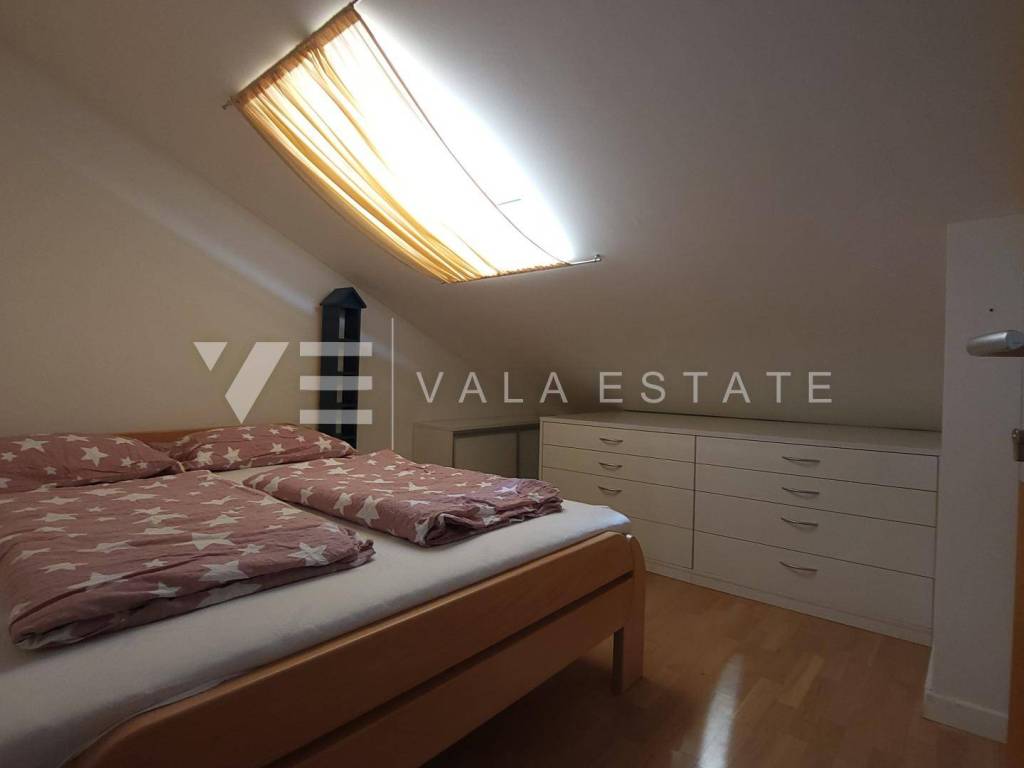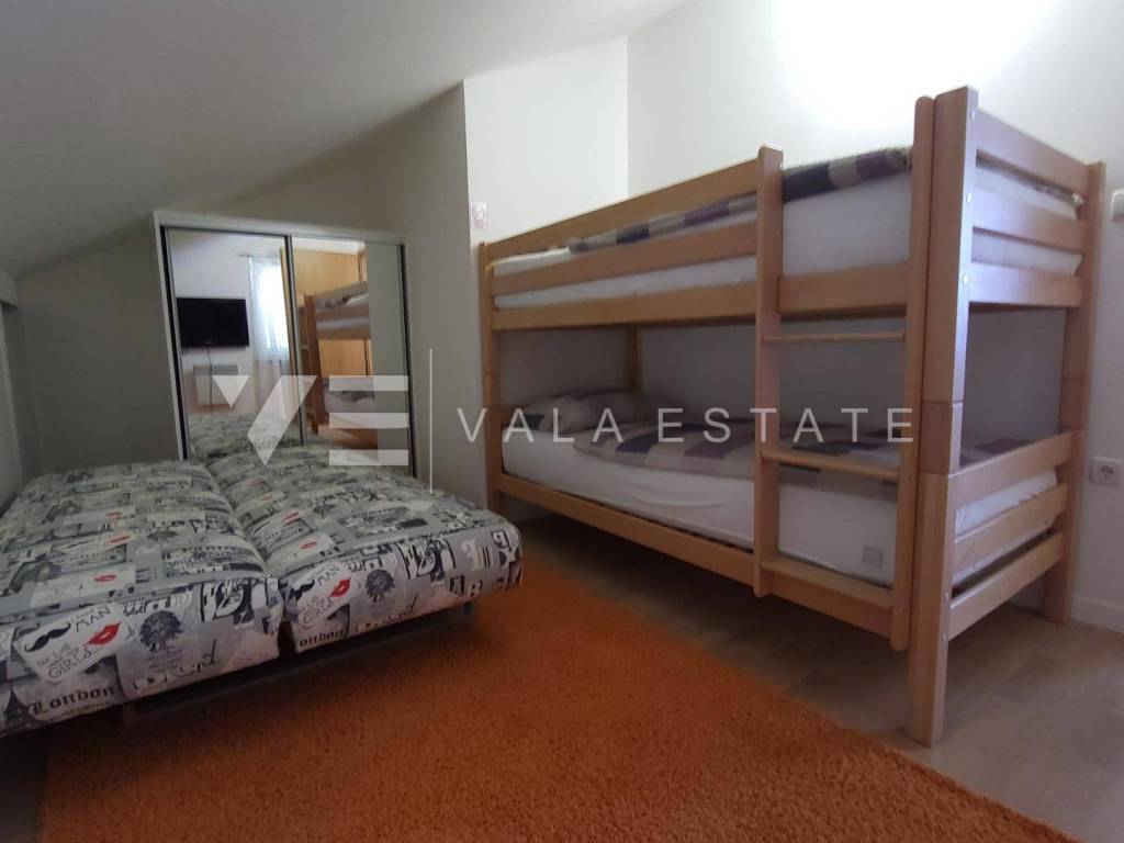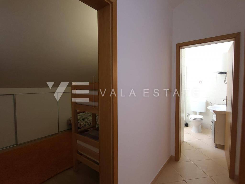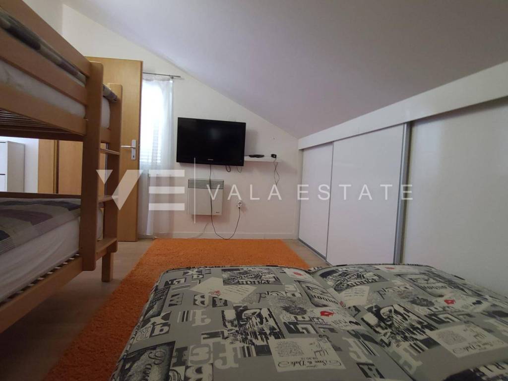 Real estate island of Krk, Dobrinj area - for sale is a two-story apartment with an area of 88.39 m2, located on the first floor and high attic of a multi-family house in an excellent location only 400 m from the beaches, the center and all amenities. It consists of an entrance hall, a storage room, a bathroom, a bedroom, a kitchen with a dining room and a living room with access to a covered terrace on the first floor, and a hallway, two bedrooms and a bathroom in the high attic. The apartment has a partial view of the sea, is air-conditioned, fully furnished, has proper documentation and is ready for immediate occupancy. It has one parking space in the common courtyard of the building and a beautifully landscaped garden with a barbecue of 37 m2.