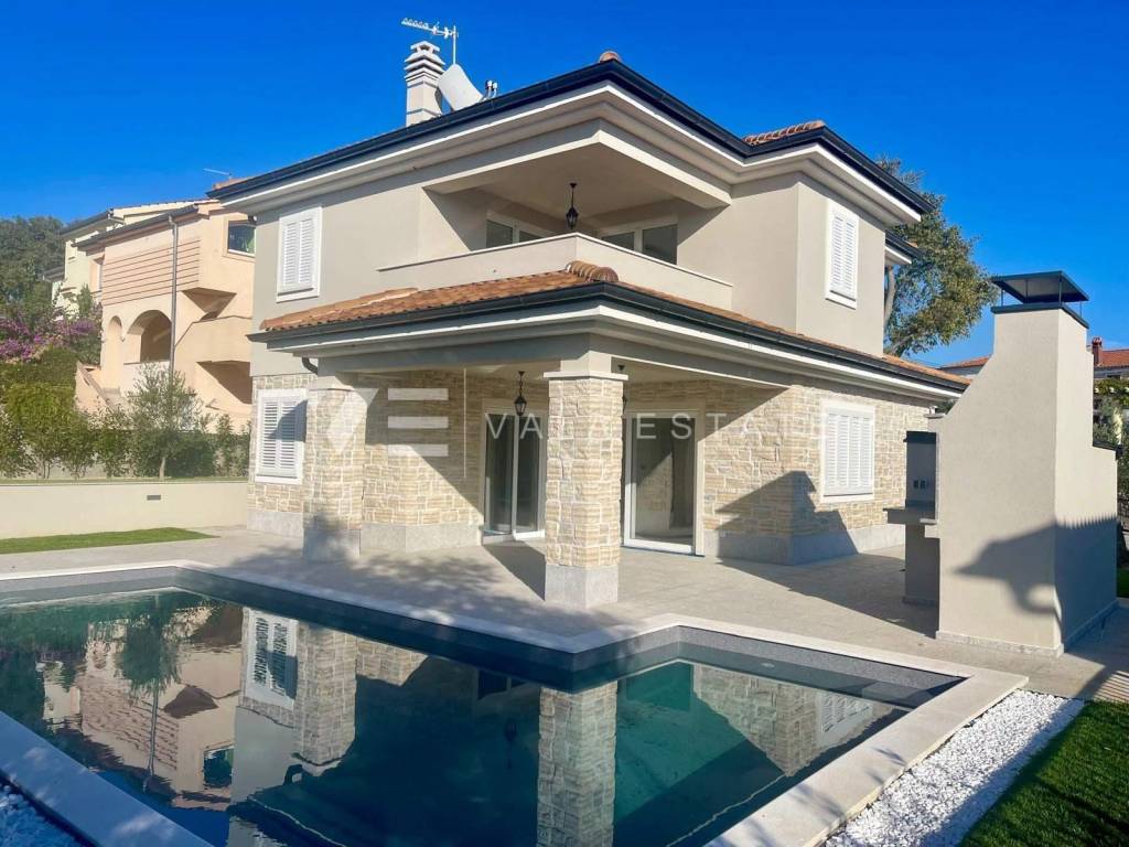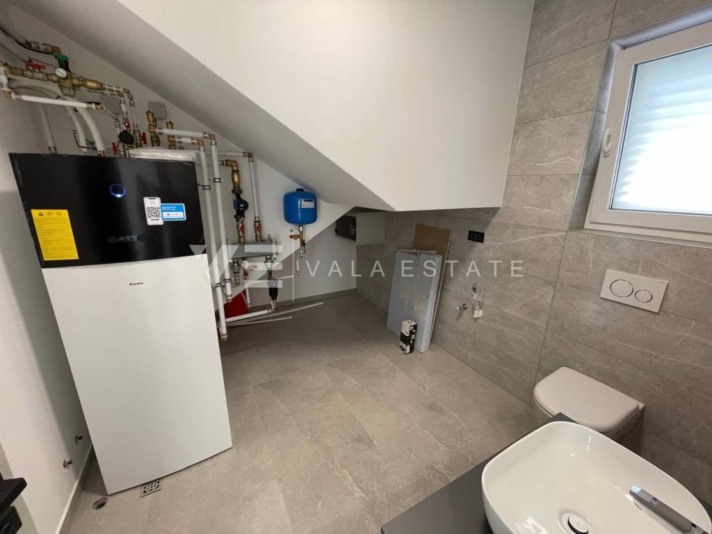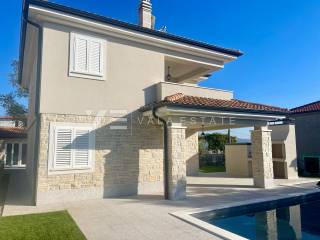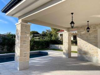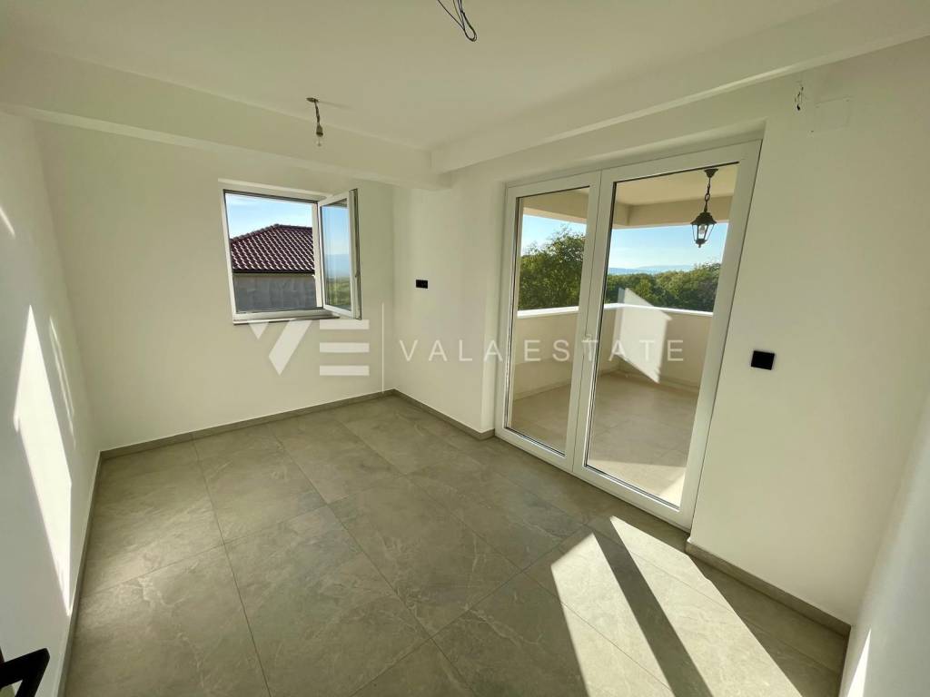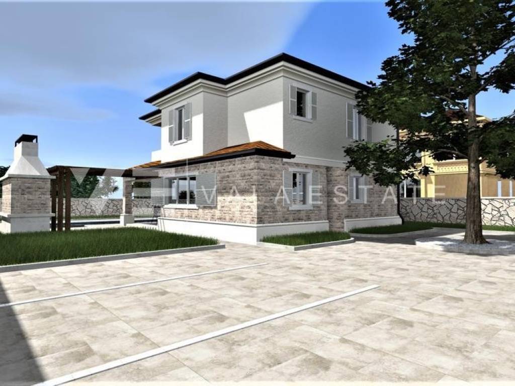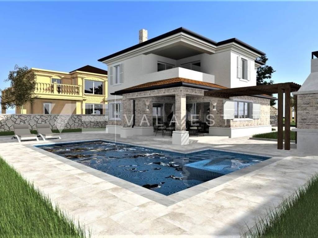 Real estate on the island of Krk, around Vrbnik - for sale is a new villa, designed in Mediterranean style in a quiet location near Vrbnik. The living area of the villa of 137 m2 is distributed over the ground floor and first floor. The ground floor includes an entrance hall, a bathroom, a kitchen with a dining room and a spacious living room with access to the terrace. Upstairs there are three bedrooms, two bathrooms, and two rooms have access to a common terrace with a partial view of the sea. On the garden of 550m2, there is an auxiliary building, a large heated pool, a sundeck and a summer kitchen surrounded by lawns and Mediterranean plants with an irrigation system. The villa is decorated with high-quality materials, air conditioning, solid fuel fireplace, high-quality ceramics, PVC carpentry, underfloor heating with a heat pump and preparation for solar panels. There are two parking spaces in the garden. The location where it is located is surrounded by greenery and peace and is 5000 m from the sea, beautiful beaches and all facilities. The villa is under construction and completion is expected in the summer of 2023.