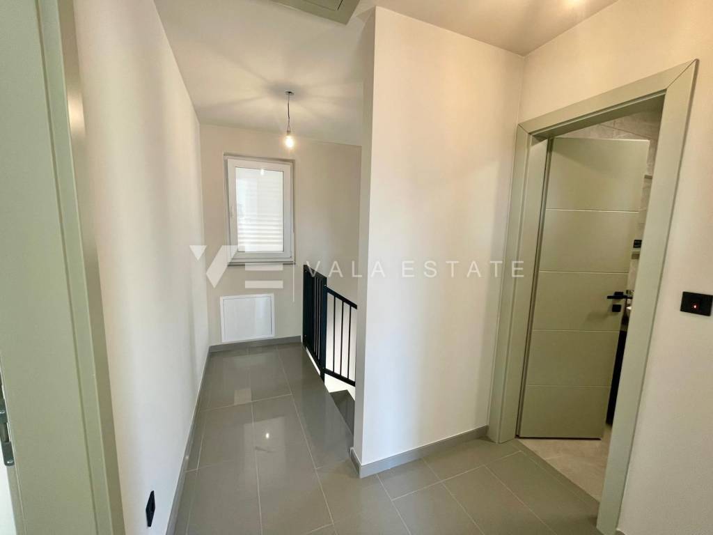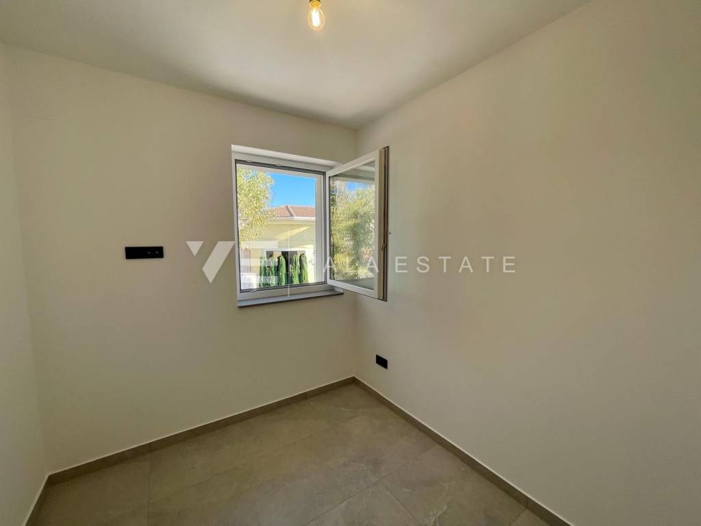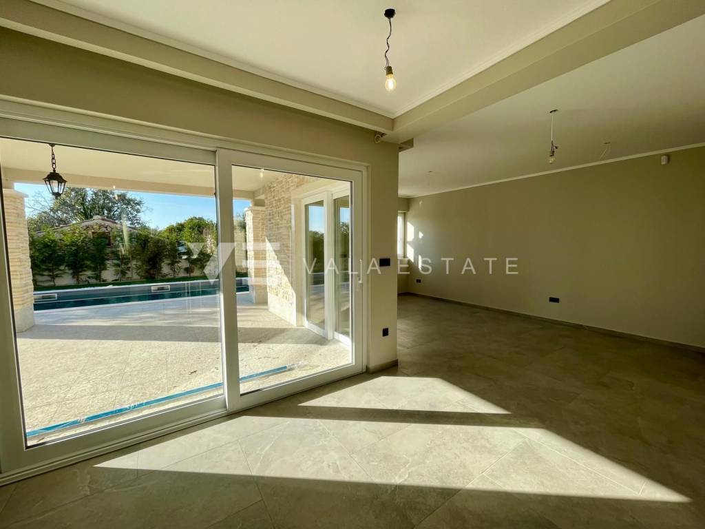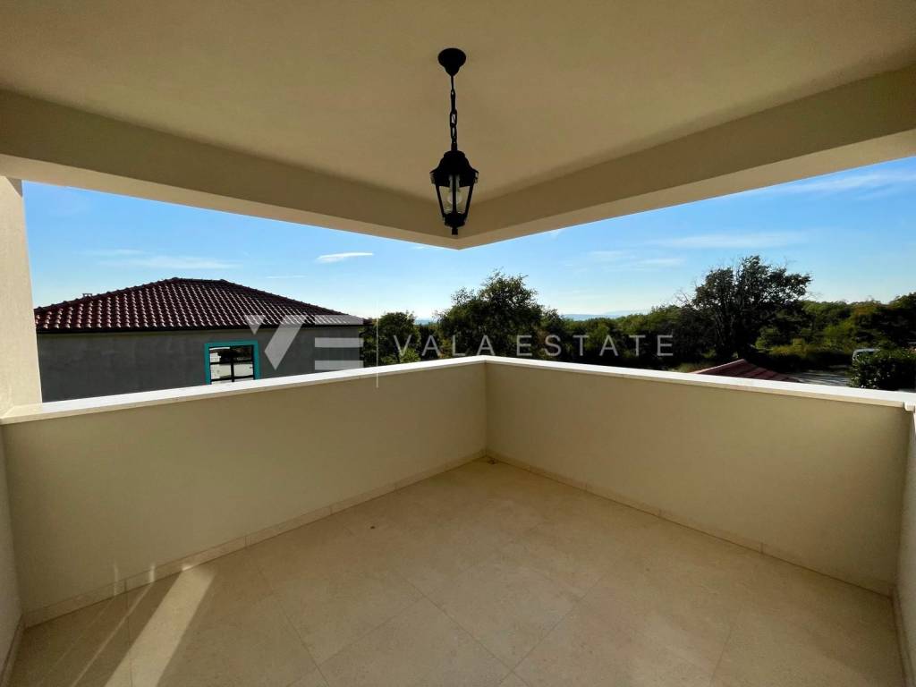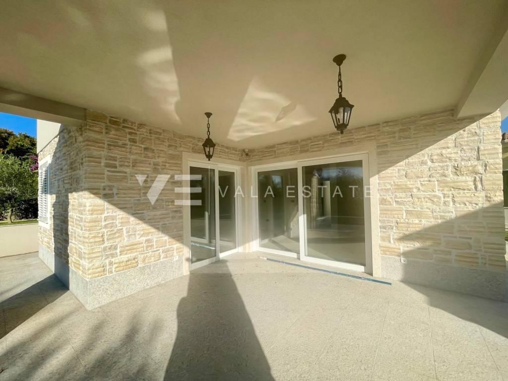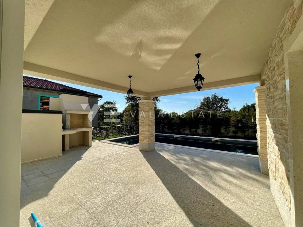 Real estate on the island of Krk, around Vrbnik - for sale is a new villa, designed in Mediterranean style in a quiet location near Vrbnik. The living area of the villa of 137 m2 is distributed over the ground floor and first floor. The ground floor includes an entrance hall, a bathroom, a kitchen with a dining room and a spacious living room with access to the terrace. Upstairs there are three bedrooms, two bathrooms, and two rooms have access to a common terrace with a partial view of the sea. On the garden of 550m2, there is an auxiliary building, a large heated pool, a sundeck and a summer kitchen surrounded by lawns and Mediterranean plants with an irrigation system. The villa is decorated with high-quality materials, air conditioning, solid fuel fireplace, high-quality ceramics, PVC carpentry, underfloor heating with a heat pump and preparation for solar panels. There are two parking spaces in the garden. The location where it is located is surrounded by greenery and peace and is 5000 m from the sea, beautiful beaches and all facilities. The villa is under construction and completion is expected in the summer of 2023.