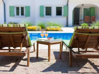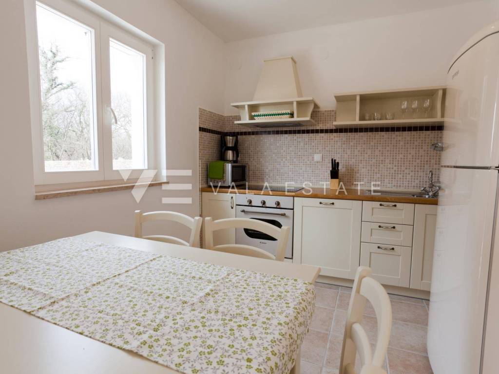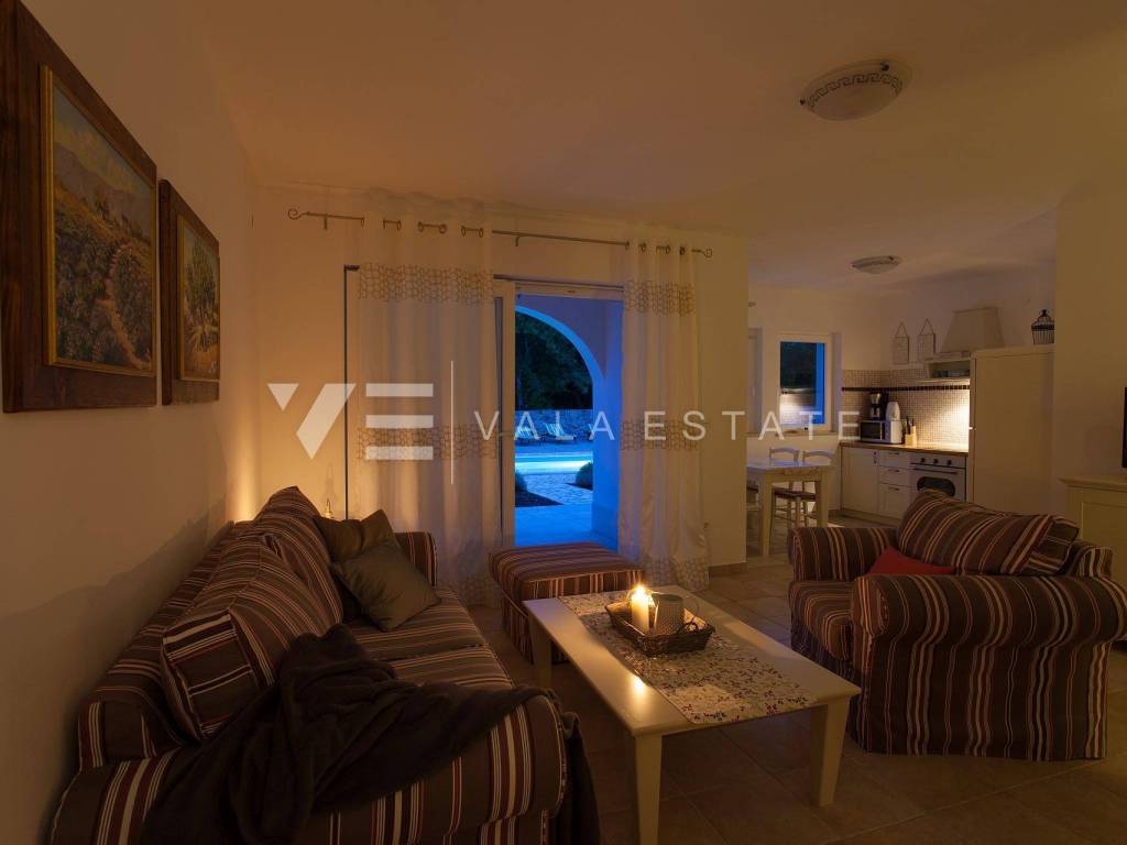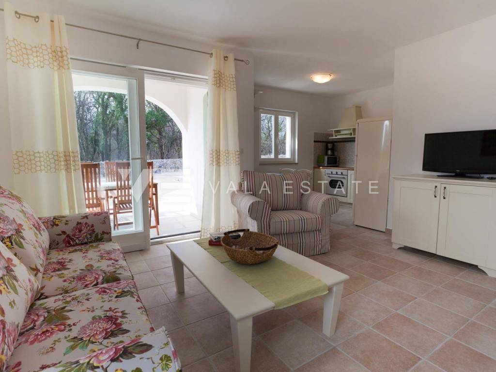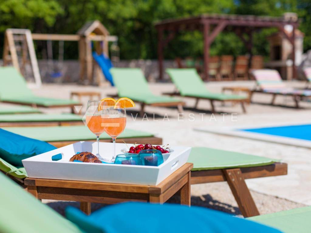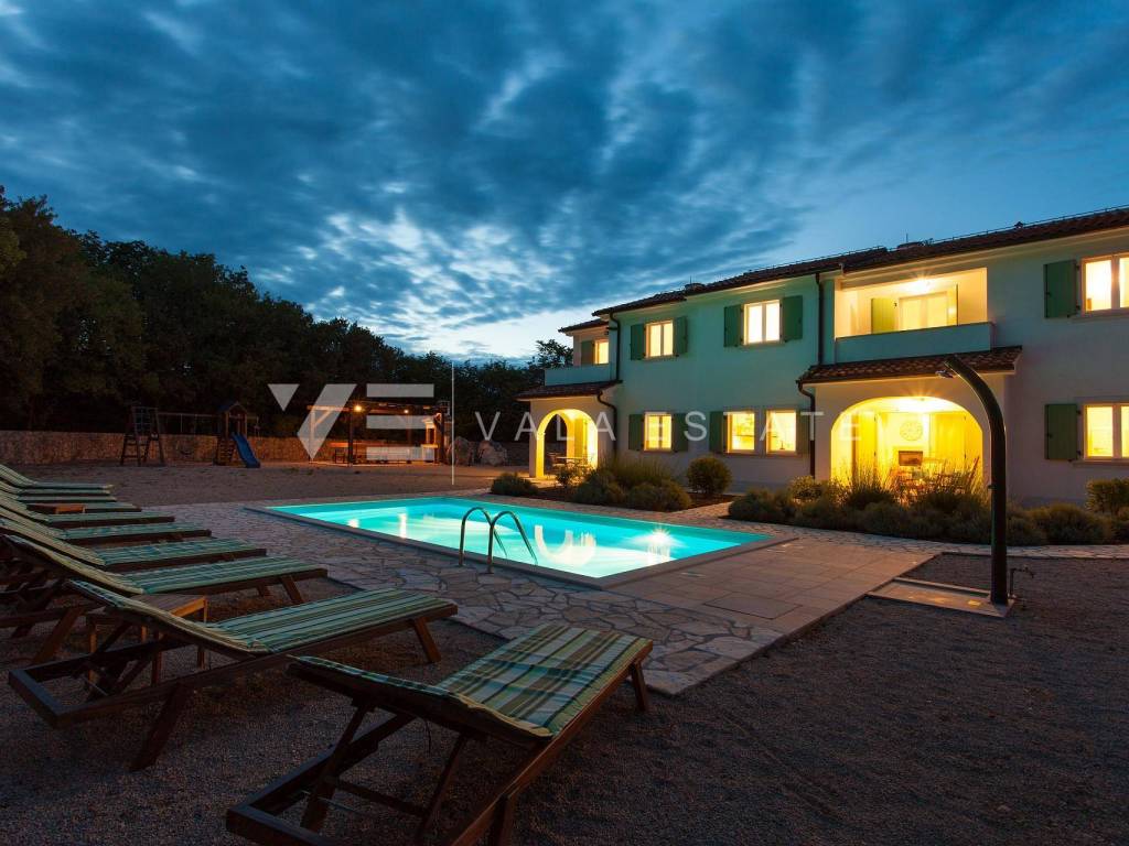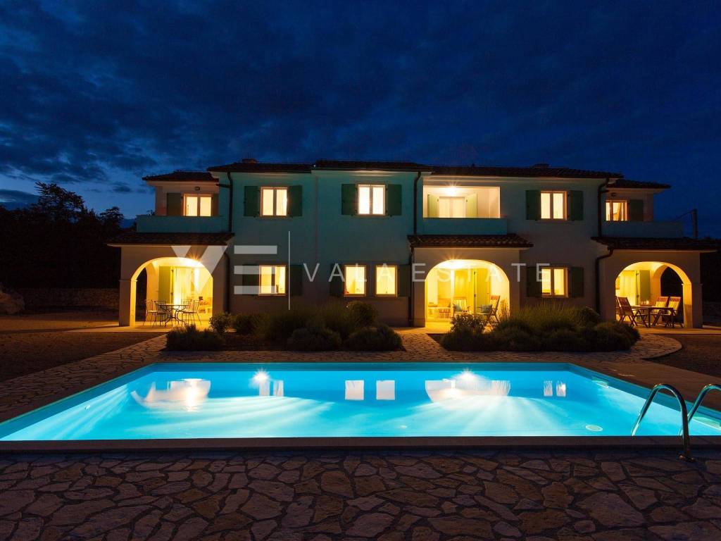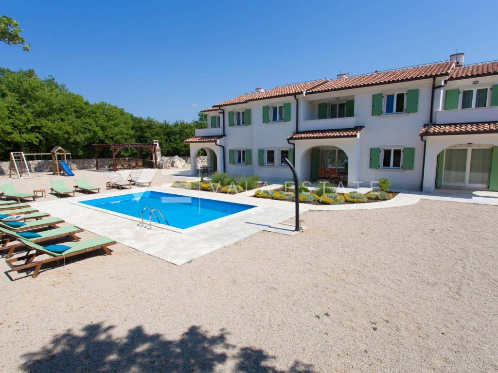 Real estate Krk island, Dobrinj surroundings - furnished villa of 232 m2 for sale, built on a plot of 1938 m2. The villa consists of ground floor and first floor and has three separate residential units. The ground floor of each unit has a living room and kitchen with dining area, toilet, storage room and a covered terrace. Upstairs are two bedrooms, bathroom and terrace. In the beautifully landscaped garden there is a swimming pool of 45 m2, barbecue area with gazebo and children's playground. Quality construction and equipment, air conditioning, the possibility of heating the fireplace in each residential unit, PVC windows with shutters and an extremely large garden, are just some of the advantages of this property. The garden is fully decorated and equipped with an automatic irrigation system. Beautiful, extremely quiet location on the edge of the green zone. Distance from the sea and all amenities is 5000 meters.