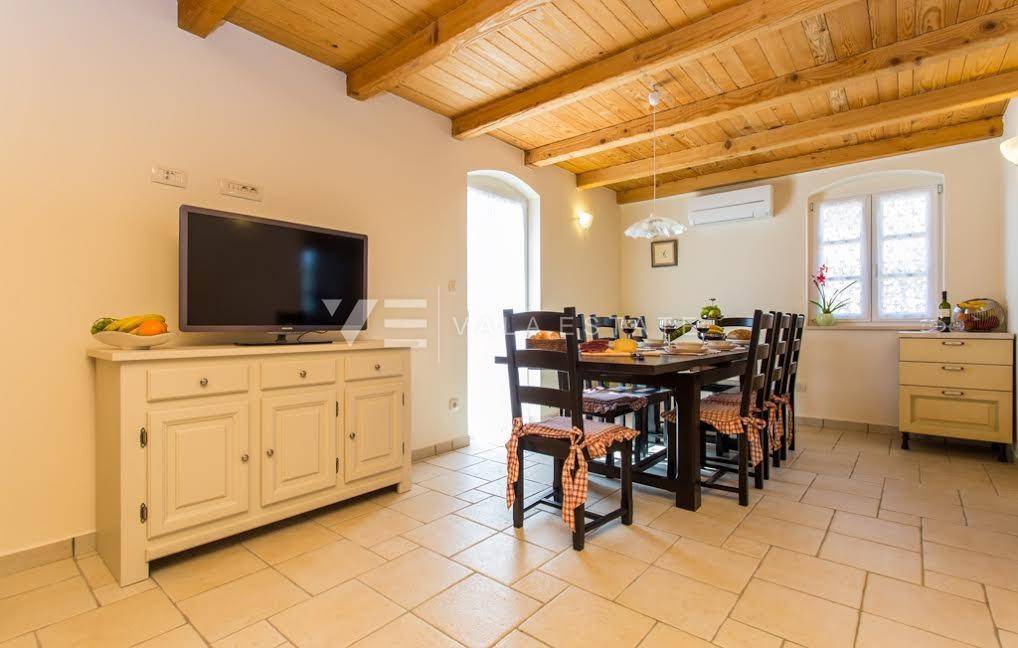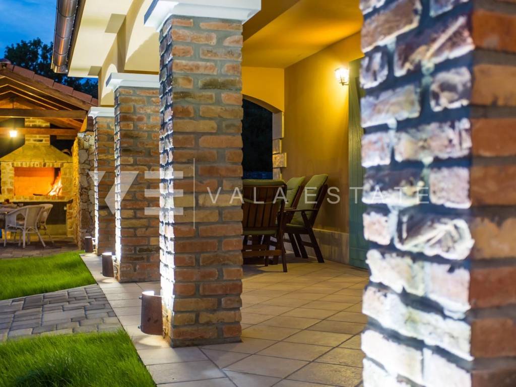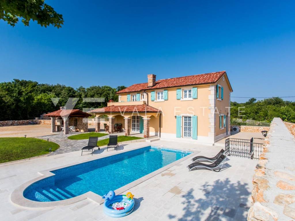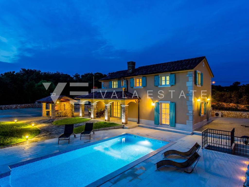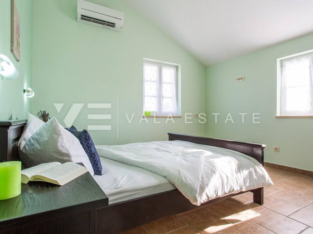 Real estate island of Krk, Dobrinj area - for sale is a newer detached house decorated in a charming Mediterranean style of 140 m2 spread over two floors. The ground floor has an entrance hall, living room with kitchen and dining area, toilet and large covered terrace, while the first floor has three bedrooms, one of which has access to the terrace and bathroom. The house is fully furnished and air conditioned. In front of the house there is a stone terrace, a garden with planted Mediterranean crops and a brick fireplace and a swimming pool with sun deck. There is also parking for four cars in the yard. The location is rural, for all lovers of a quiet holiday, but also a good opportunity to invest for the purposes of tourist rental.