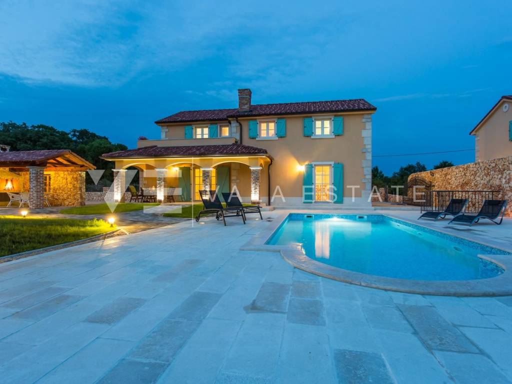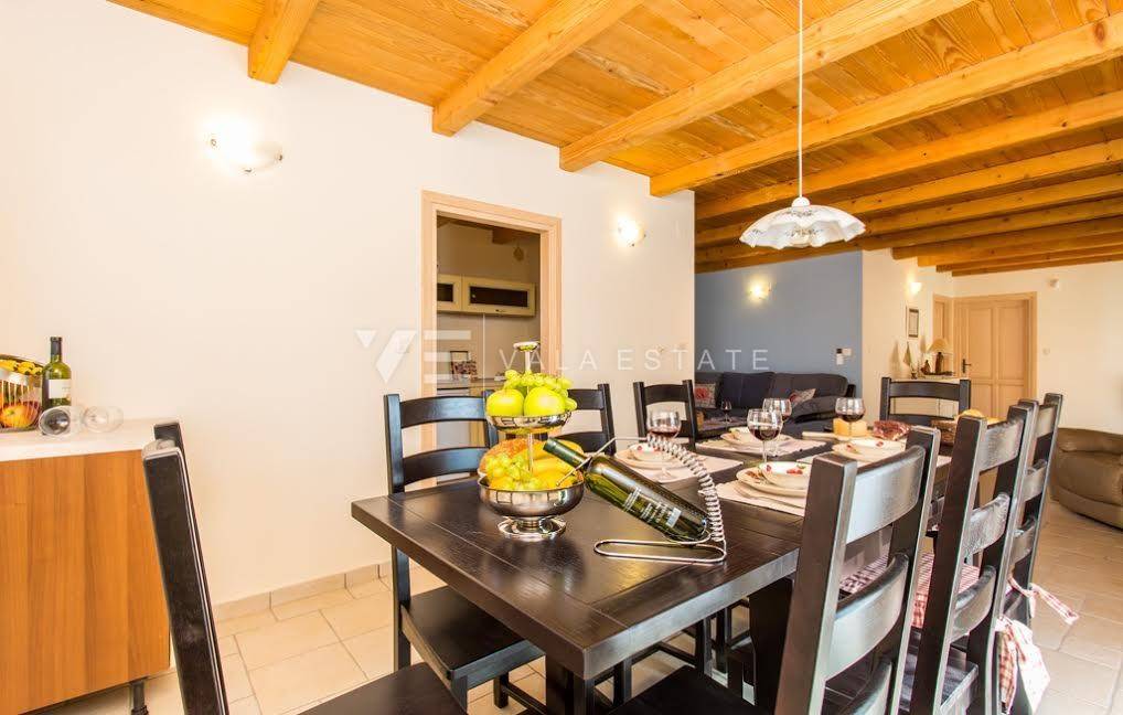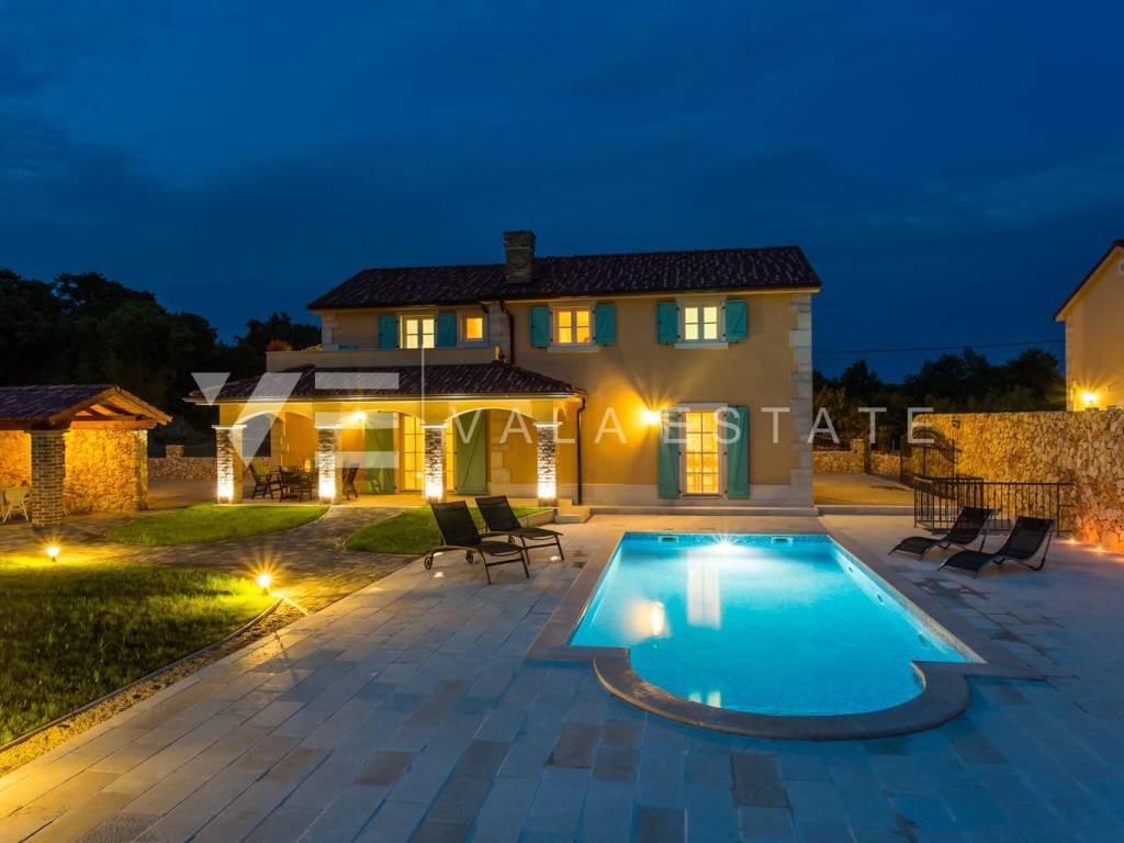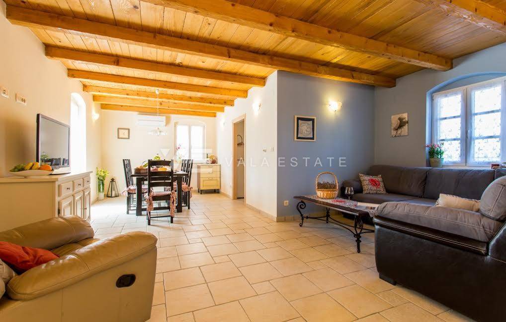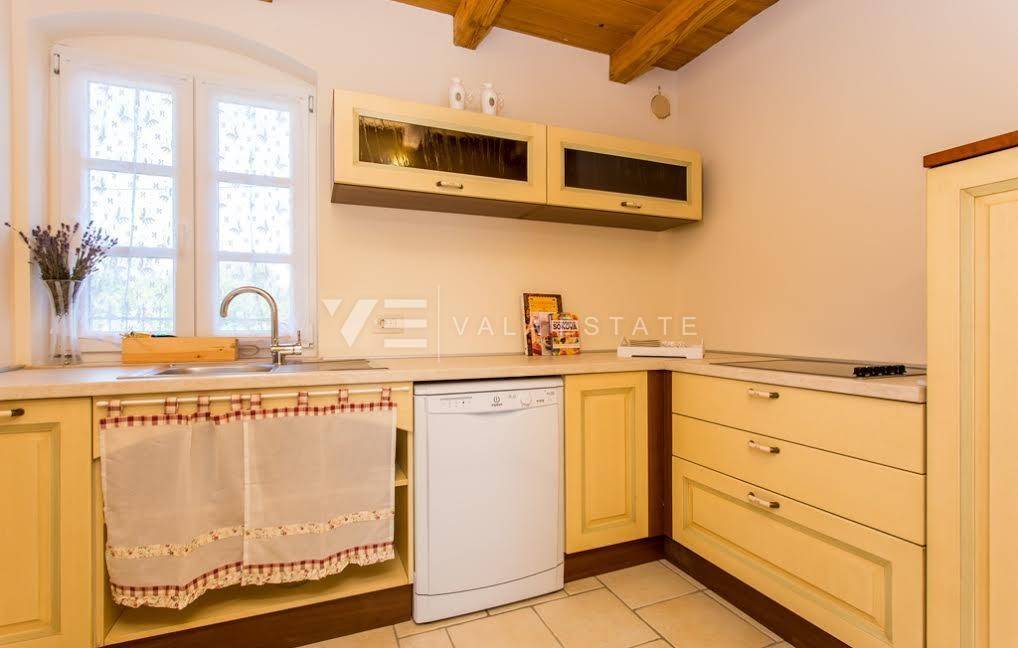 Real estate island of Krk, Dobrinj area - for sale is a newer detached house decorated in a charming Mediterranean style of 140 m2 spread over two floors. The ground floor has an entrance hall, living room with kitchen and dining area, toilet and large covered terrace, while the first floor has three bedrooms, one of which has access to the terrace and bathroom. The house is fully furnished and air conditioned. In front of the house there is a stone terrace, a garden with planted Mediterranean crops and a brick fireplace and a swimming pool with sun deck. There is also parking for four cars in the yard. The location is rural, for all lovers of a quiet holiday, but also a good opportunity to invest for the purposes of tourist rental.