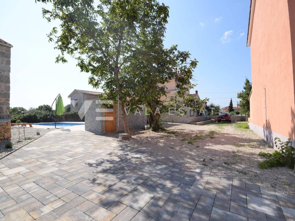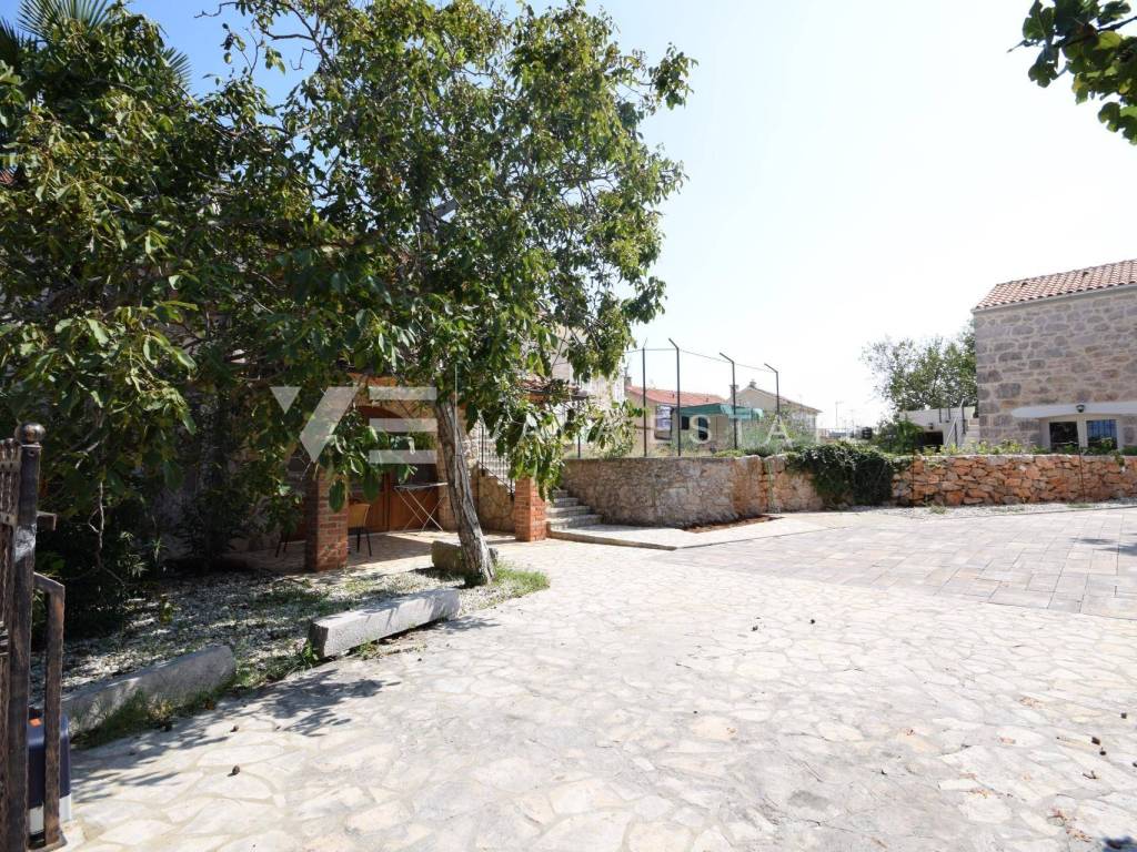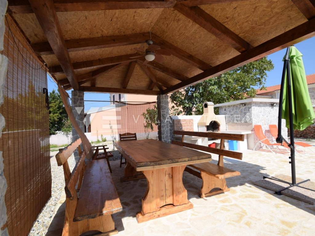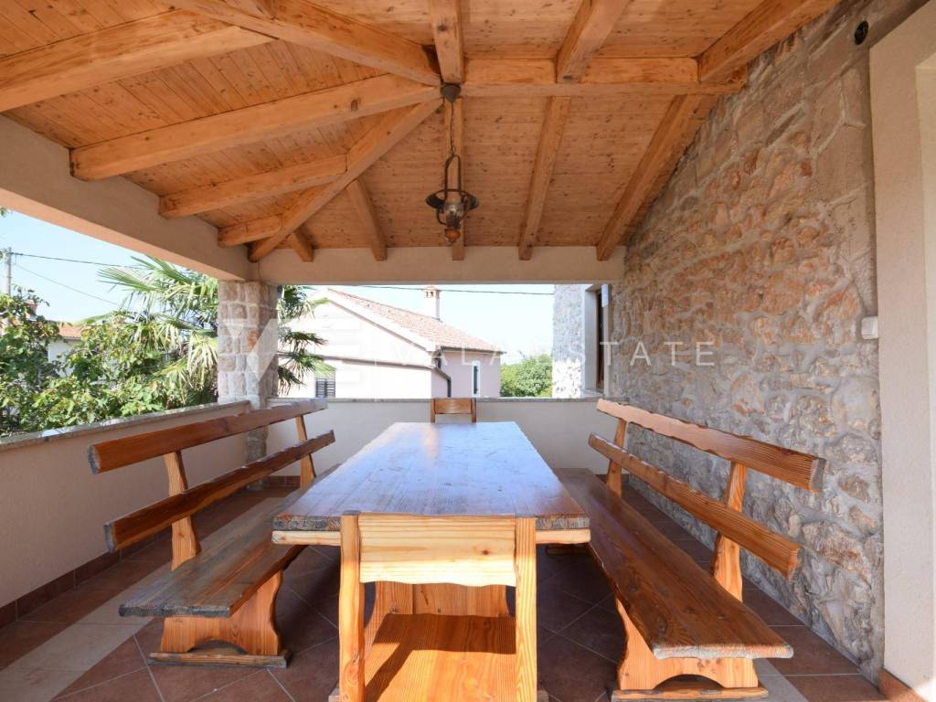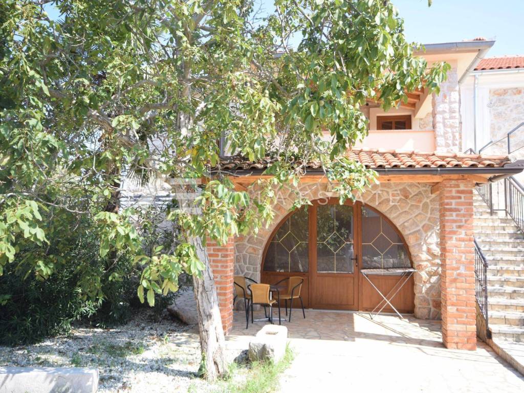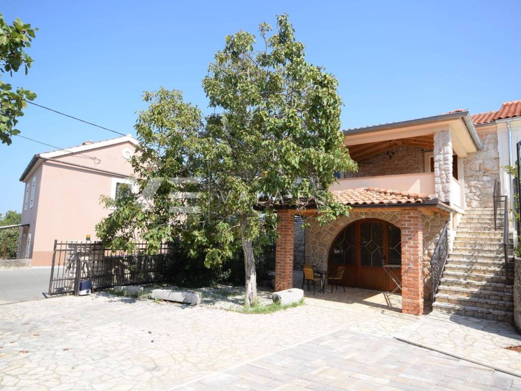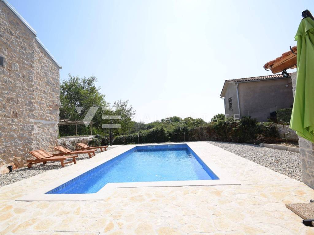 Real estate Dobrinj, surroundings - in a small village in the municipality of Dobrinj for sale a semi-detached stone house of 150 m2, with two separate residential units. On the ground floor, there is a two-bedroom apartment consisting of an entrance area, kitchen, dining and living room, one bathroom and two bedrooms. The external staircase leads to the first floor where there is another one-bedroom apartment with kitchen and dining area, bathroom and a nice covered terrace. The house is decorated in rustic style and with stone details, and on the garden of 836 m2, there is a spacious swimming pool, sunbathing area, covered arbor and summer kitchen with barbecue, engine room, and several parking spaces. Ideal for investment for tourist rent and personal stay, nice location, 3500 m from the sea.