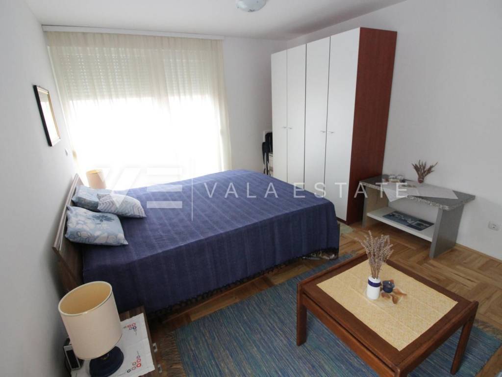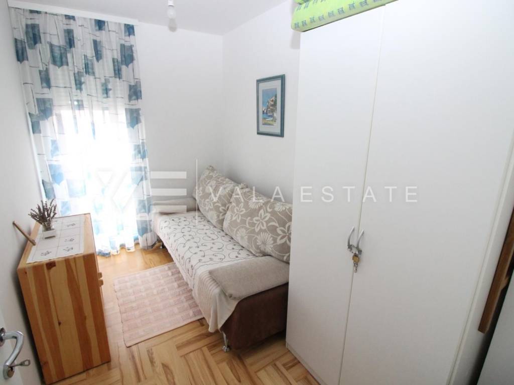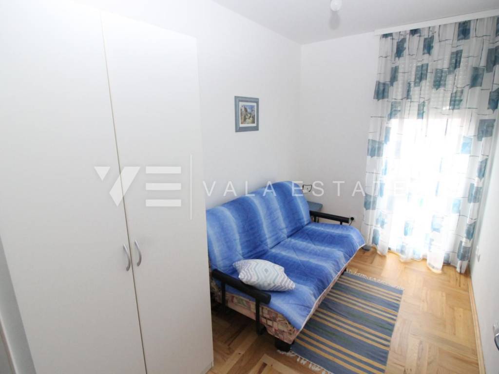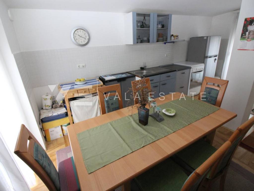 We have a duplex apartment located on the first floor and in the attic of an apartment house with 3 residential units. The apartment has 85,15 m2 and consists of three bedrooms, one bathroom, living room, kitchen, dining area and a balcony with a partial view of the sea. Quality construction, air conditioner, PVC joinery. The apartment has one parking space and a courtyard. 1000 m from the sea.