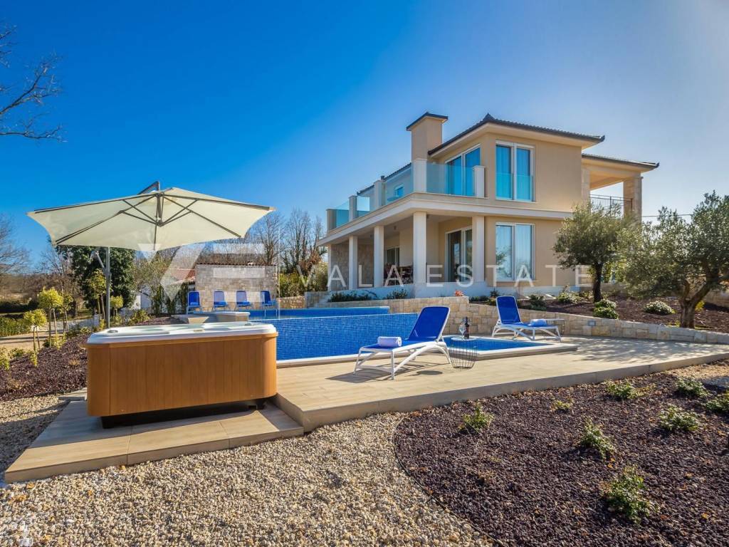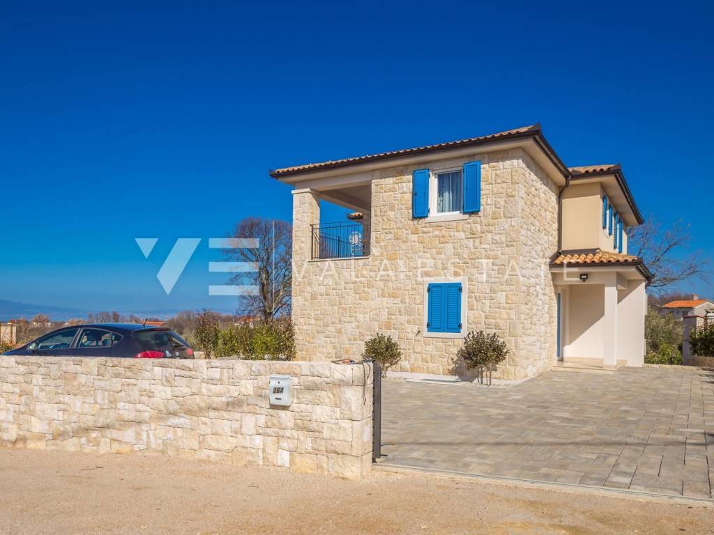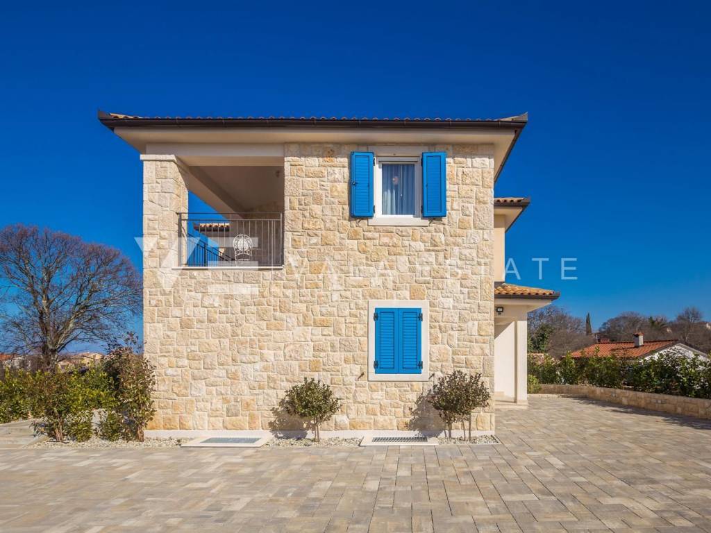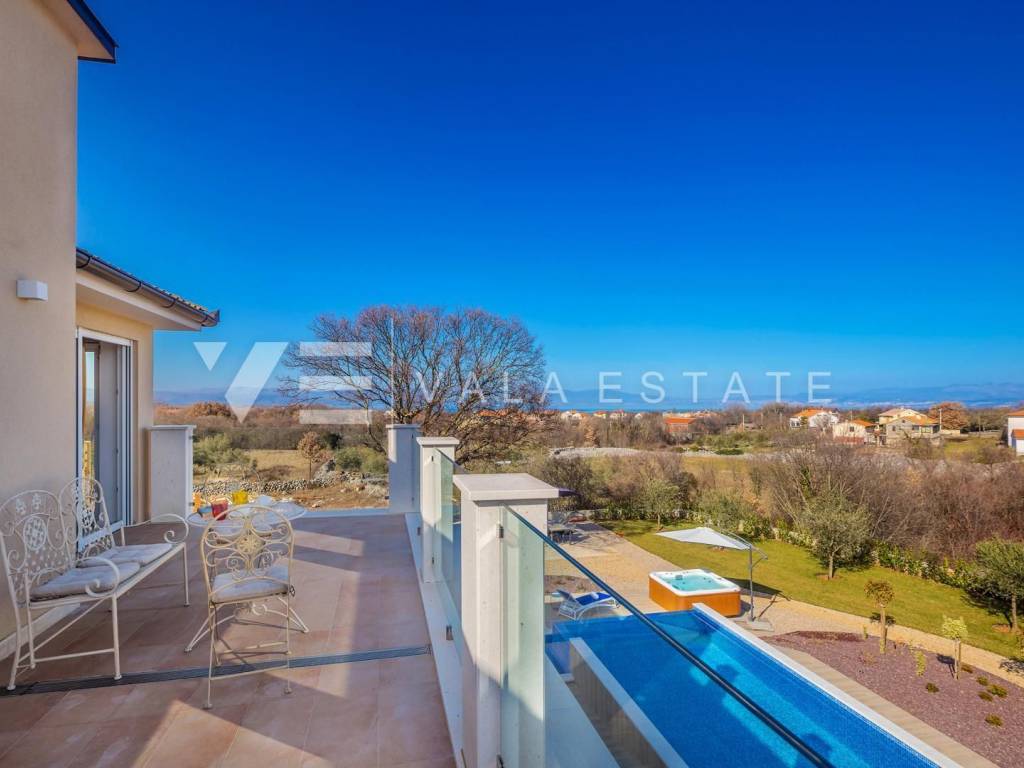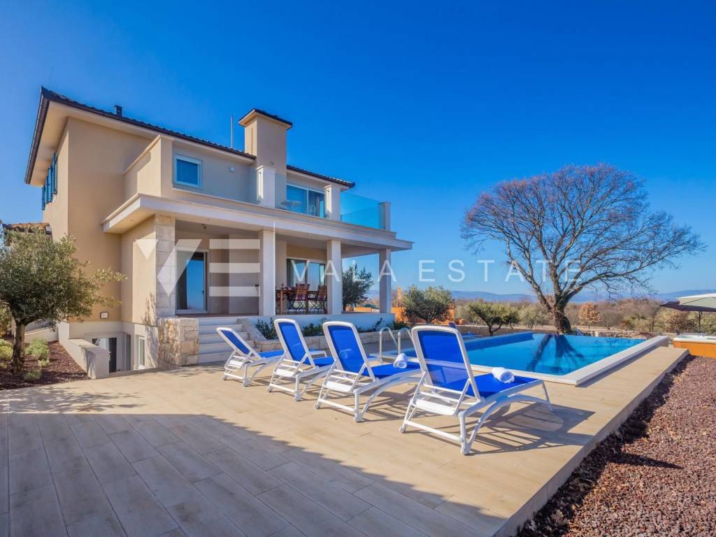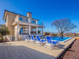 Real Estate Island of Krk, Malinska - new stone house for sale with 281 sqm built on a plot of 1289 sqm. The house consists of a basement, ground floor and first floor. On the ground floor, there is a spacious living room with a kitchen and dining area, one bedroom, toilette, one bathroom and a terrace. On the first floor, there are three bedrooms, two bathrooms, two balconies with panoramic sea view. The basement consists of a bathroom, engine room and two spacious rooms which can be designed into a wine cellar or fitness room. On the beautiful courtyard with olive groves, there are two connected swimming pools and a barbecue. The villa is completely furnished with furniture of high quality. Quality construction and equipment, fireplace, inverter air conditioner, floor heating in the bathrooms, PVC joinery with aluminum blinds. The house is covered with stone details. There are several parking spaces. Beautiful and peaceful location with beautiful sea views. 2000 m from the sea.
