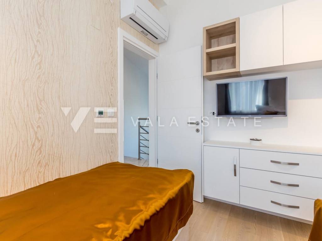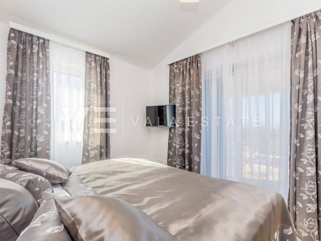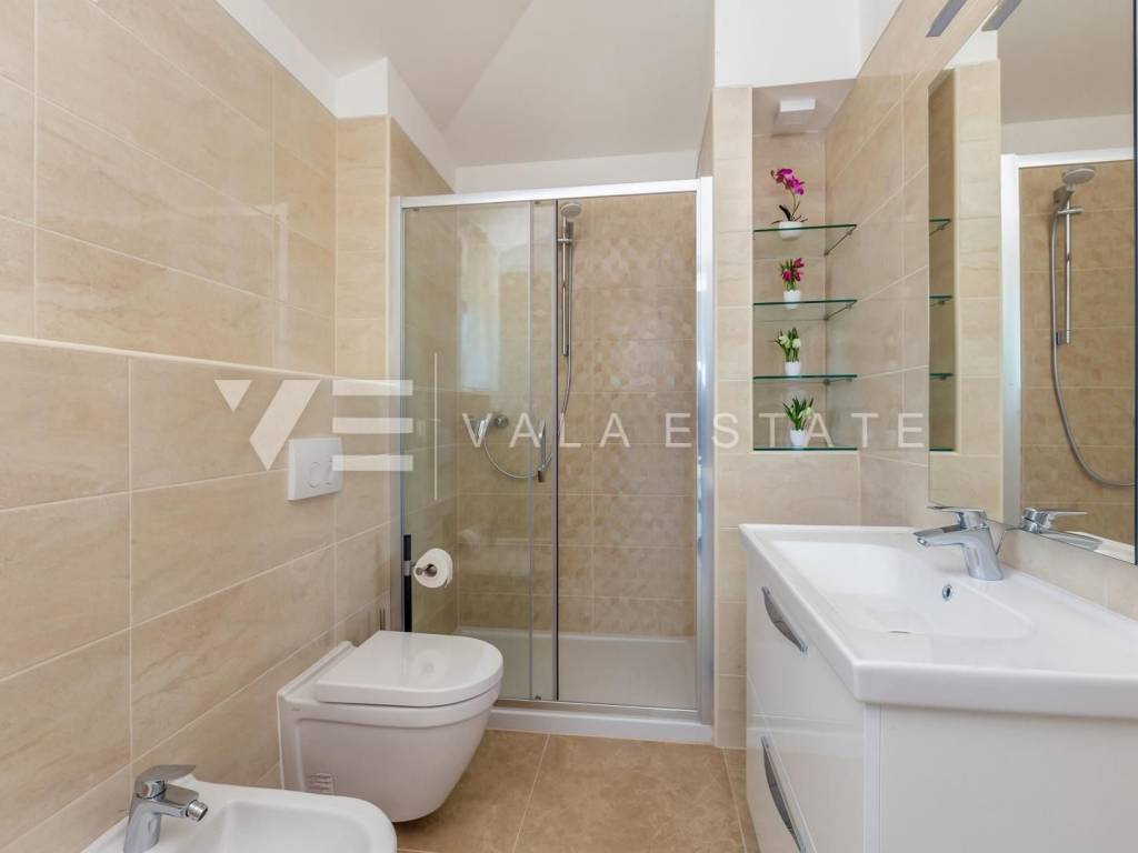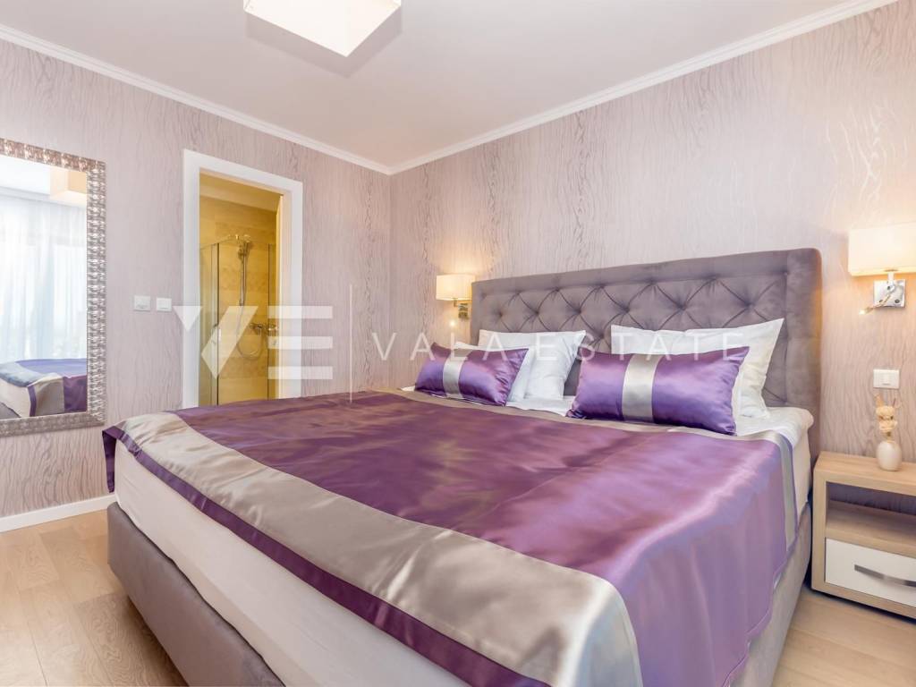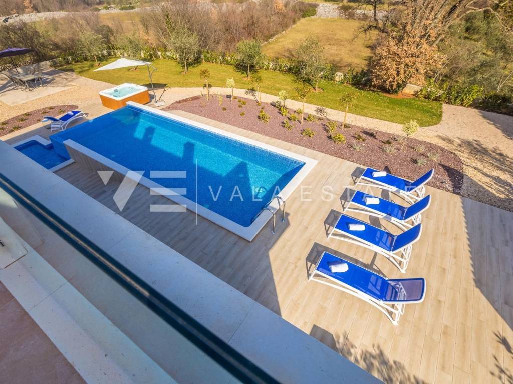 Real Estate Island of Krk, Malinska - new stone house for sale with 281 sqm built on a plot of 1289 sqm. The house consists of a basement, ground floor and first floor. On the ground floor, there is a spacious living room with a kitchen and dining area, one bedroom, toilette, one bathroom and a terrace. On the first floor, there are three bedrooms, two bathrooms, two balconies with panoramic sea view. The basement consists of a bathroom, engine room and two spacious rooms which can be designed into a wine cellar or fitness room. On the beautiful courtyard with olive groves, there are two connected swimming pools and a barbecue. The villa is completely furnished with furniture of high quality. Quality construction and equipment, fireplace, inverter air conditioner, floor heating in the bathrooms, PVC joinery with aluminum blinds. The house is covered with stone details. There are several parking spaces. Beautiful and peaceful location with beautiful sea views. 2000 m from the sea.