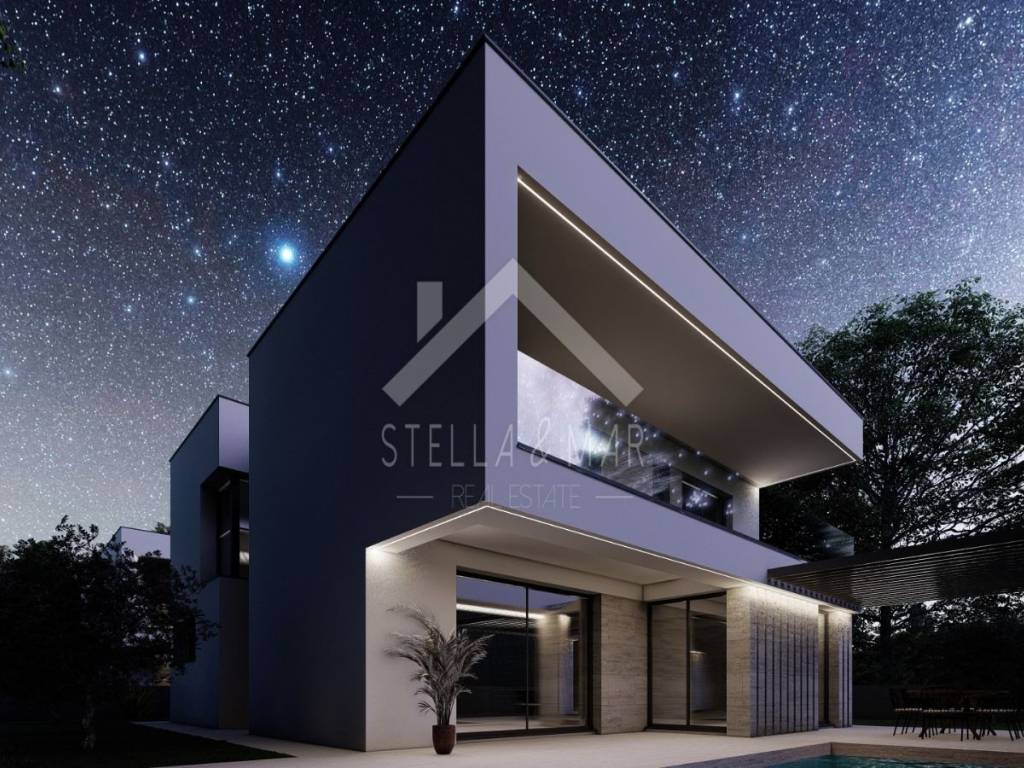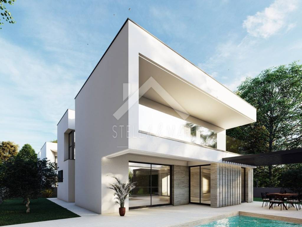 Villa with swimming pool for sale in Privlaka, close to Nin and Zadar. The building is being built on a plot of land with an area of 401 m2, with a living area of 180 m2. It is modernly designed and built according to high construction standards (insulation, PVC joinery, central heating...). On the ground floor of the building there is a kitchen with a dining room and an open living room, an exit to the terrace and a yard where there is a swimming pool. Furthermore, the ground floor has a bathroom, a laundry room and a garage. An internal staircase leads to the building where there are 4 bedrooms, each with its own bathroom and a comfortable terrace with a view of the sea.