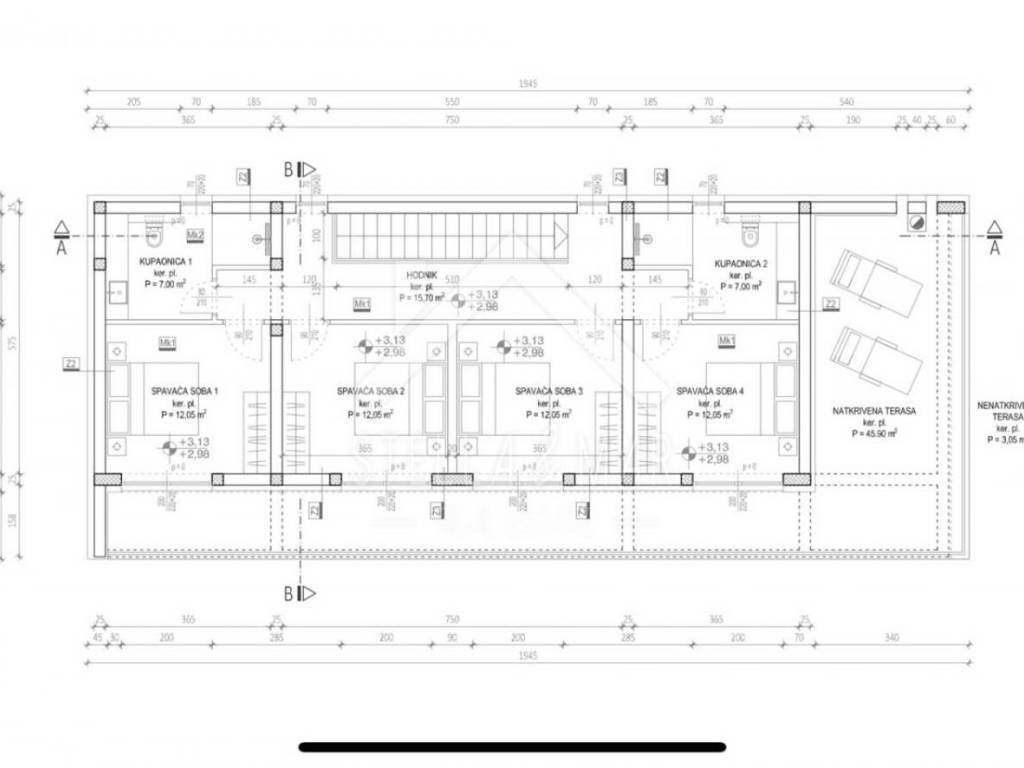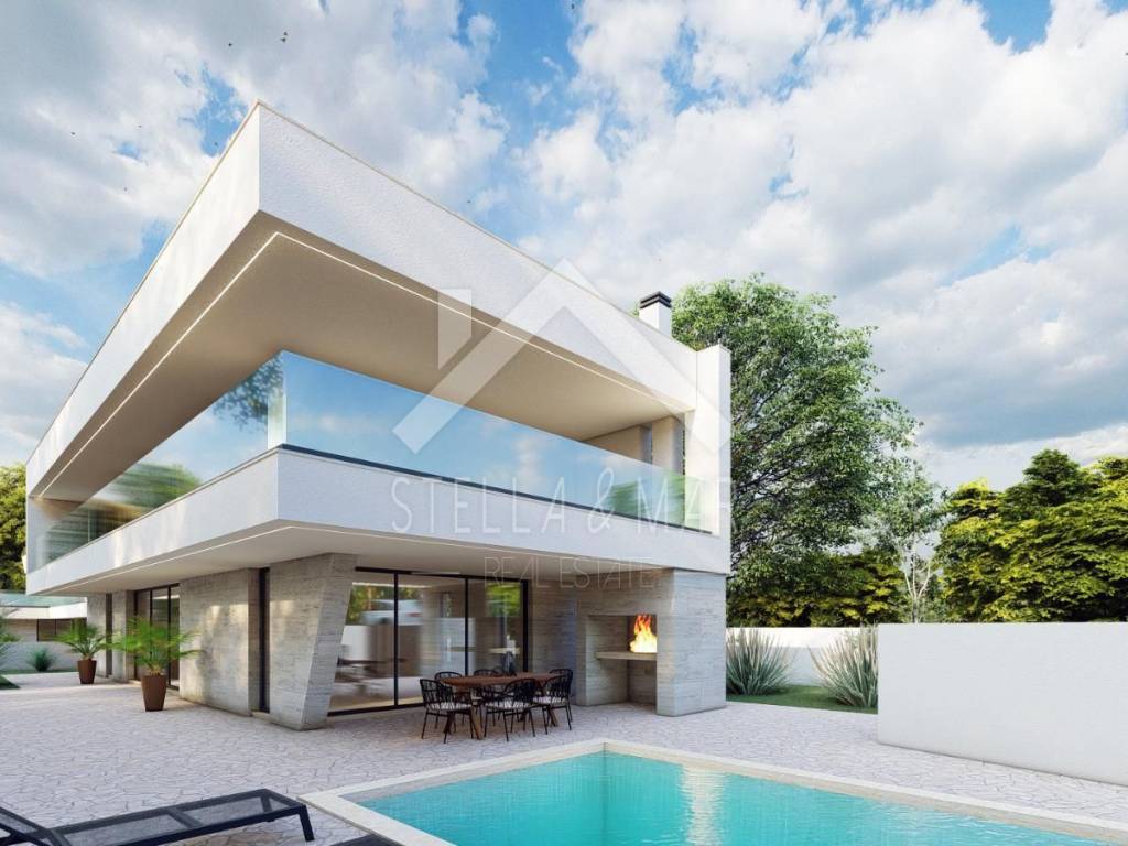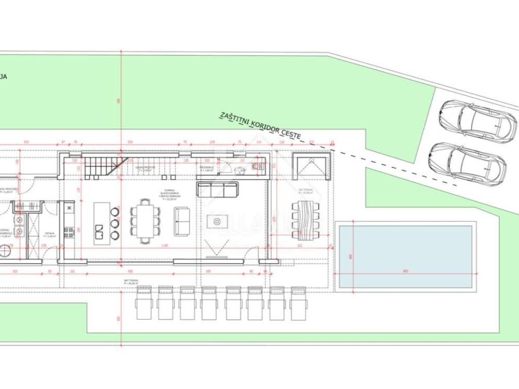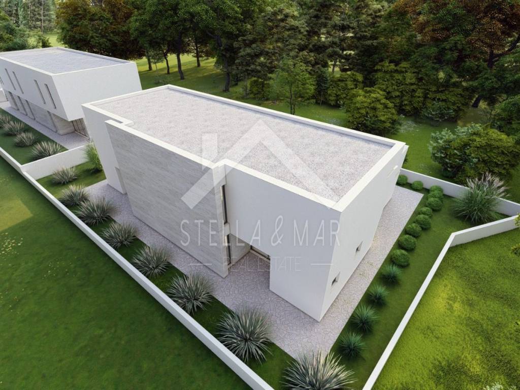 Kuća je koncipirana kao dvoetažni stan. U prizemlju se nalazi kuhinja sa blagavaonicom, dnevni boravak, terasa, natkrivena terasa, hodnik, wc, ostava, vešeraj i strojarnica. Na katu se nalaze četiri spavaće sobe od toga jedna sa vlastitom kupaonom, kupaona, hodnik i natkrivena terasa. U dvorištu se nalaze dva parkirna mjesta te bazen 8 x 4m.