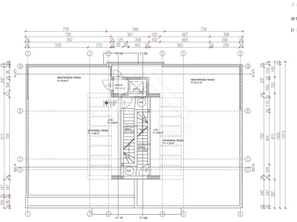 The apartment has 2 parking spaces with an area of 28.60 m2 and a loggia and covered terrace with an area of 37.64 m2, which can be accessed from the apartment. It also has a roof terrace with a swimming pool - the uncovered part of the terrace is 91.50m2, the covered part is 17.93m2 and the loggia is 5.88m2. The area of the apartment is 76.78 m2 without terrace and parking, and the same are calculated in the total square footage according to the corresponding coefficient. So, the total area is 98.36m2 + roof terrace 36.24m2 + parking 7.15m2. In the floor plan, the apartment is marked APARTMENT 8.