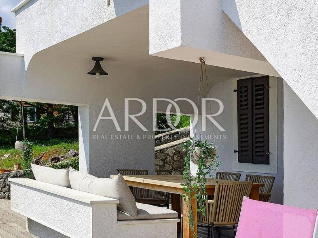 The beautiful main living room is connected to the spacious dining room and kitchen, while the entire space has an unobstructed view of the Kvarner Bay, and from the dining room you can exit to a charming balcony where the view is breathtaking. From the beautifully decorated and fully equipped kitchen you can exit to the terrace with a swimming pool. In addition to this, there is another living room with a kitchen and dining room, which ensures functionality and convenience in everyday life.