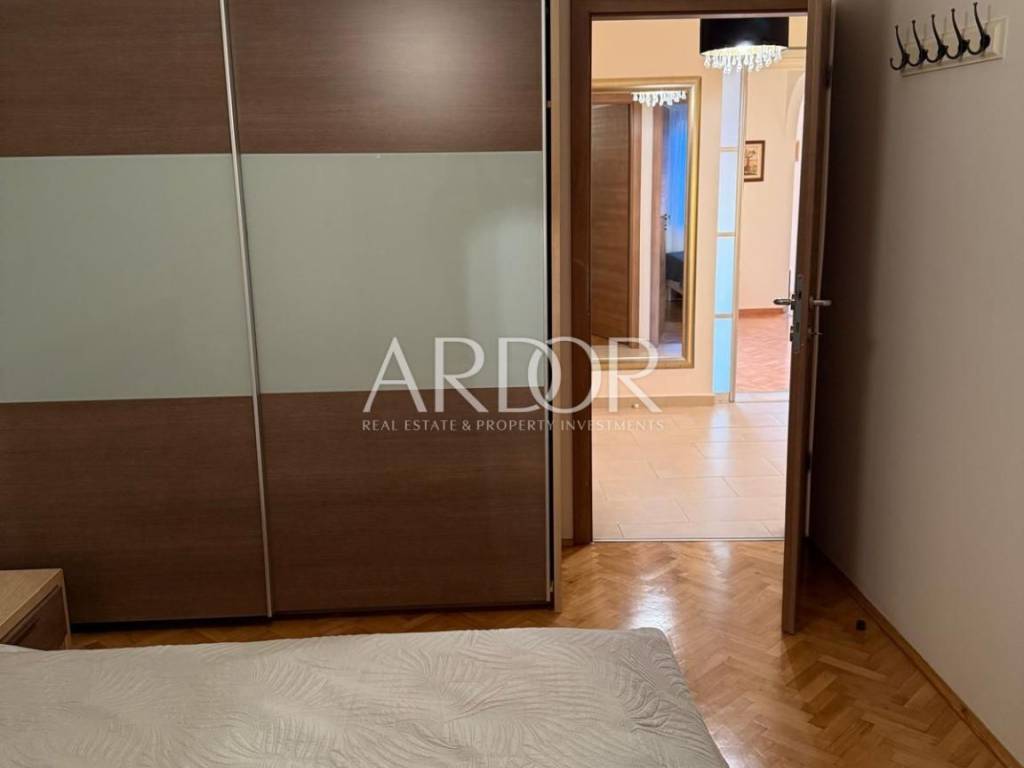 Kostrena, a modern, fully furnished apartment for rent, located in the basement, but due to the building's configuration, it feels like it is on the first floor. The apartment consists of a hallway, two bedrooms, a kitchen with a dining area and living room, a bathroom, and three balconies with a sea view.