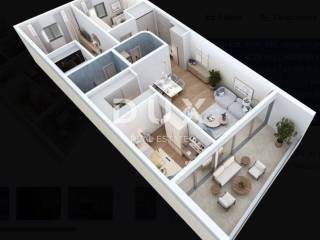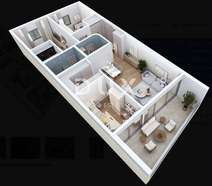 Beautiful floor on the second floor, apartment S14, total area 129.30 m2. It consists of an entrance hall (13.26 m2), open-concept kitchen, dining room and living room (46.55 m2) with access to a 17.95 m2 balcony with a beautiful sea view, three bedrooms, one of which is larger (18.41 m2) with a private bathroom (3.56 m2), two smaller rooms (12.82 and 12.36 m2) and a bathroom (4.39 m2). The apartment also has two parking spaces no. 49 (16.35 m2) and 50 (13.41 m2), and storage room no. 15 with an area of 3.21 m2. The construction year is 2024, and the planned completion year is 2025. The expected move-in date is December 2025.