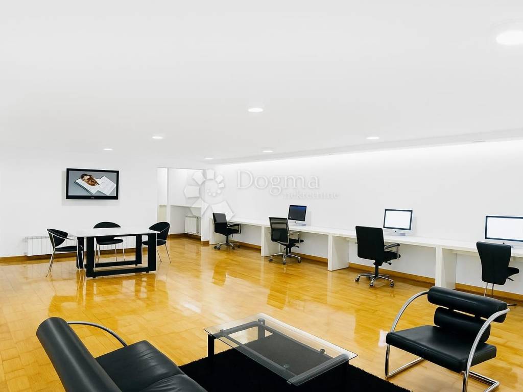 Prostor na prvom katu (118,98 m) nudi više prostorija koje se mogu prilagoditi različitim namjenama. Prostor je opremljen alarmom, video nadzorom i protuprovalnim vratima, a izuzetna zvučna izolacija osigurava mir i tišinu unatoč položaju uz prometnu ulicu. U prostoru se nalazi pianino i vrhunski audio sustav. Dva otvorena parkirna mjesta nalaze se neposredno iza zgrade. Iz prostorija se pruža pogled na glavnu ulicu i mirno dvorište s dodatnim parkiralištem.