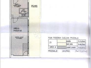 Prizemni prostor (53,87 m) sastoji se od prijemnog prostora, hodnika, uredskog prostora, predprostora i sanitarnog čvora. Prostor ima dva ulaza poseban ulaz s ulice te dodatni ulaz sa stražnje strane kroz haustor. Veliki izlog od 20 m osigurava izvrsnu vidljivost prema prometnoj ulici, a bočni prozori pružaju obilje prirodnog svjetla. Prostor je prilagođen osobama s invaliditetom te uključuje vlastito parkirno mjesto od 11 m. Održavan i kvalitetno uređen, trenutno je dugoročno iznajmljen pouzdanim najmoprimcima, s mogućnošću preuzimanja ugovora.