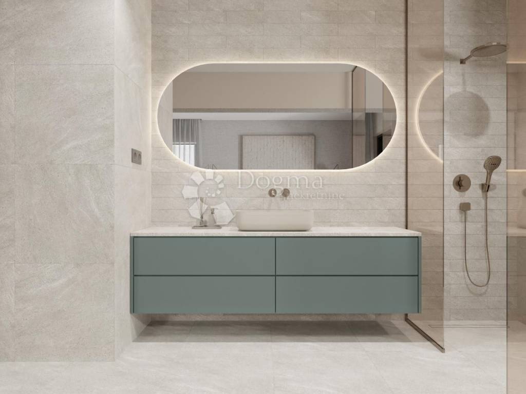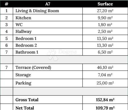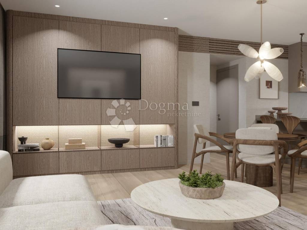 With 109.79 m of net living area, the apartment includes two spacious bedrooms, a bathroom, an additional WC, a kitchen, and a bright living and dining area. But what truly makes it special is the seamless flow between indoors and outdoors, creating space for long summer evenings, candlelit dinners, and quiet moments accompanied by the distant sound of the sea.