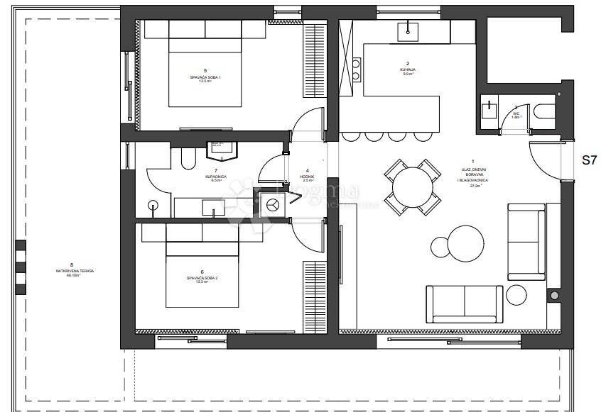 In Zaton, just fifty meters from the sea, every apartment in this new residence has its own story. While the ground floors enjoy private gardens and the top floors boast rooftop terraces with sea views, Apartment A7 found its charm in a grand covered terrace of 46 m. Its not just a terrace its an outdoor living room, a summer dining space, and a lounge under the sky.