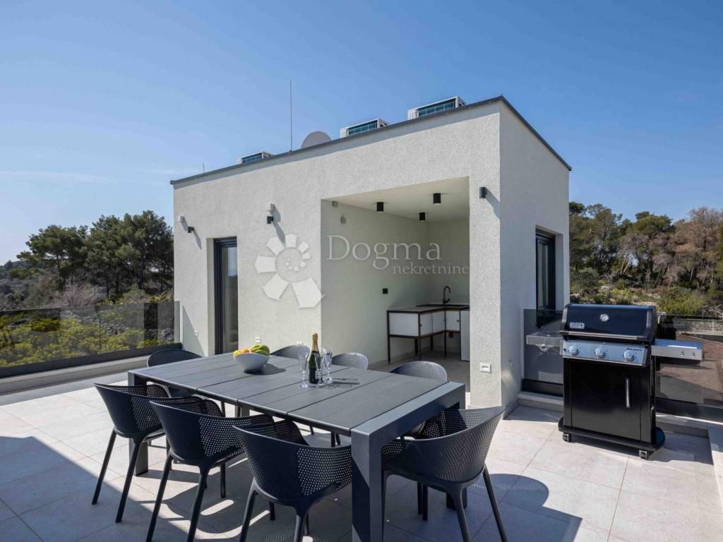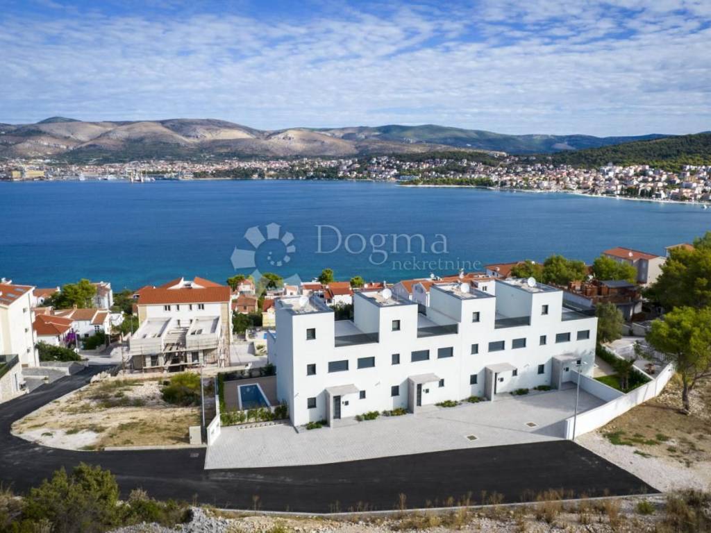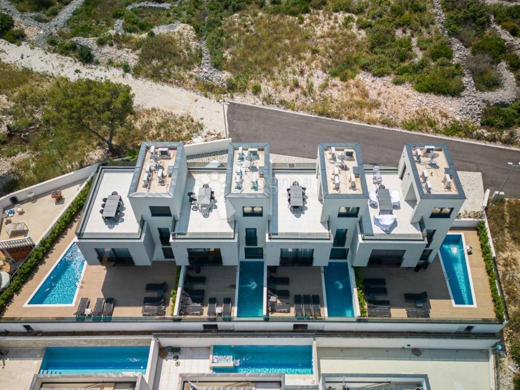 A luxurious villa is for sale in an extremely attractive location on the island of Čiovo. The villa is located on an elevated position, which provides a beautiful panoramic view of the sea. It extends over three floors. The ground floor has an entrance hall, a spacious open-space that combines the kitchen, dining room and living room, and a guest toilet. Large glass walls provide plenty of natural light and connect the interior with the outdoor area where the pool and sundeck are located. An internal staircase leads to the first floor, where three bedrooms are located. The master bedroom has its own bathroom, while two additional bedrooms share a modern bathroom. On the second floor there is a covered summer kitchen, toilet and a spacious uncovered terrace ideal for relaxing with spectacular sunsets and a beautiful view of the sea. The villa includes a swimming pool with a sundeck, a barbecue area and a beautifully landscaped garden with indigenous Mediterranean plants. Parking is provided for several vehicles, and the entire property is equipped with video surveillance for additional security. All necessary facilities are located in the immediate vicinity, while the international airport is only 10 km away. There are four villas in a row available: Villa 1: living area 108.53 m + terrace 213.26 m 650,000 Villa 2: living area 109.75 m + terrace 130 m 600,000 Villa 3: living area 108.53 m + terrace 111.31 m 600,000 Villa 4: living area 108.53 m + terrace 226.68 m 650,000 The seller is a legal entity, and VAT is not included in the listed prices. There is an option to purchase the entire complex as a package!