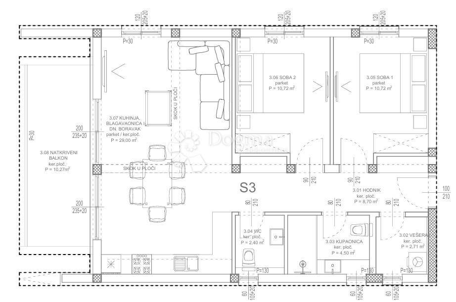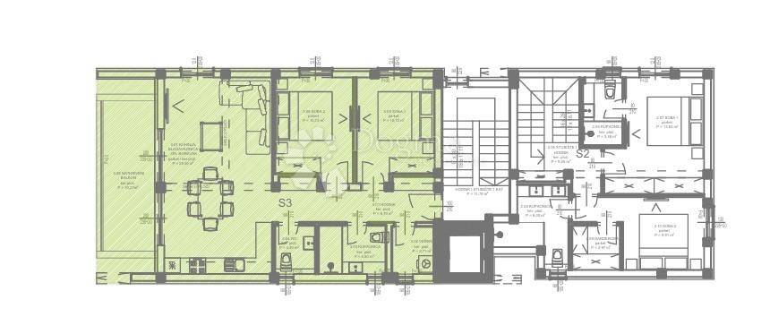 Apartment S3 is located on the 1st floor. It consists of: hallway, kitchen, dining room, living room, two bedrooms, bathroom, guest toilet, and laundry room.