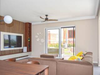 The apartment is spread over the ground floor and first floor. On the ground floor, a spacious open-plan living area features a kitchen, dining room, and living room, with direct access to the landscaped terrace and pool. Large glass walls provide abundant natural light and a seamless connection to the outdoor area. The same level includes one bedroom with an en-suite bathroom, a guest toilet, and a practical storage/laundry room.